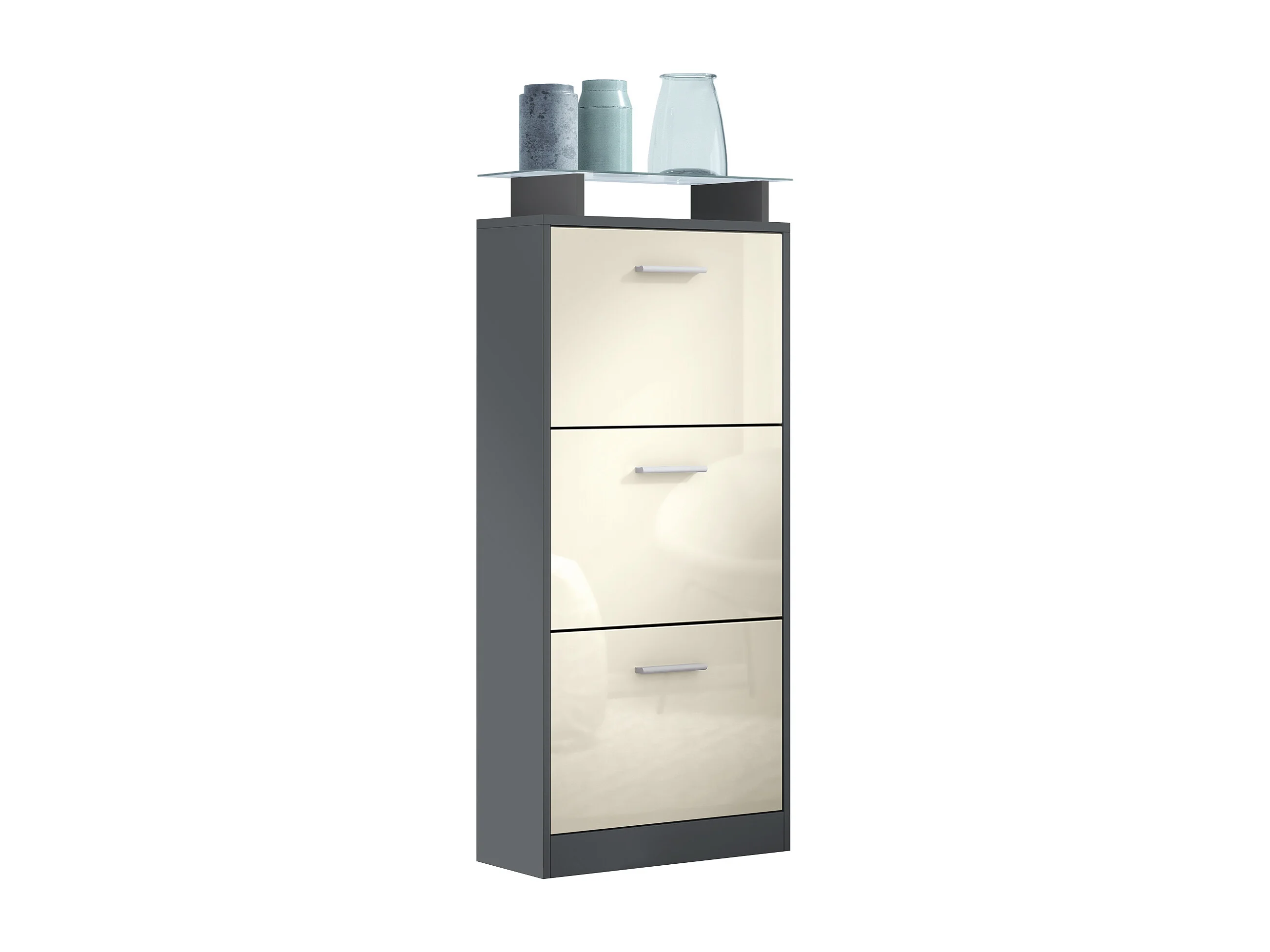 Meuble à Chaussures Lavia V2, Range-Chaussures pour 12 Paires avec 3 Abattants et Étagère en Verre, anthracite mat/crème haute brillance (46 x 128 x 23 cm)