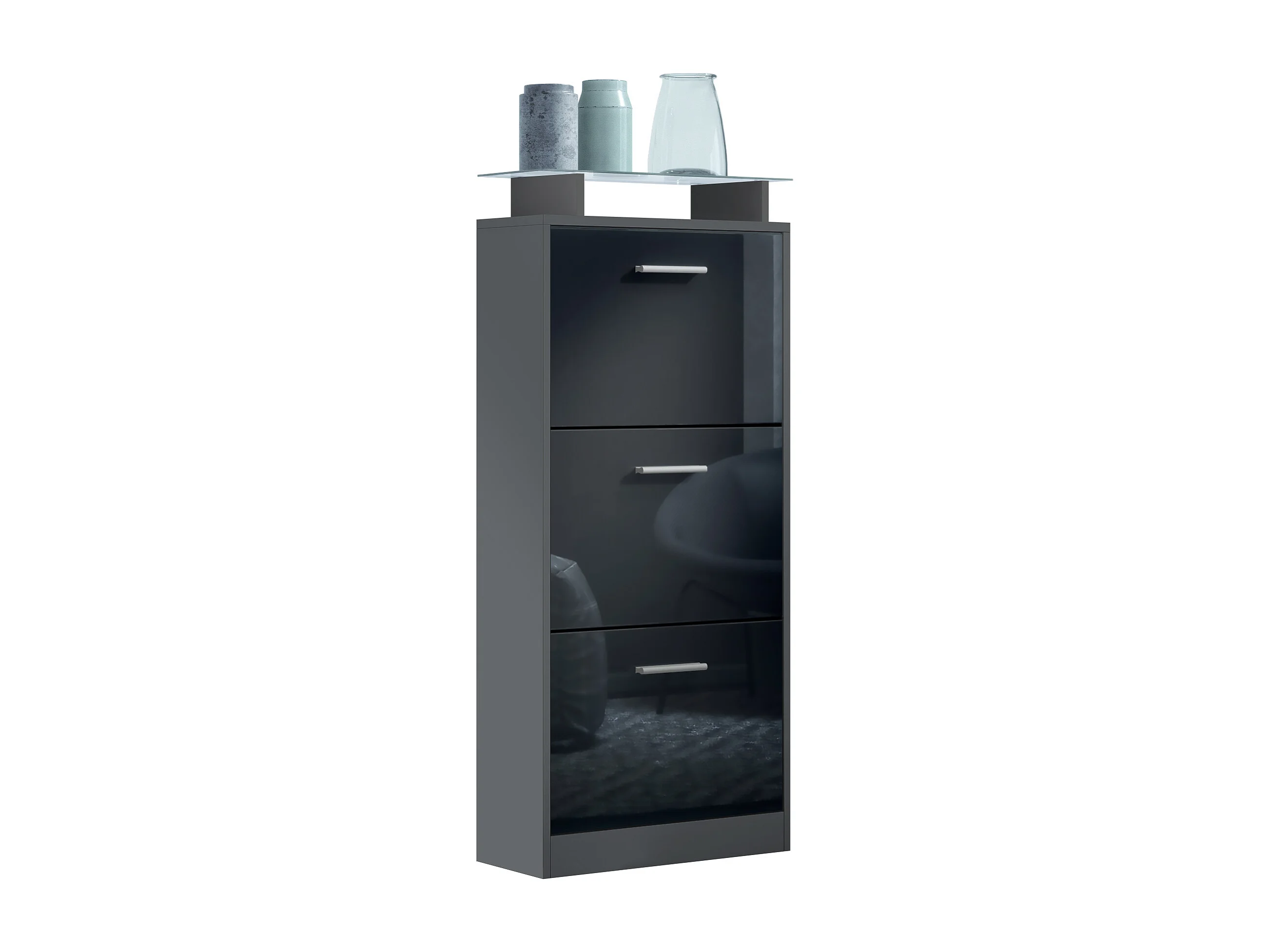 Meuble à Chaussures Lavia V2, Range-Chaussures pour 12 Paires avec 3 Abattants et Étagère en Verre, anthracite mat/noir haute brillance (46 x 128 x 23 cm)