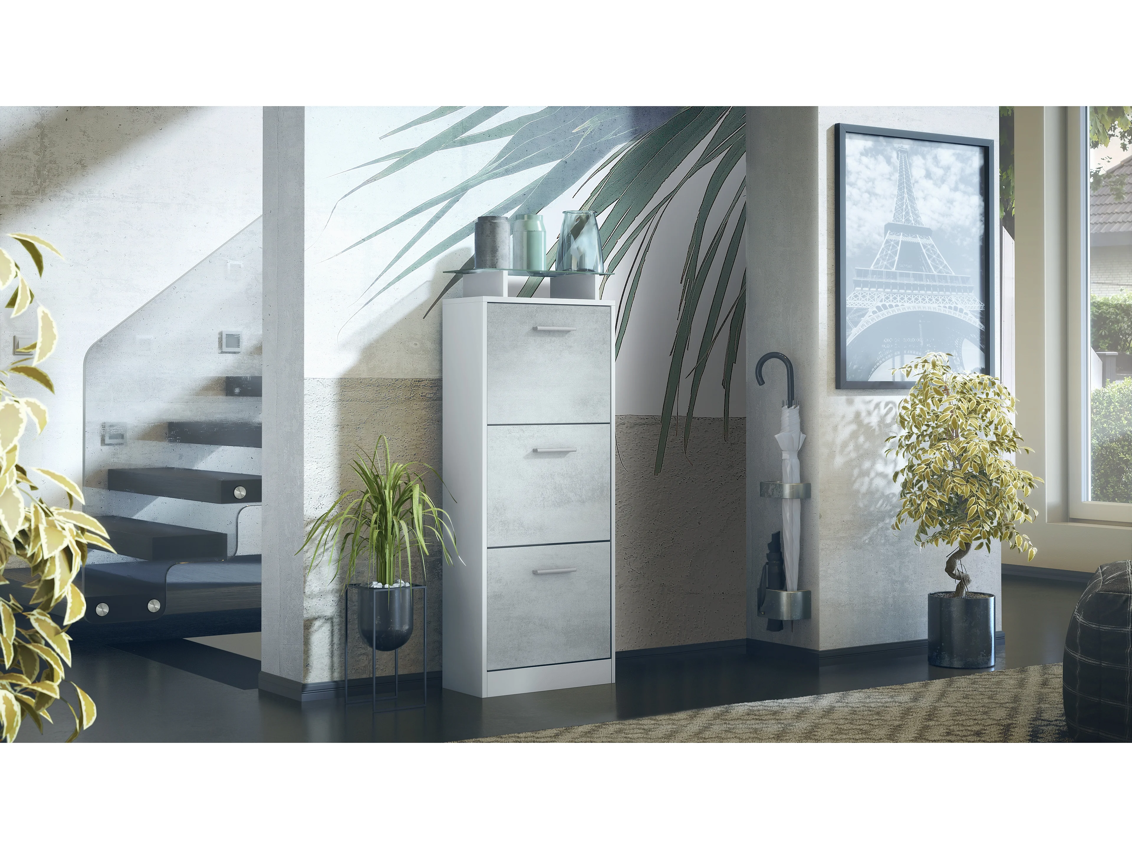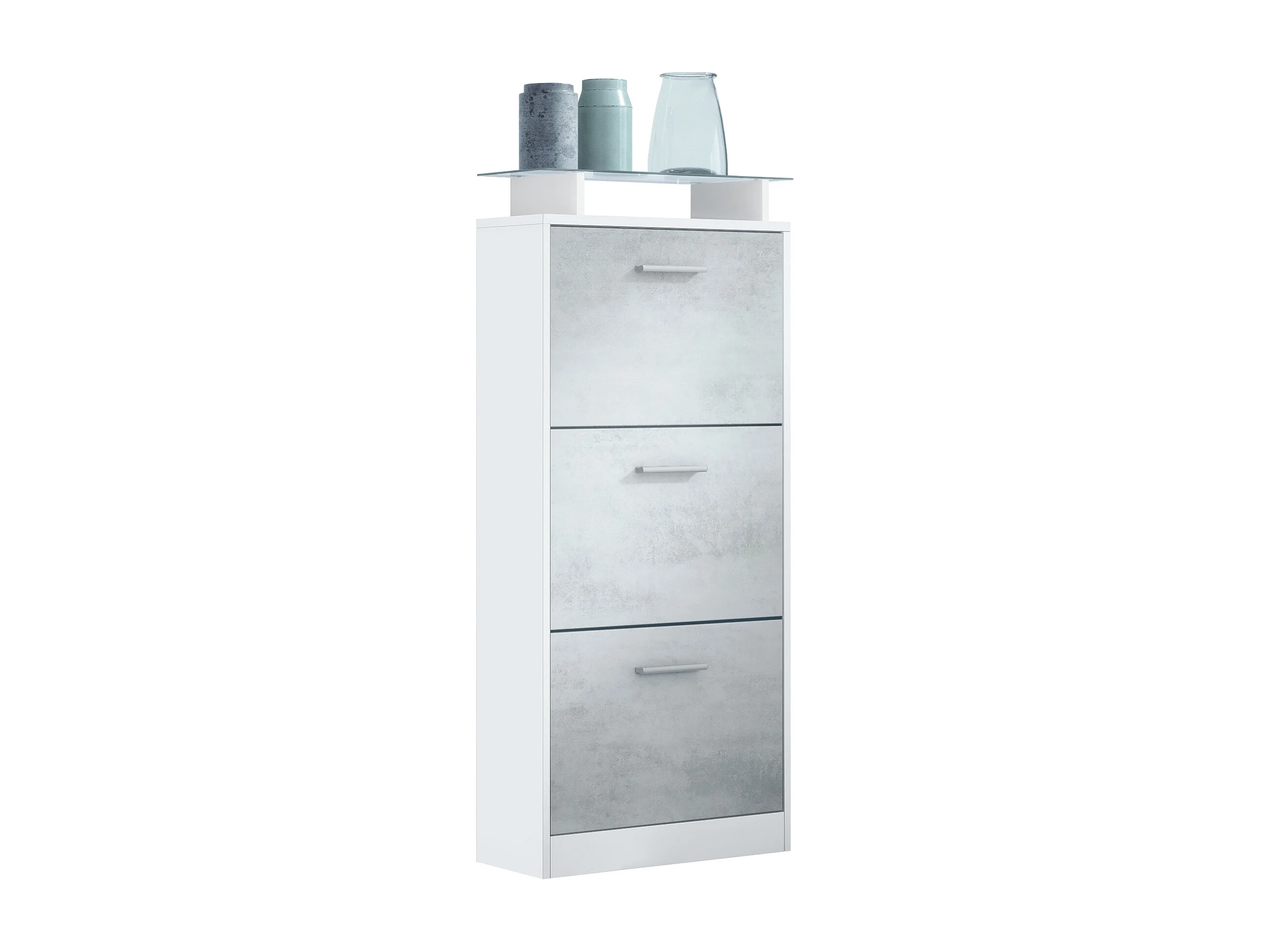 Meuble à Chaussures Lavia V2, Range-Chaussures pour 12 Paires avec 3 Abattants et Étagère en Verre, blanc mat/aspect béton oxyde (46 x 128 x 23 cm)