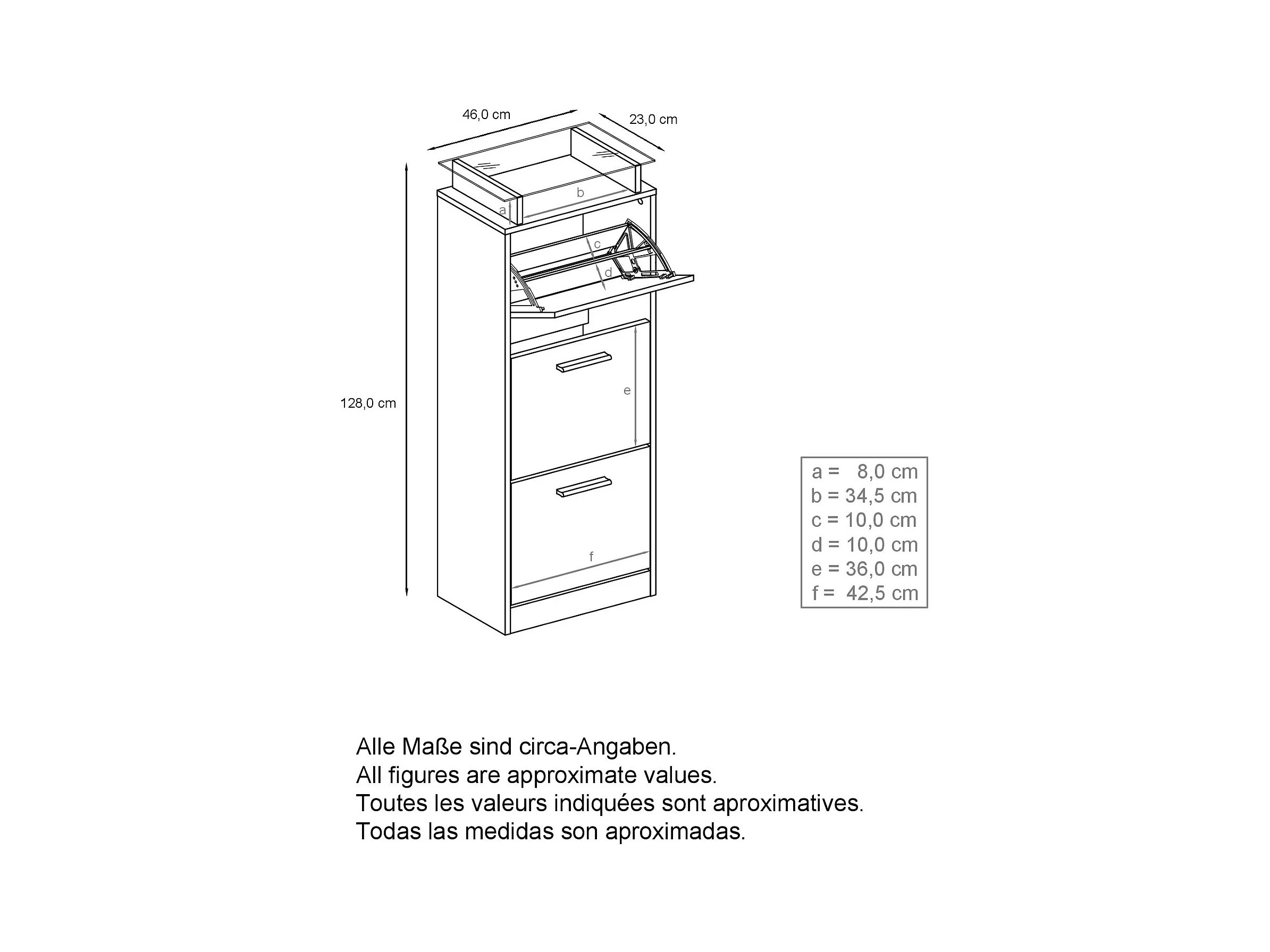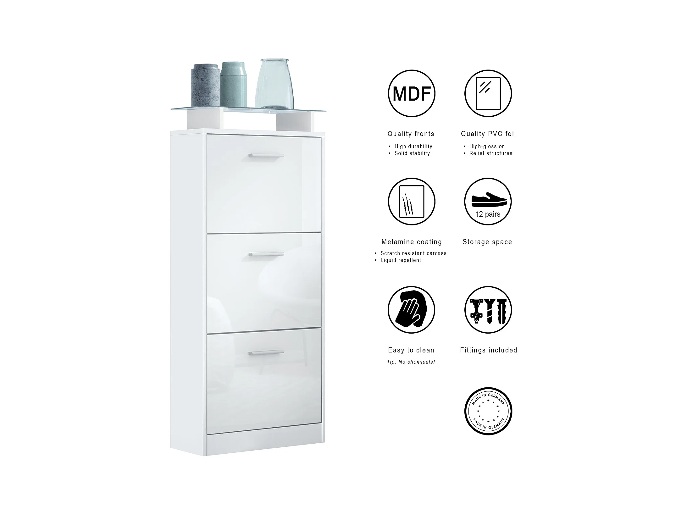 Meuble à Chaussures Lavia V2, Range-Chaussures pour 12 Paires avec 3 Abattants et Étagère en Verre, blanc mat/blanc mat (46 x 128 x 23 cm)