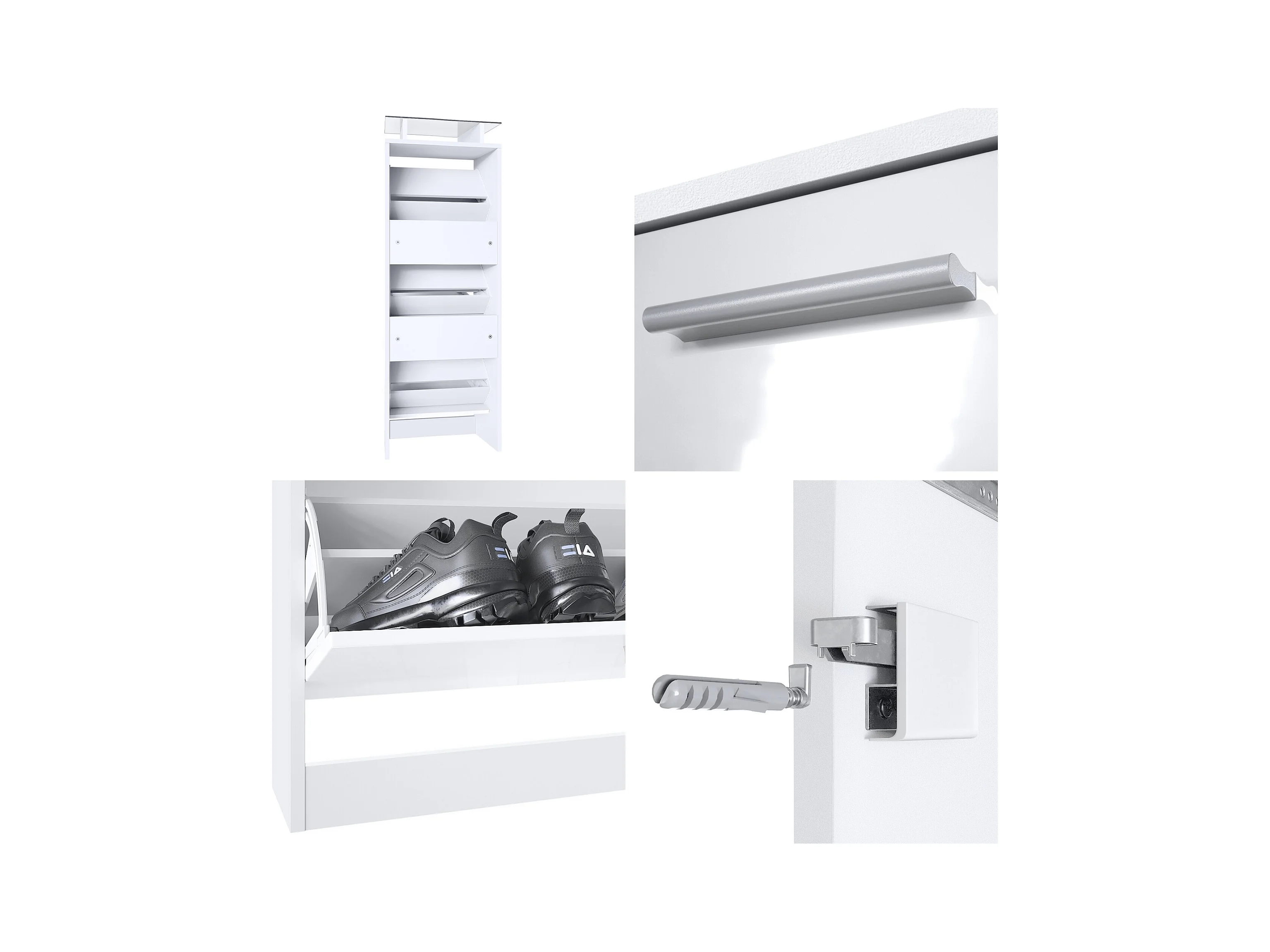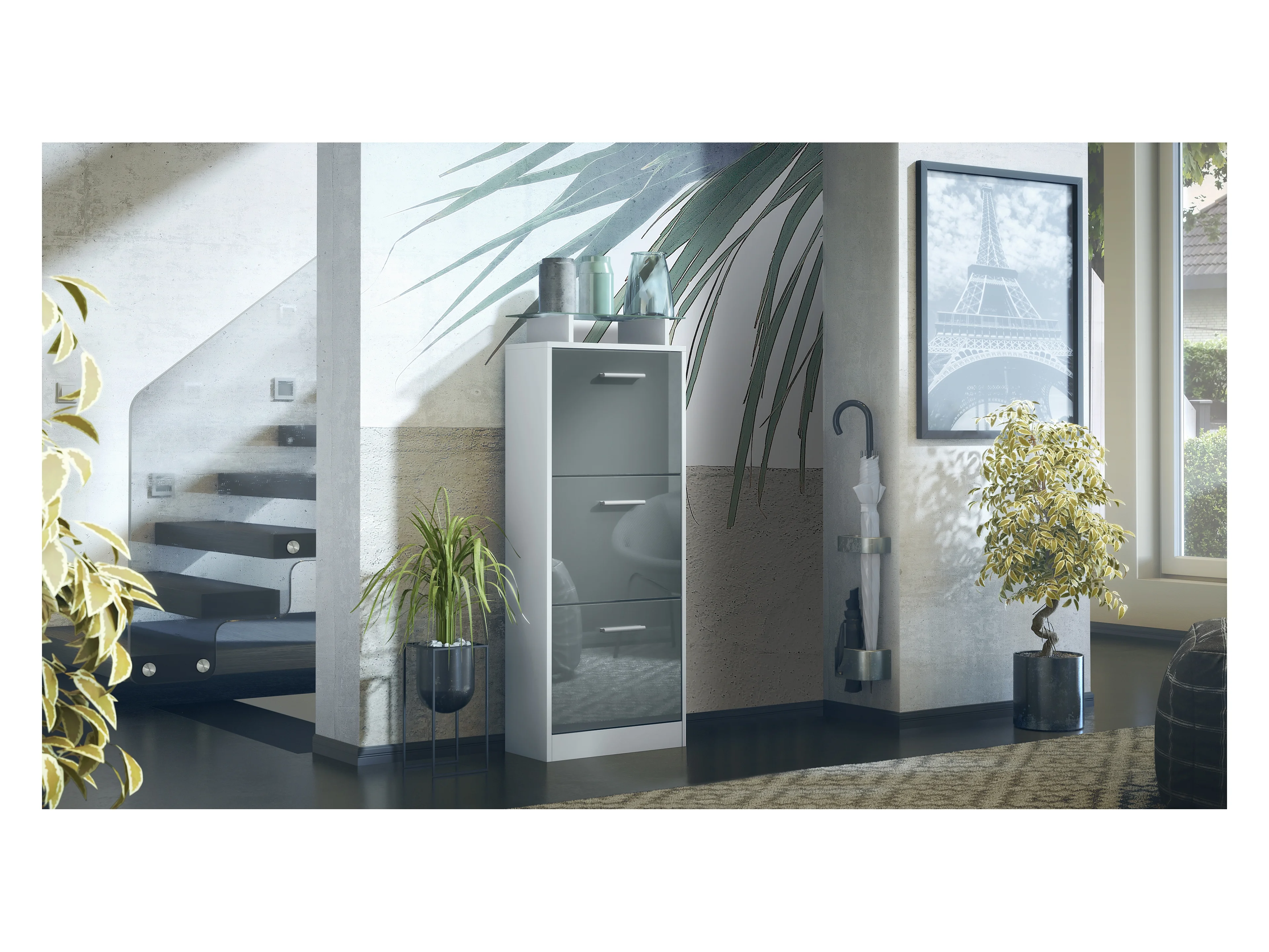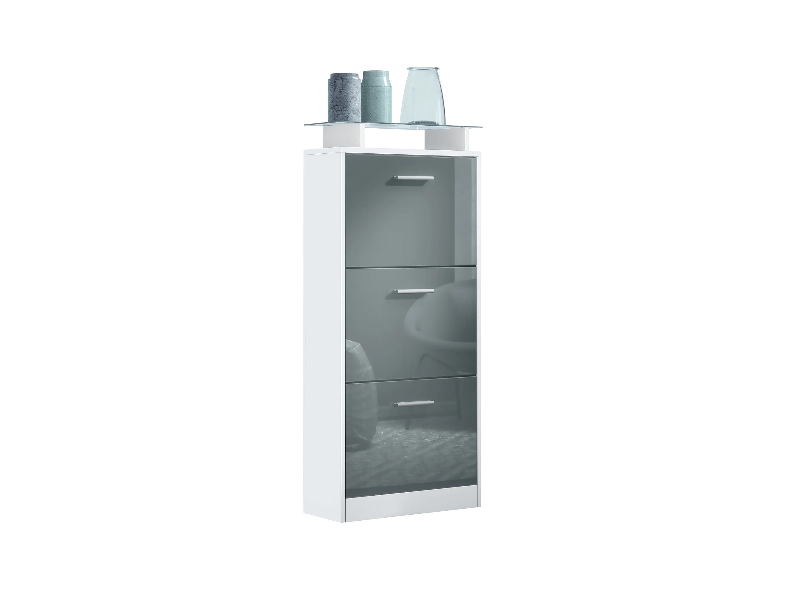 Meuble à Chaussures Lavia V2, Range-Chaussures pour 12 Paires avec 3 Abattants et Étagère en Verre, blanc mat/gris haute brillance (46 x 128 x 23 cm)
