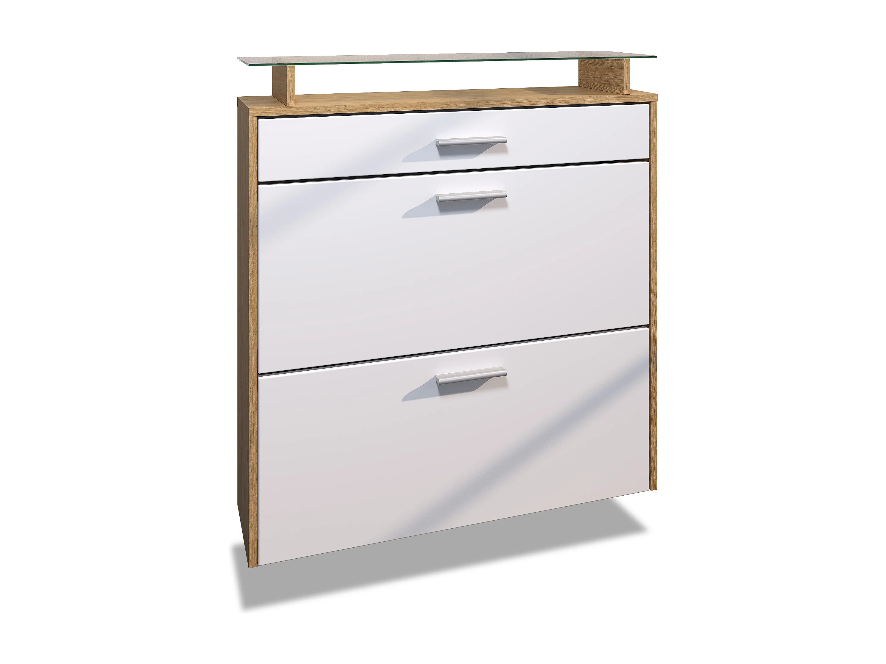 Meuble à Chaussures Malea – espace de rangement suspendu pour 16 paires avec 1 tiroir, Étagère à Chaussures en Chêne Scandi / blanc mat (89 x 95,5 x 23 cm)