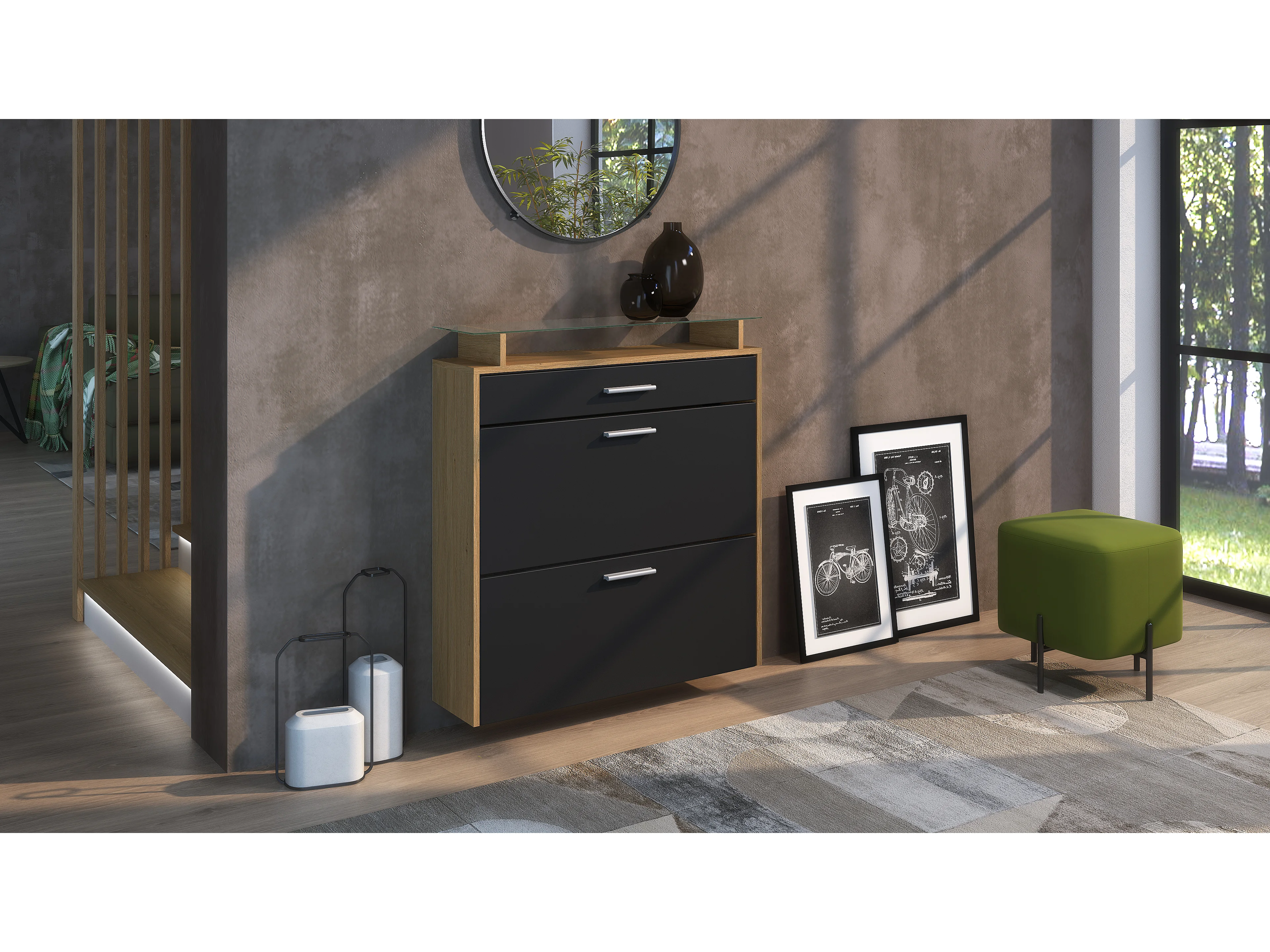 Meuble à Chaussures Malea – espace de rangement suspendu pour 16 paires avec 1 tiroir, Étagère à Chaussures en Chêne Scandi / noir mat (89 x 95,5 x 23 cm)