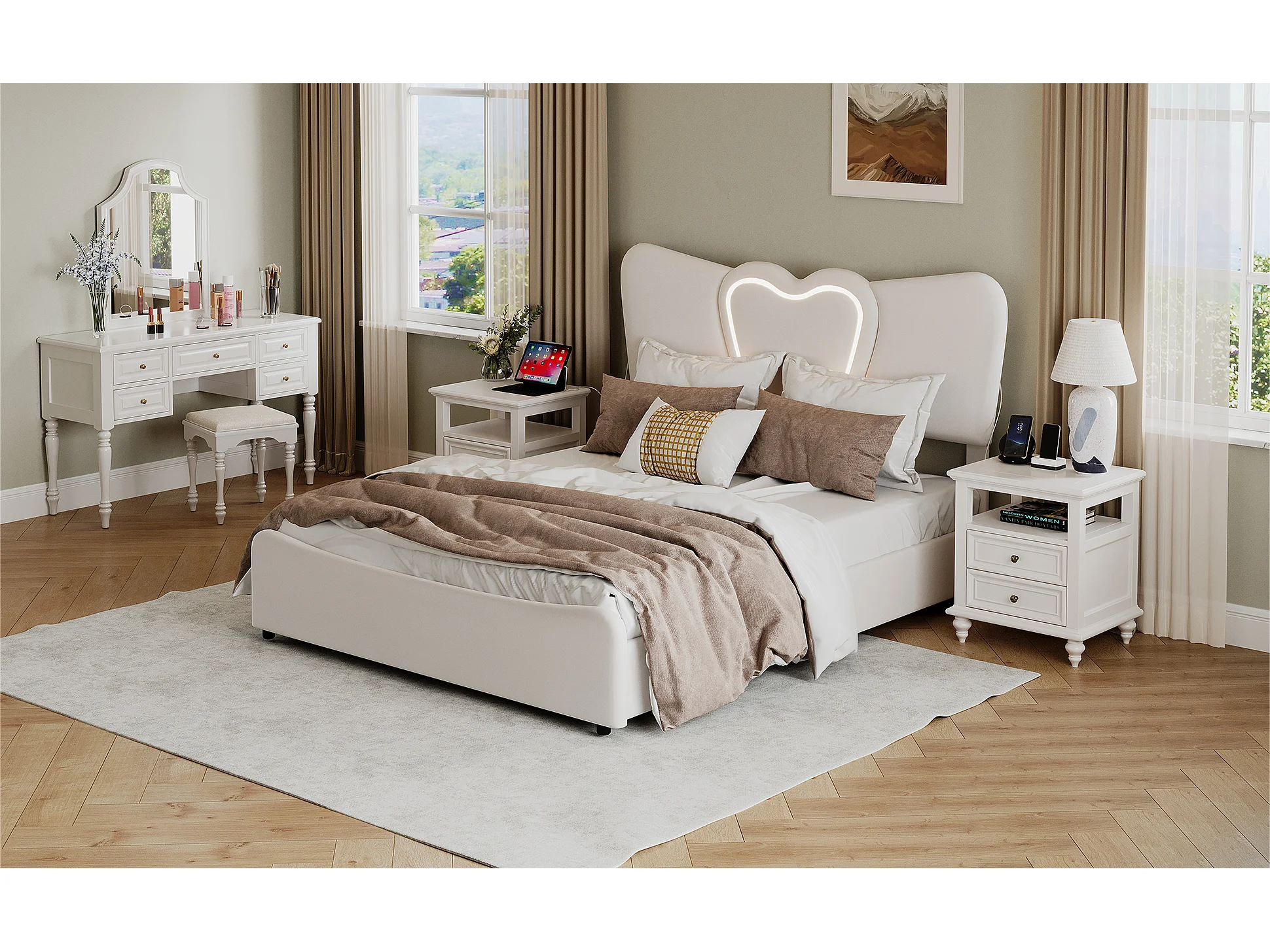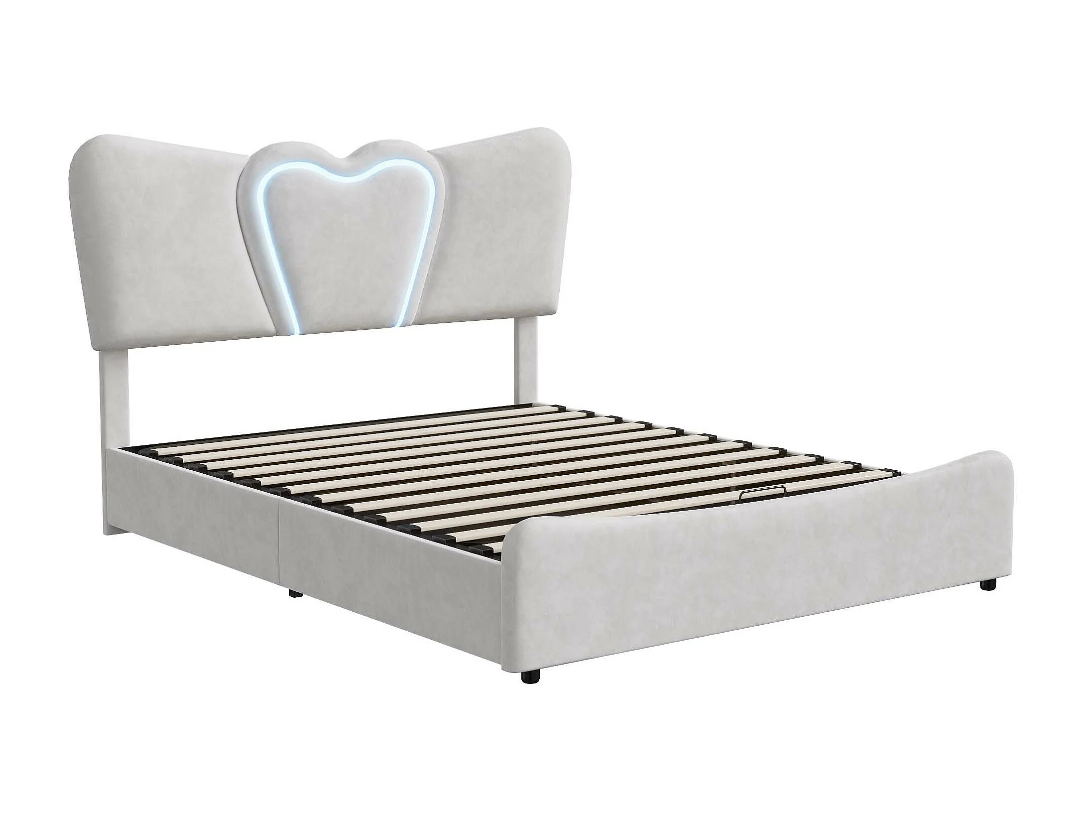 Lit double rembourré 140x200 cm/160x200 cm, lit coffre avec tête de lit en forme de cœur, réglable, cadre de lit hydraulique, velours, beige, sans matelas
