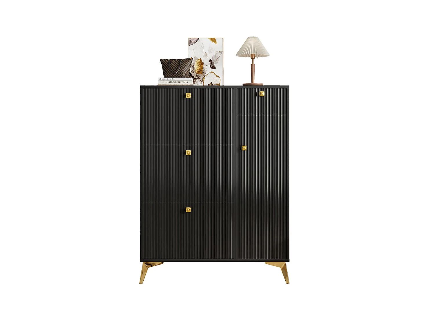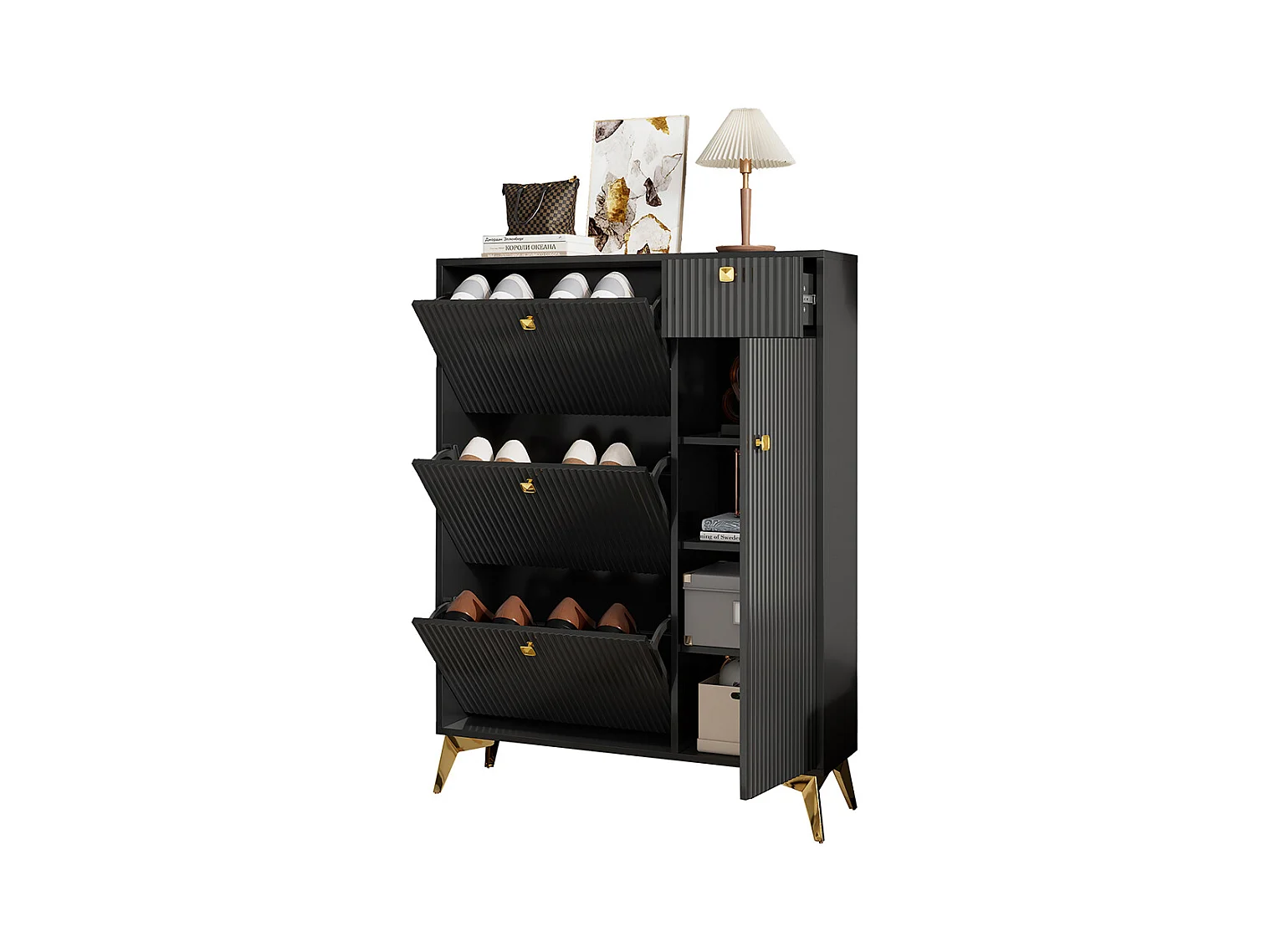 Meuble à chaussures noir avec 3 abattants, 1 tiroir et 1 porte, style moderne - pour entrée ou salon