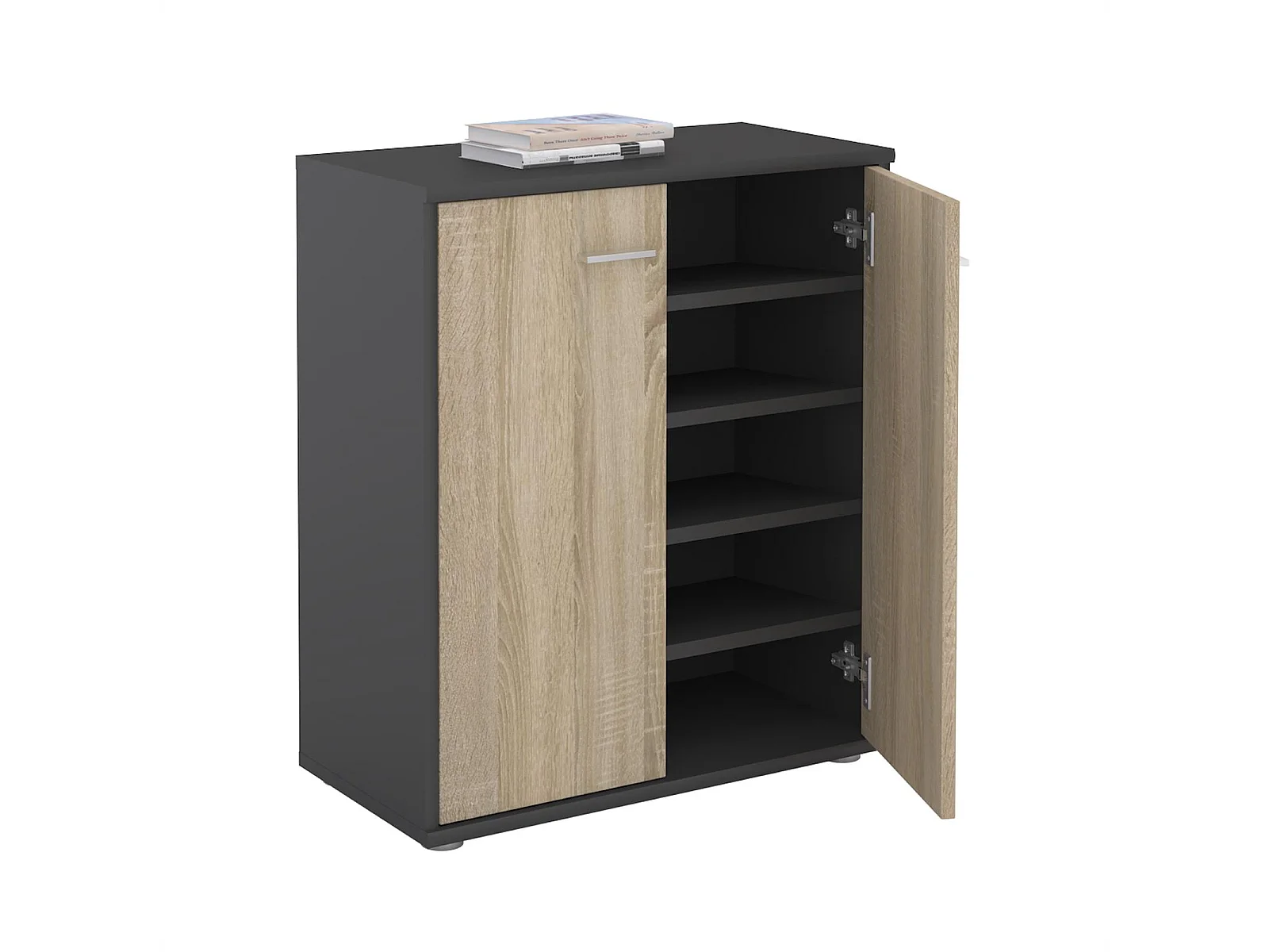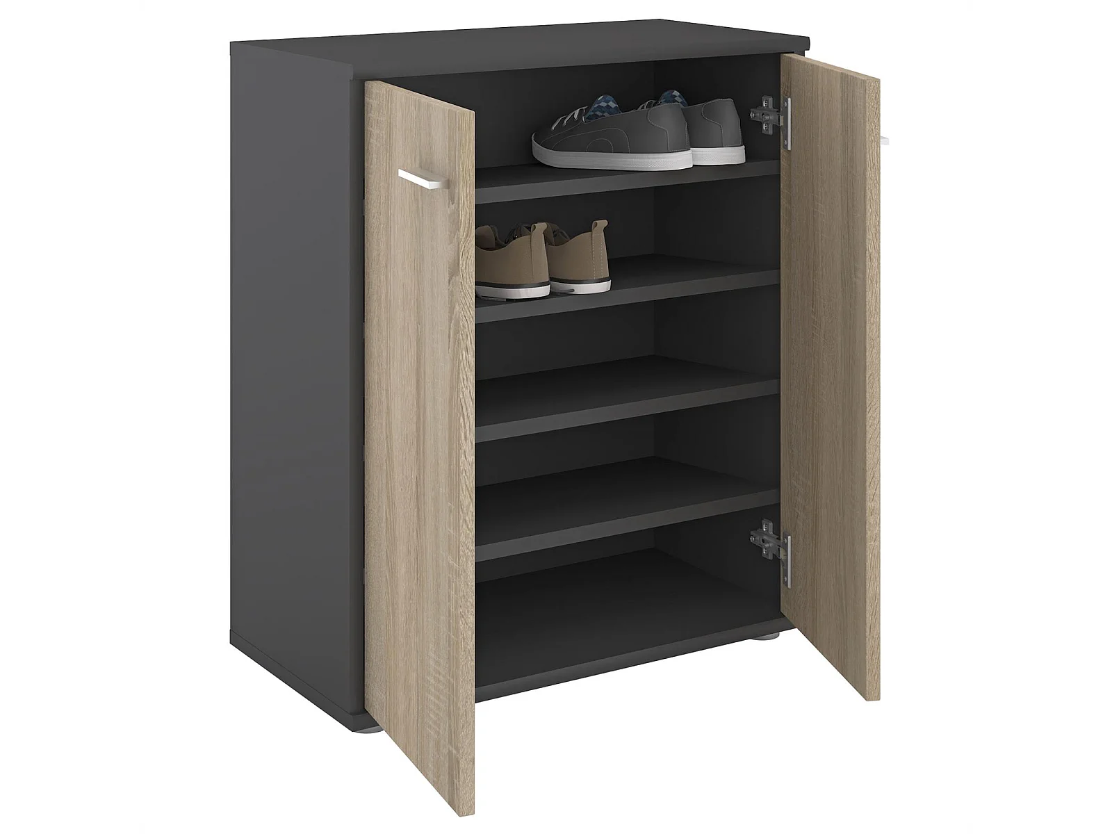 Meuble à chaussures OLYMPE, commode meuble de rangement avec 2 portes, en mélaminé gris mat et décor chêne sonoma