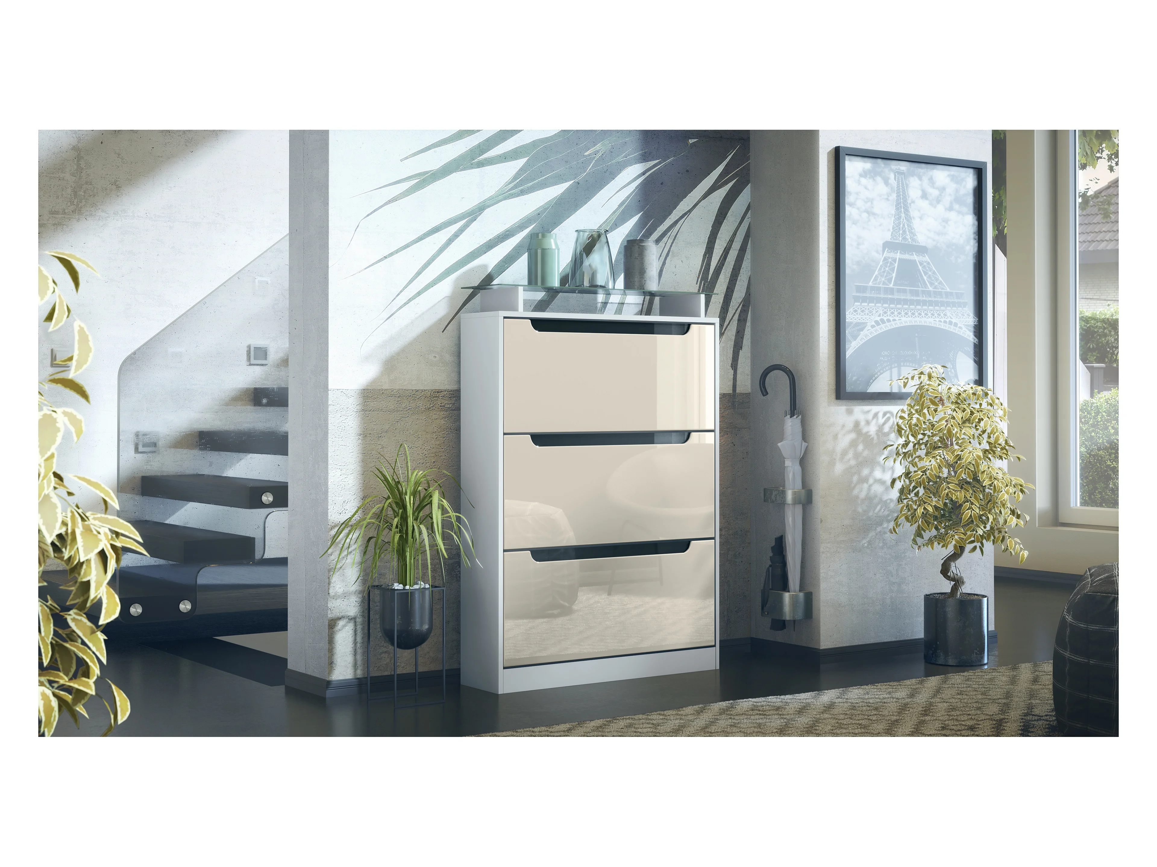Meuble à chaussures Space, basculant pour 24 paires de chaussures avec 3 clapets et étagère en verre, Blanc mat/Crème haute brillance (89 x 128 x 23 cm)