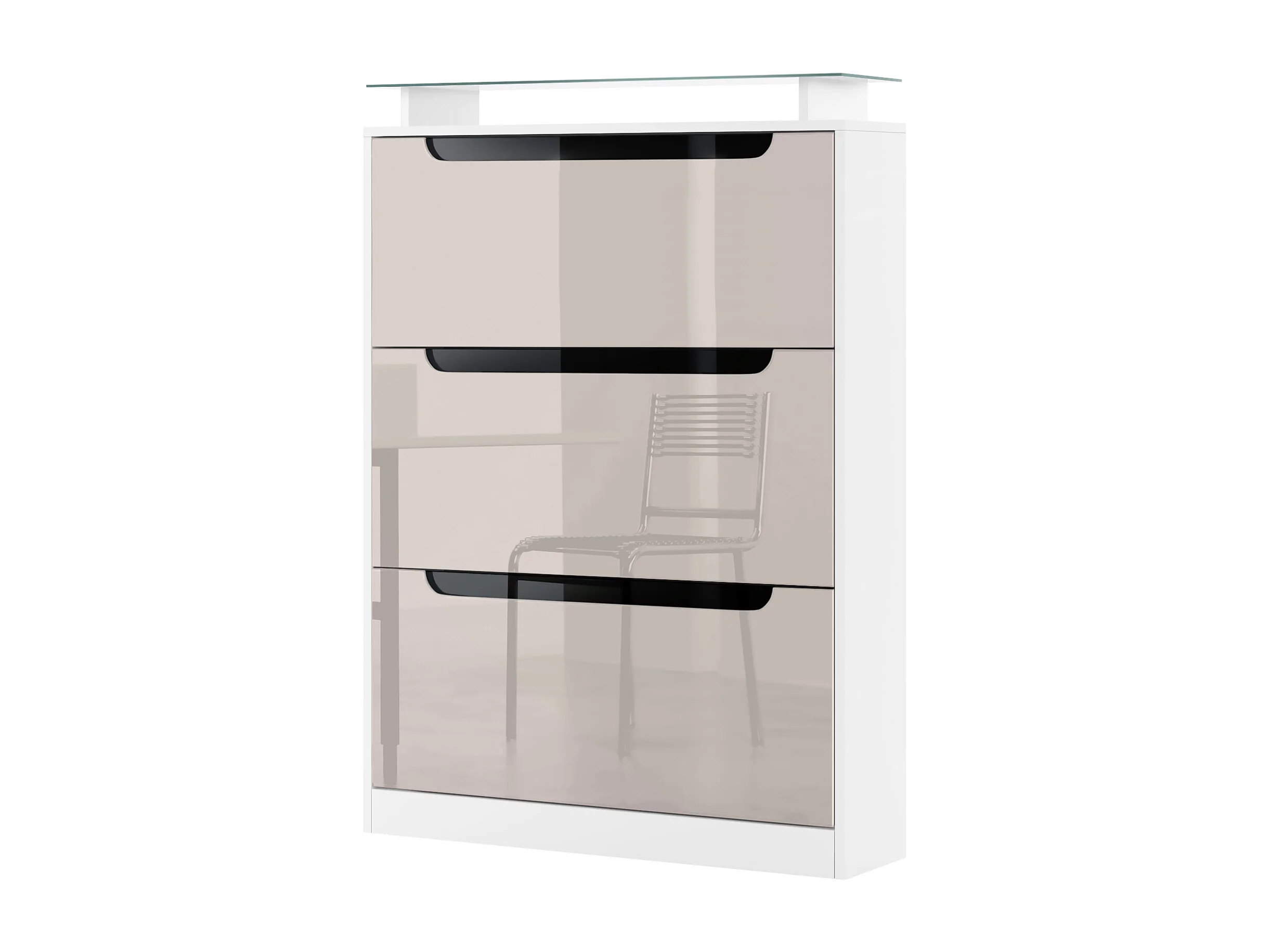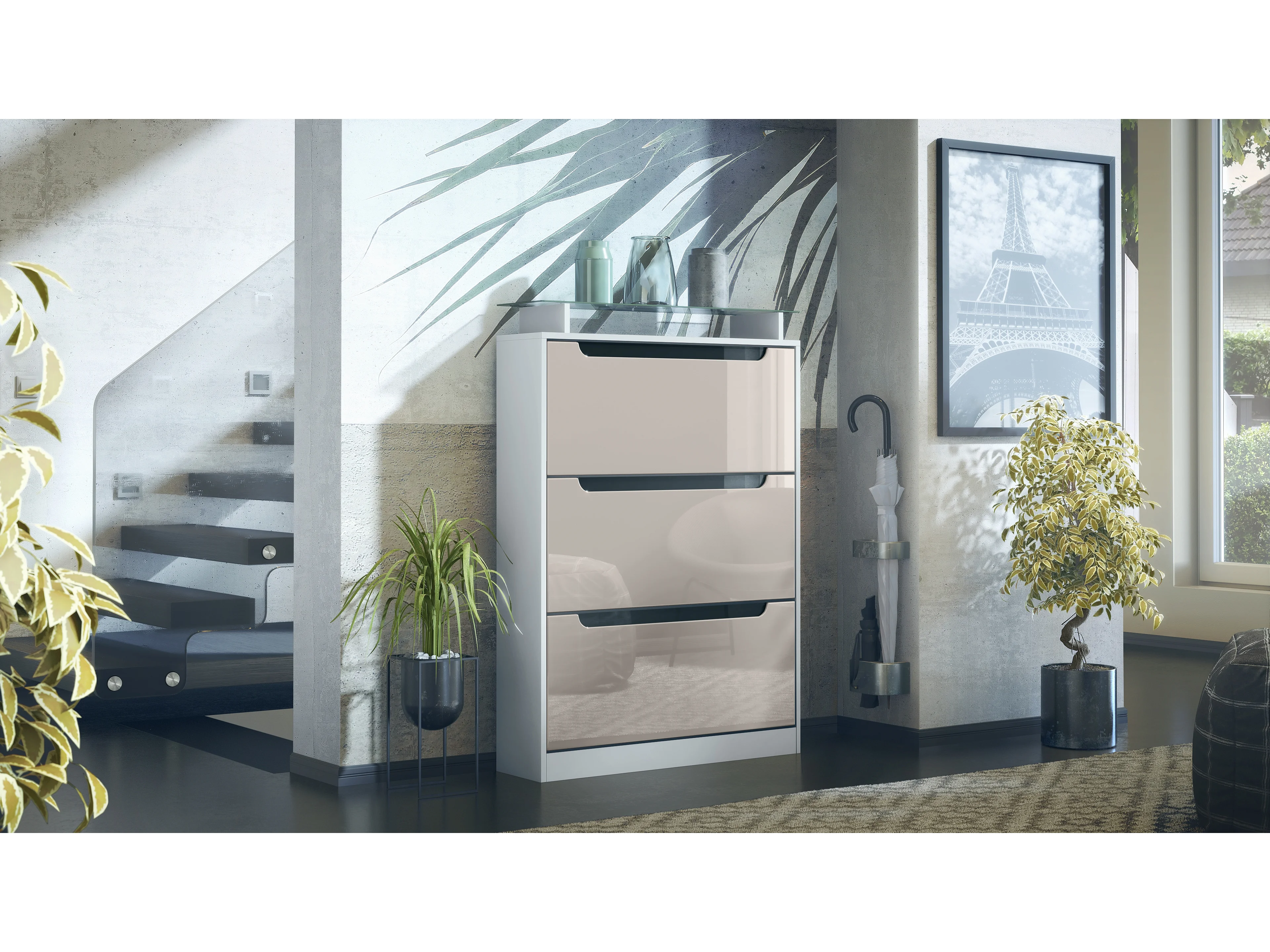 Meuble à chaussures Space, basculant pour 24 paires de chaussures avec 3 clapets et étagère en verre, Blanc mat/Gris sable haute brillance (89 x 128 x 23 cm)