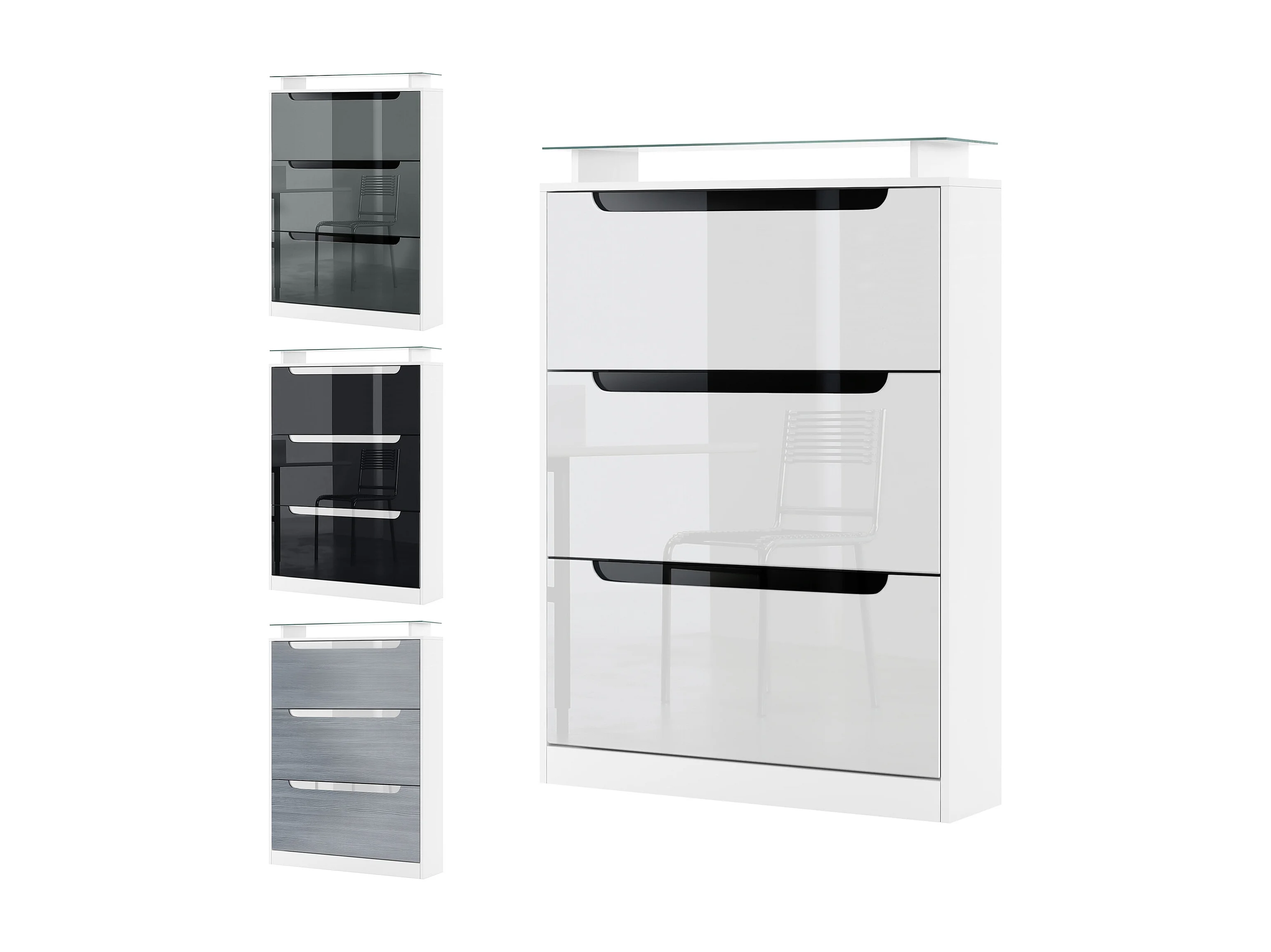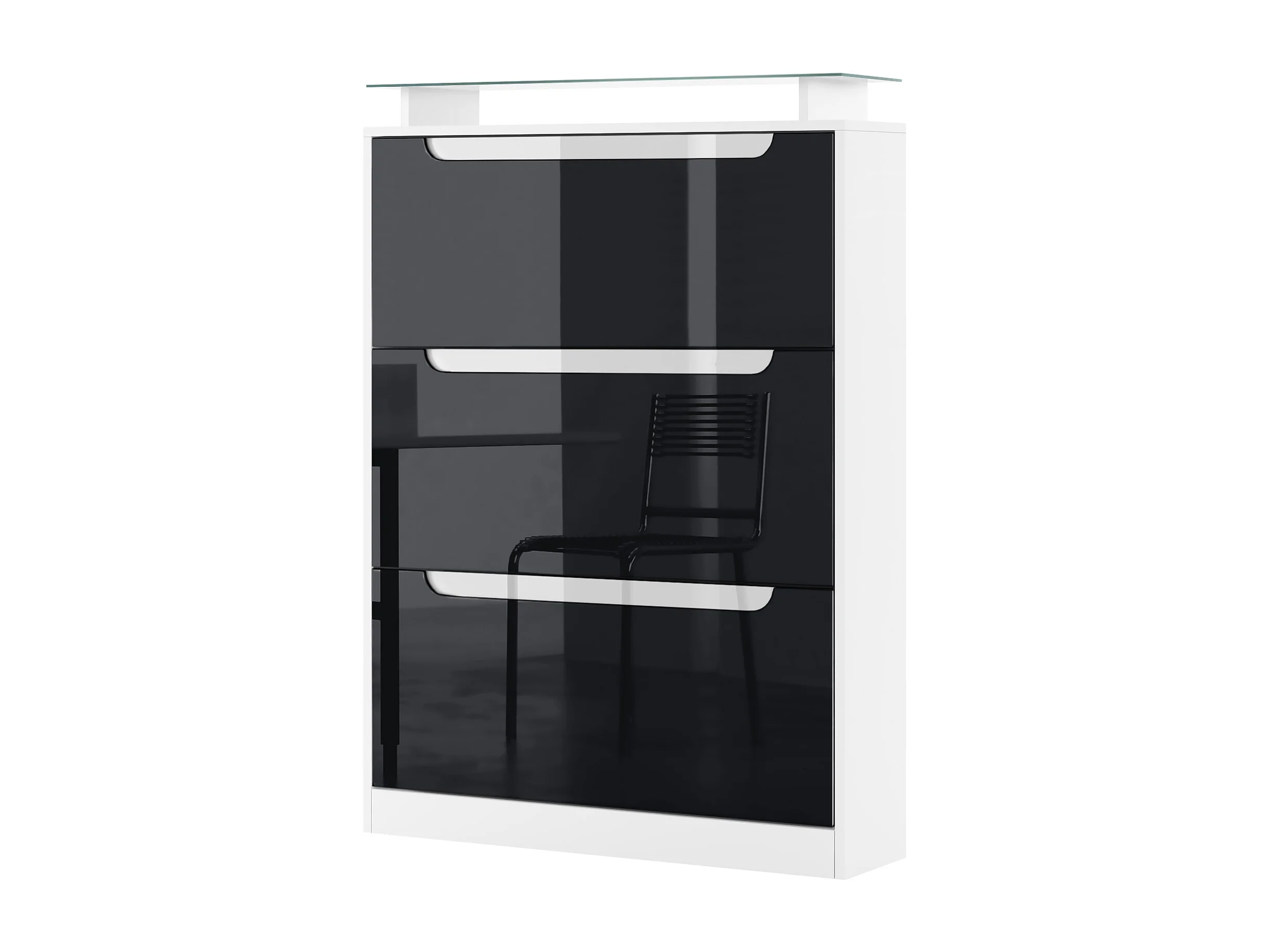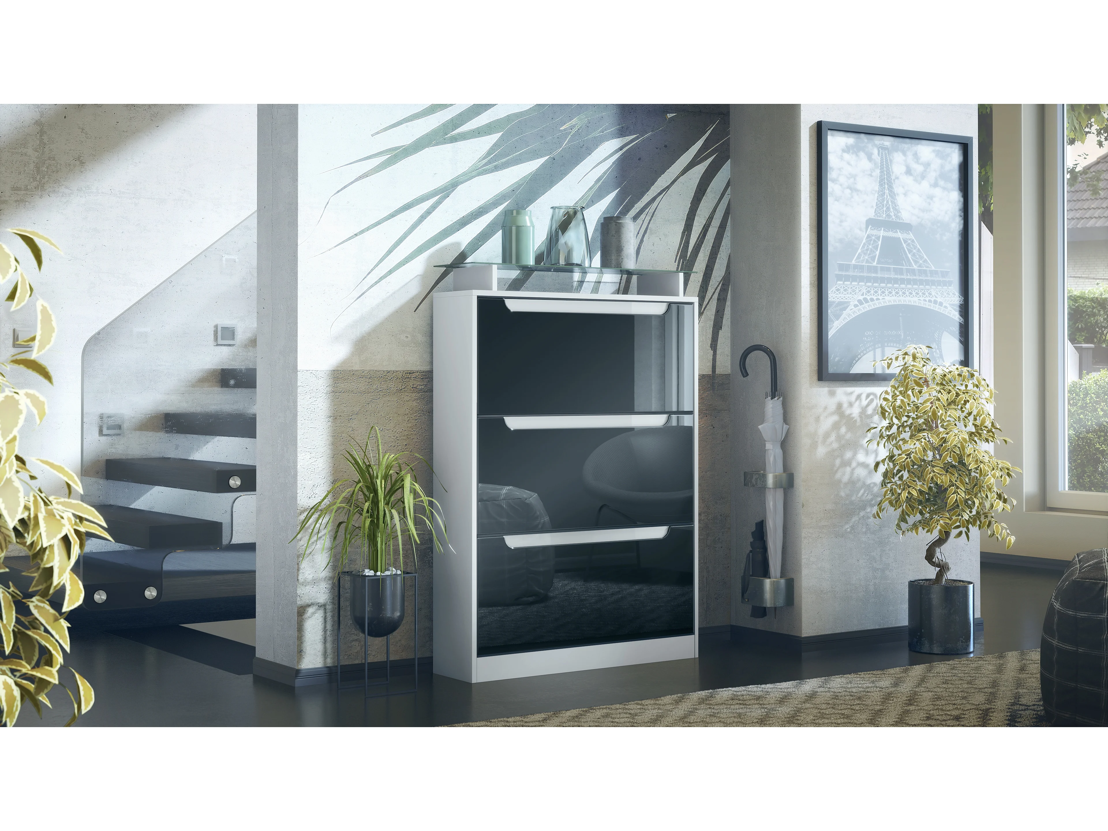 Meuble à chaussures Space, basculant pour 24 paires de chaussures avec 3 clapets et étagère en verre, Blanc mat/Noir haute brillance (89 x 128 x 23 cm)