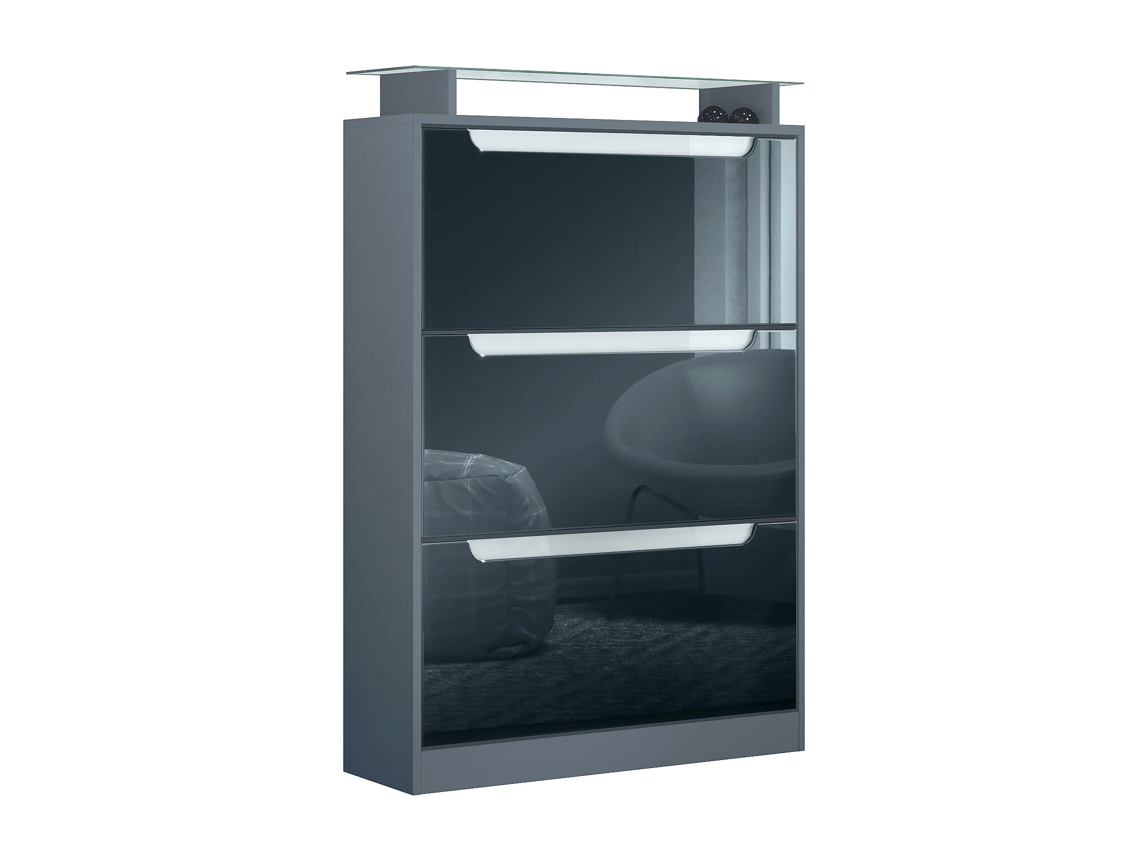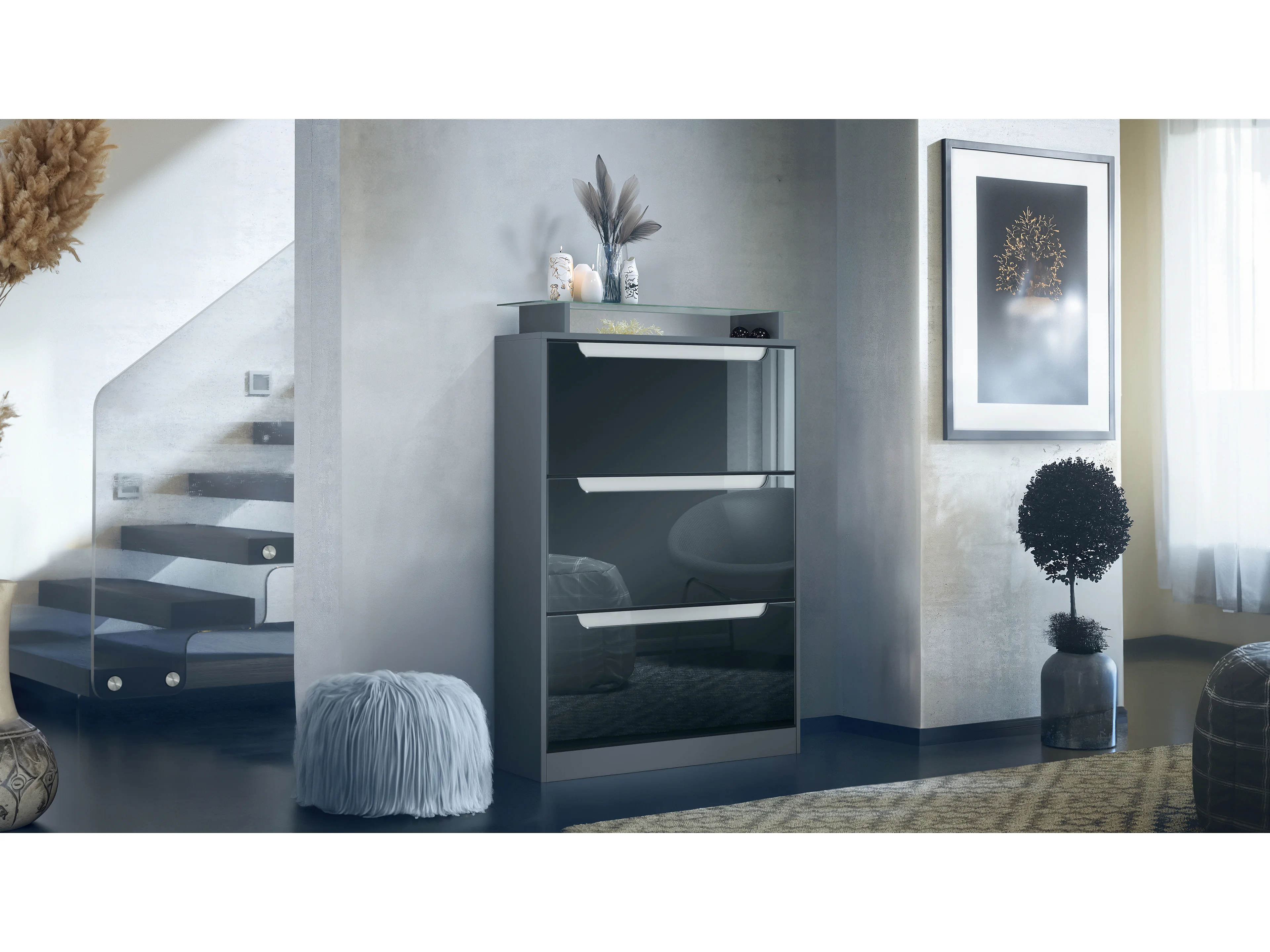 Meuble à chaussures Space, range-chaussures pour 24 paires avec 3 abattants et étagère en verre, anthracite mat/noir haute brillance (89 x 128 x 23 cm)