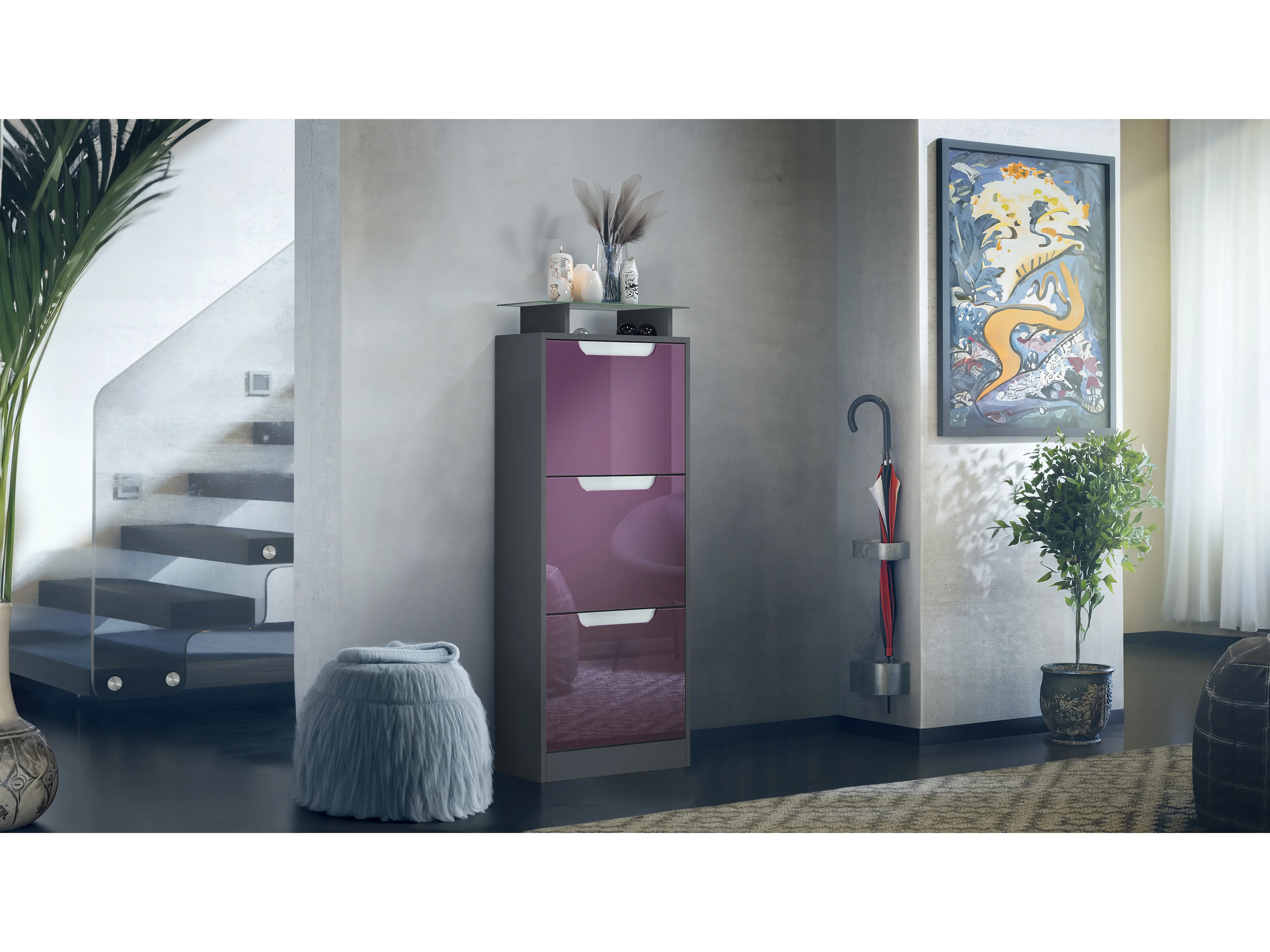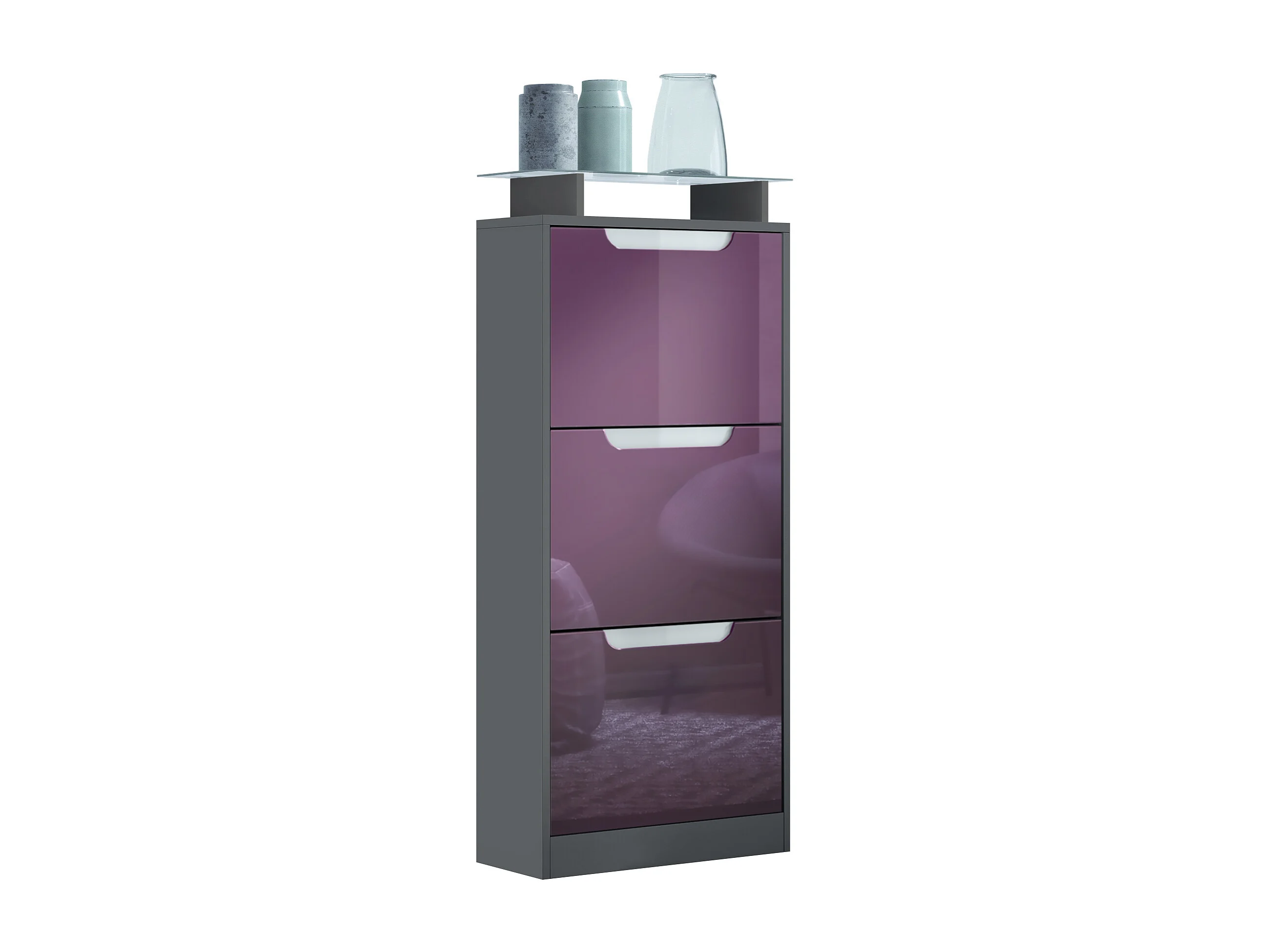 Meuble à chaussures Space V2, Range-chaussures pour 12 paires de chaussures avec 3 abattants et étagère en verre, anthracite mat/mûre brillant (46x128x23 cm)
