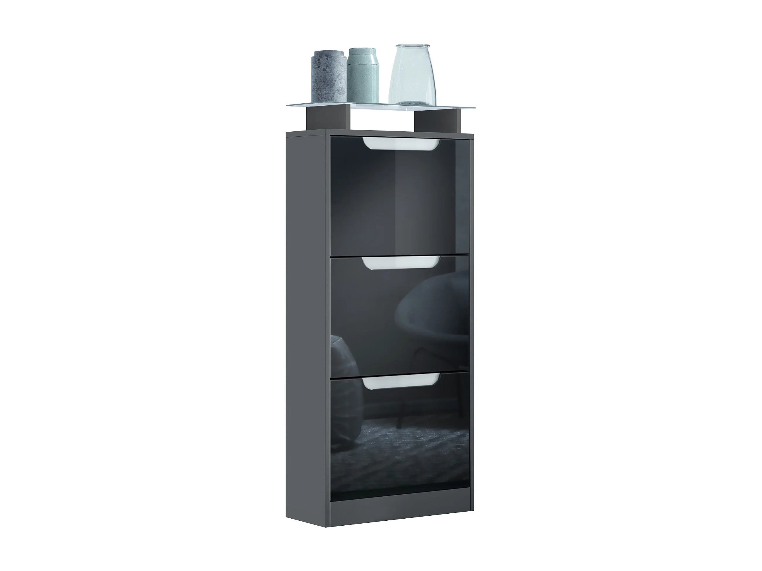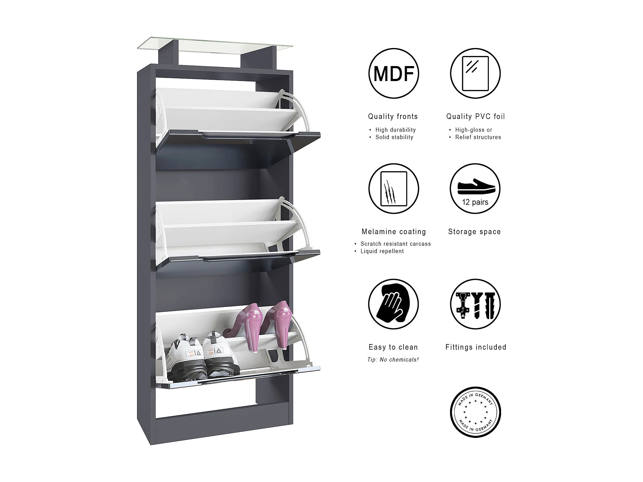 Meuble à chaussures Space V2, Range-chaussures pour 12 paires de chaussures avec 3 abattants et étagère en verre, anthracite mat/noir brillant (46x128x23 cm)