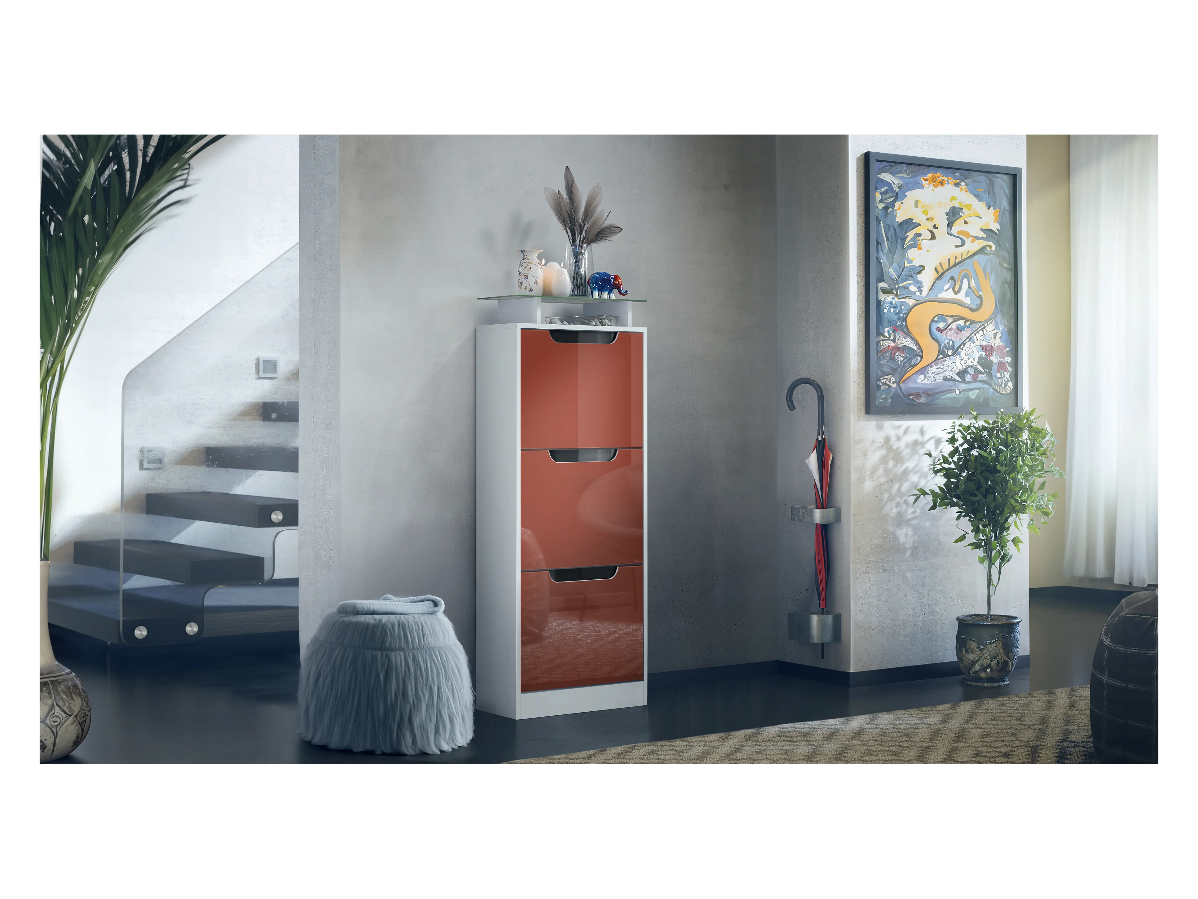 Meuble à chaussures Space V2, Range-chaussures pour 12 paires de chaussures avec 3 abattants et étagère en verre, blanc mat/bordeaux brillant (46x128x23 cm)