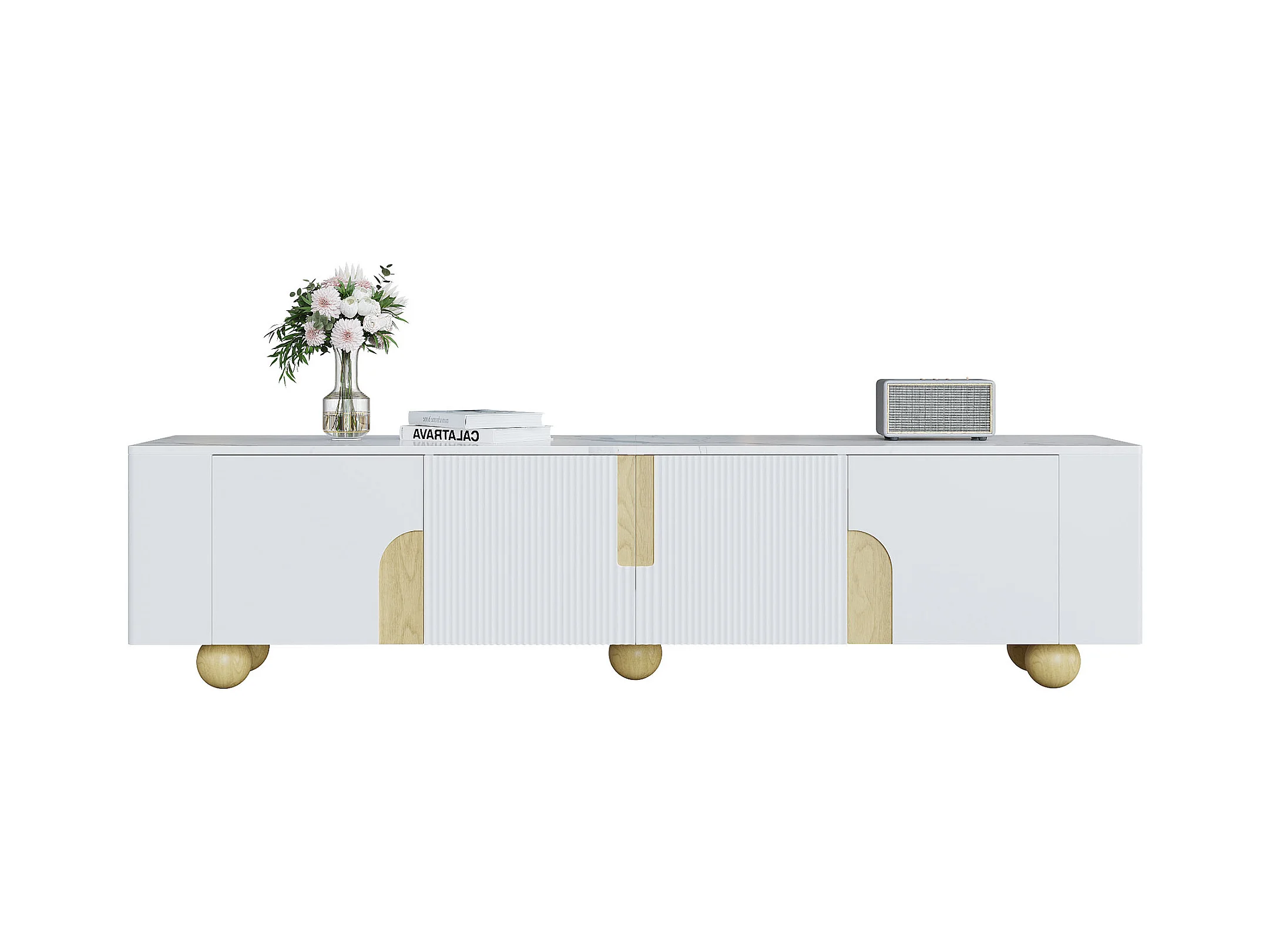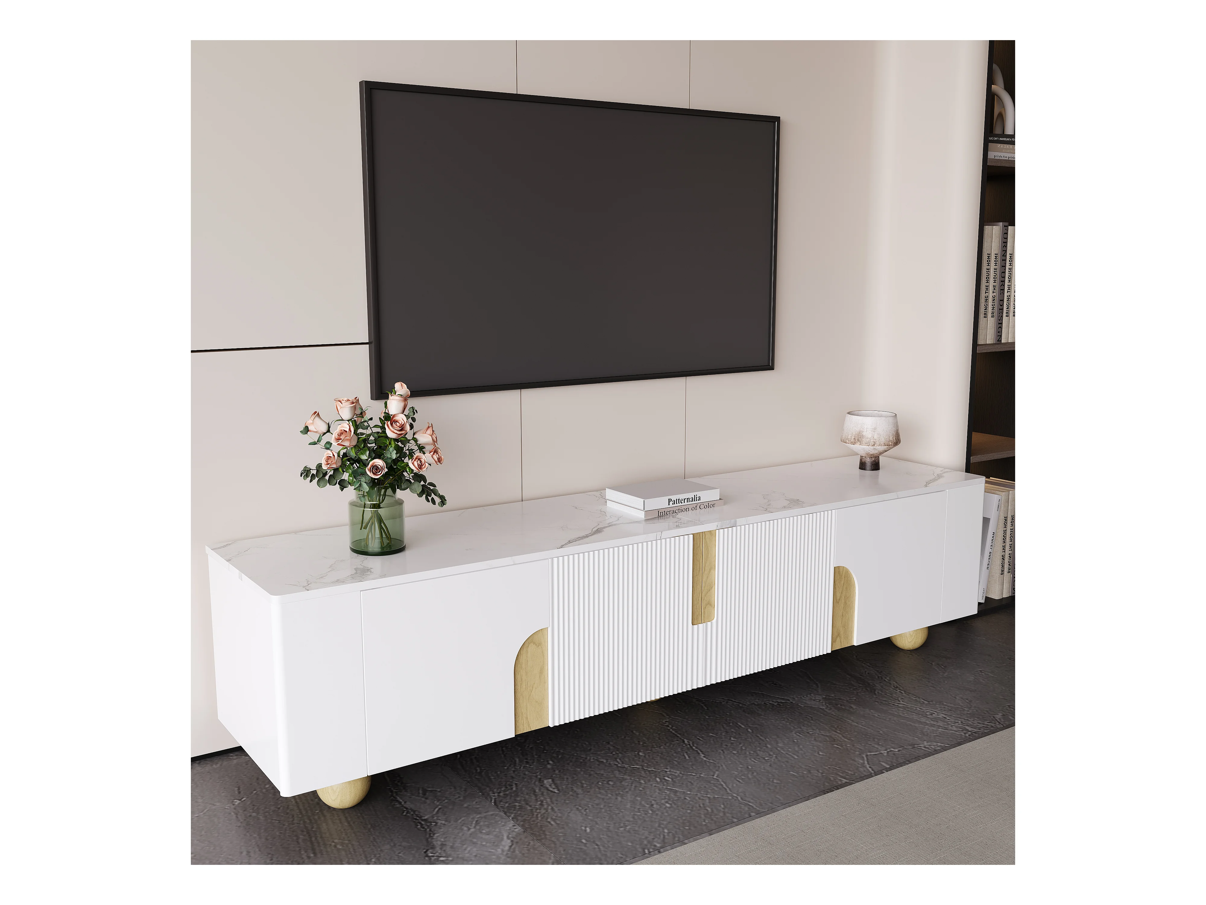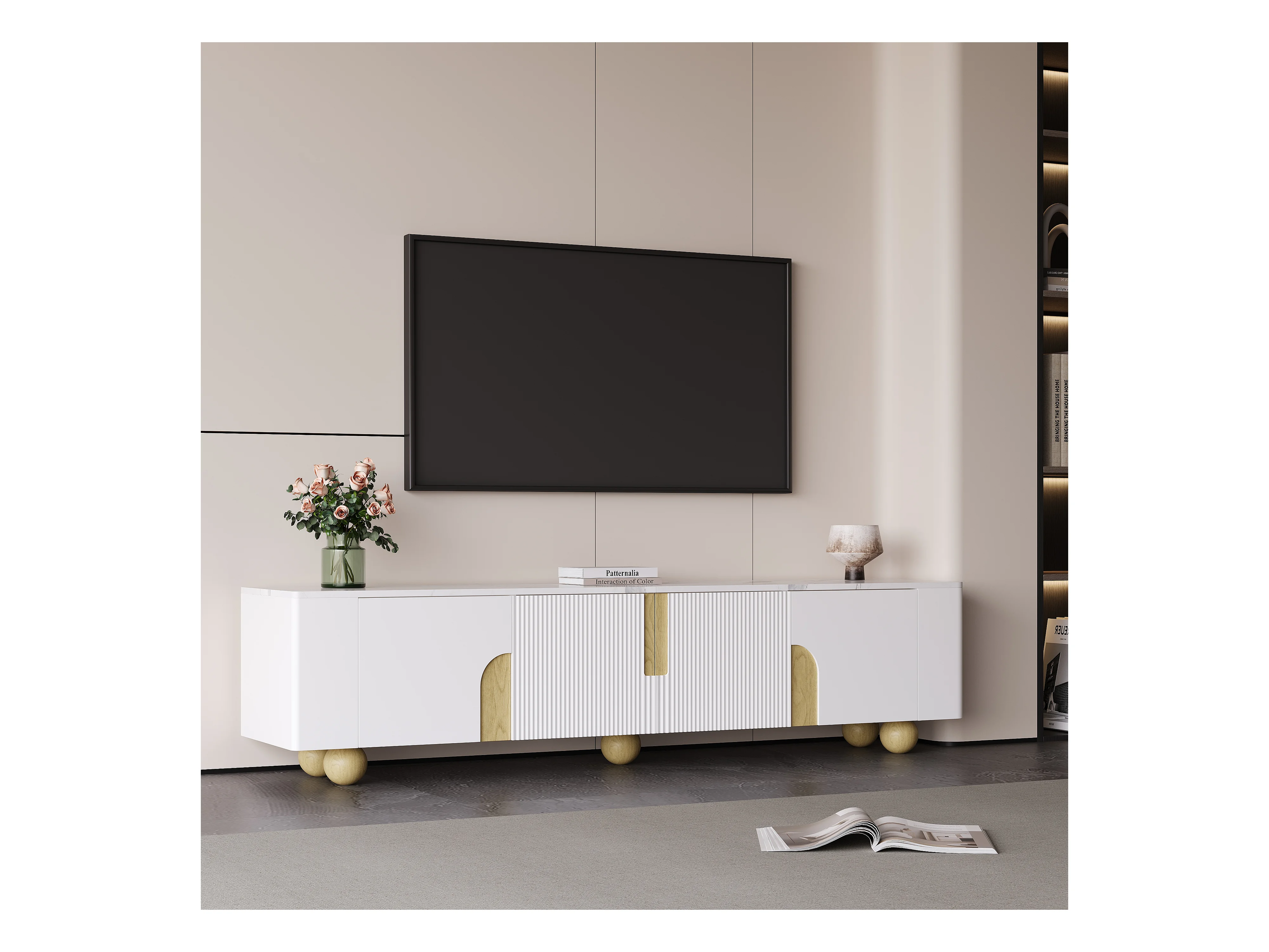 Meuble Banc TV - 180 x 40 x 44 cm - avec 4 portes - pieds sphériques - Panneau de particules + MDF - blanc