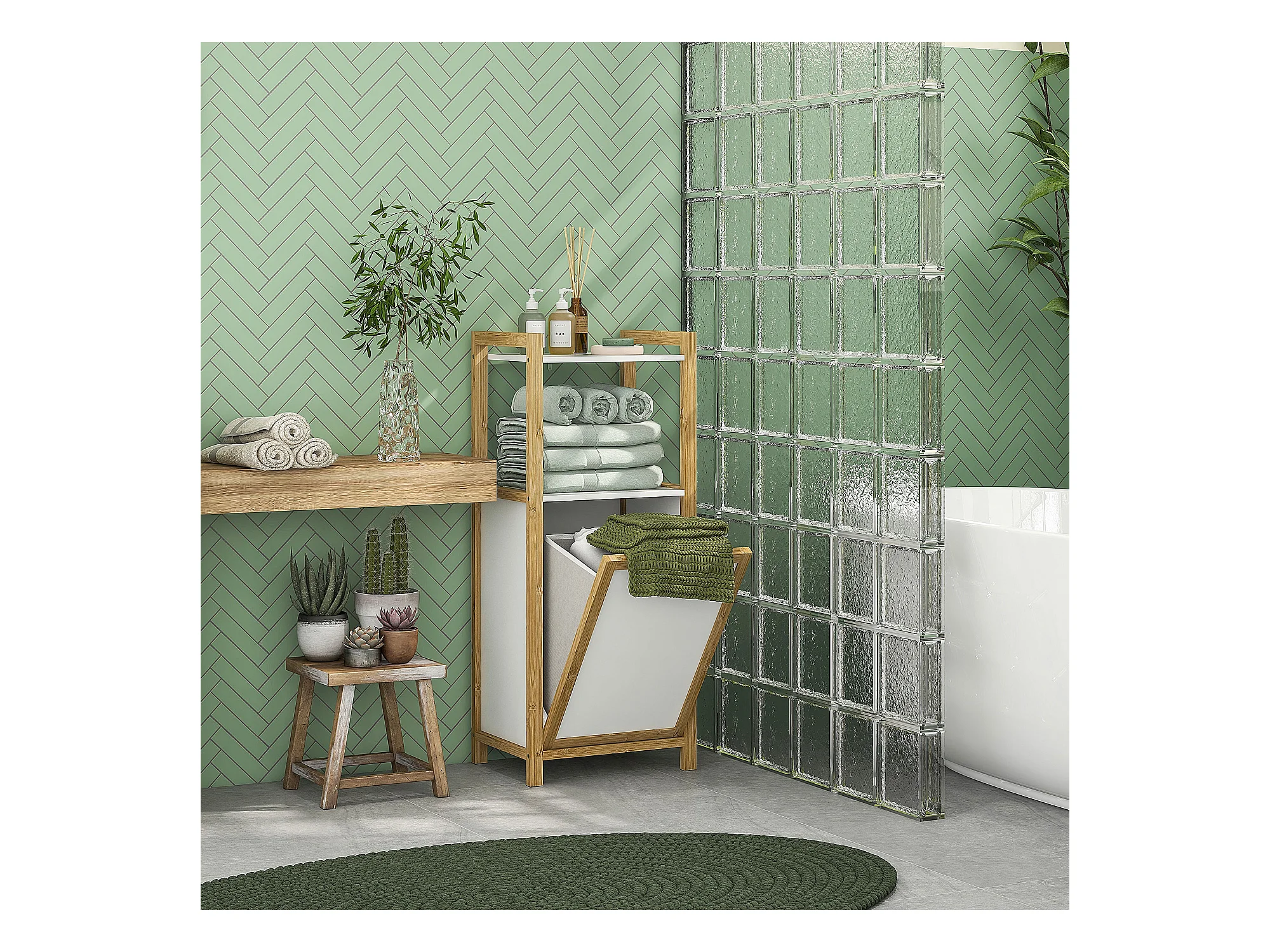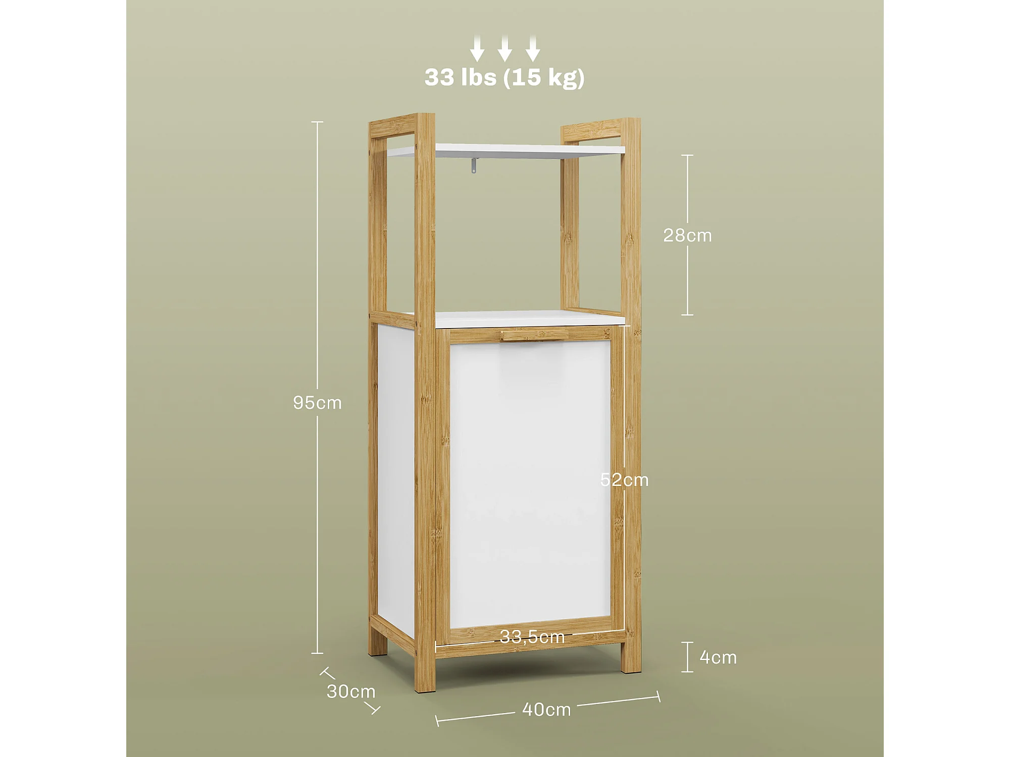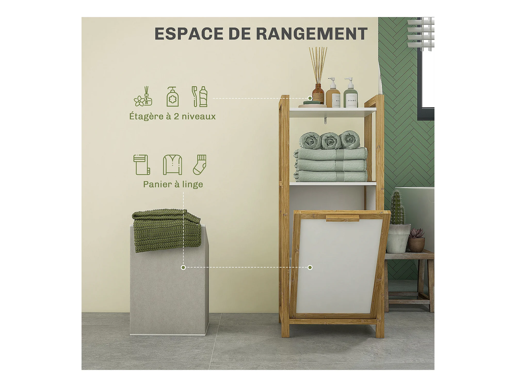Meuble bas de salle de bain sur pied - 2 étagères, panier à linge - dim. 40L x 30l x 86,5H cm - bambou MDF blanc