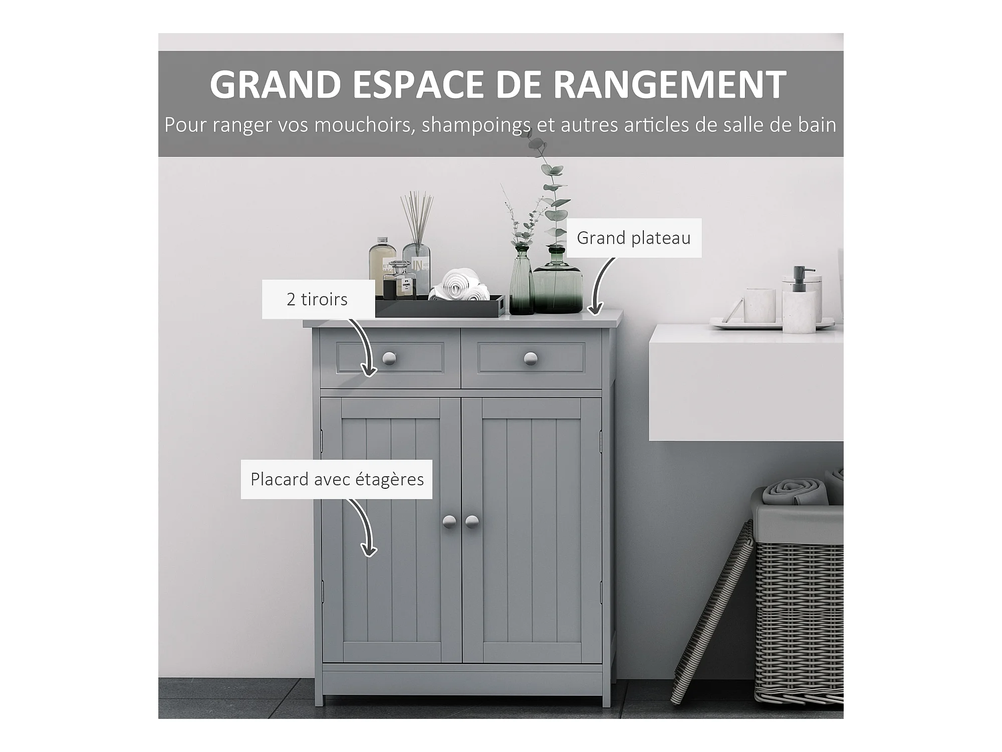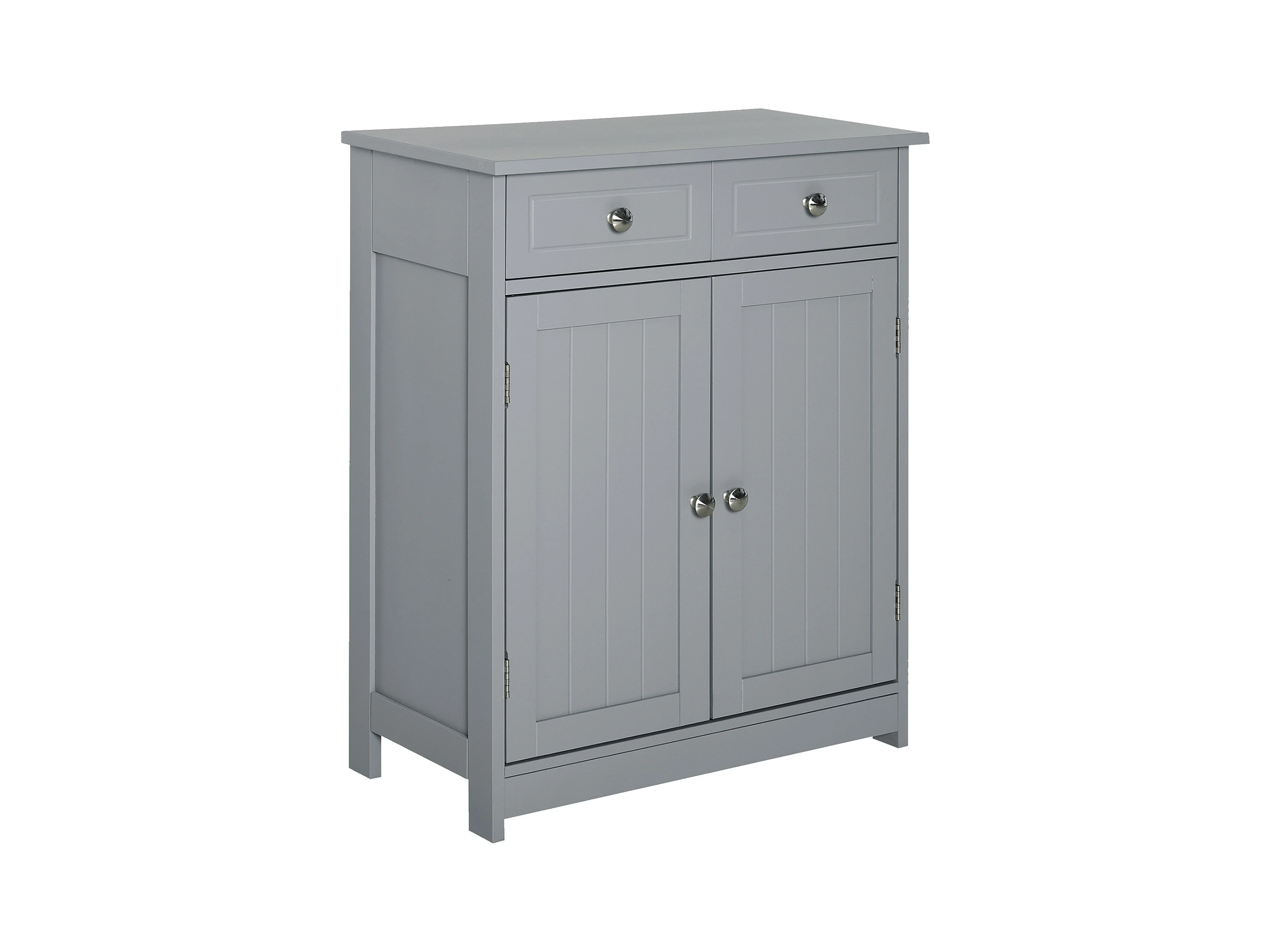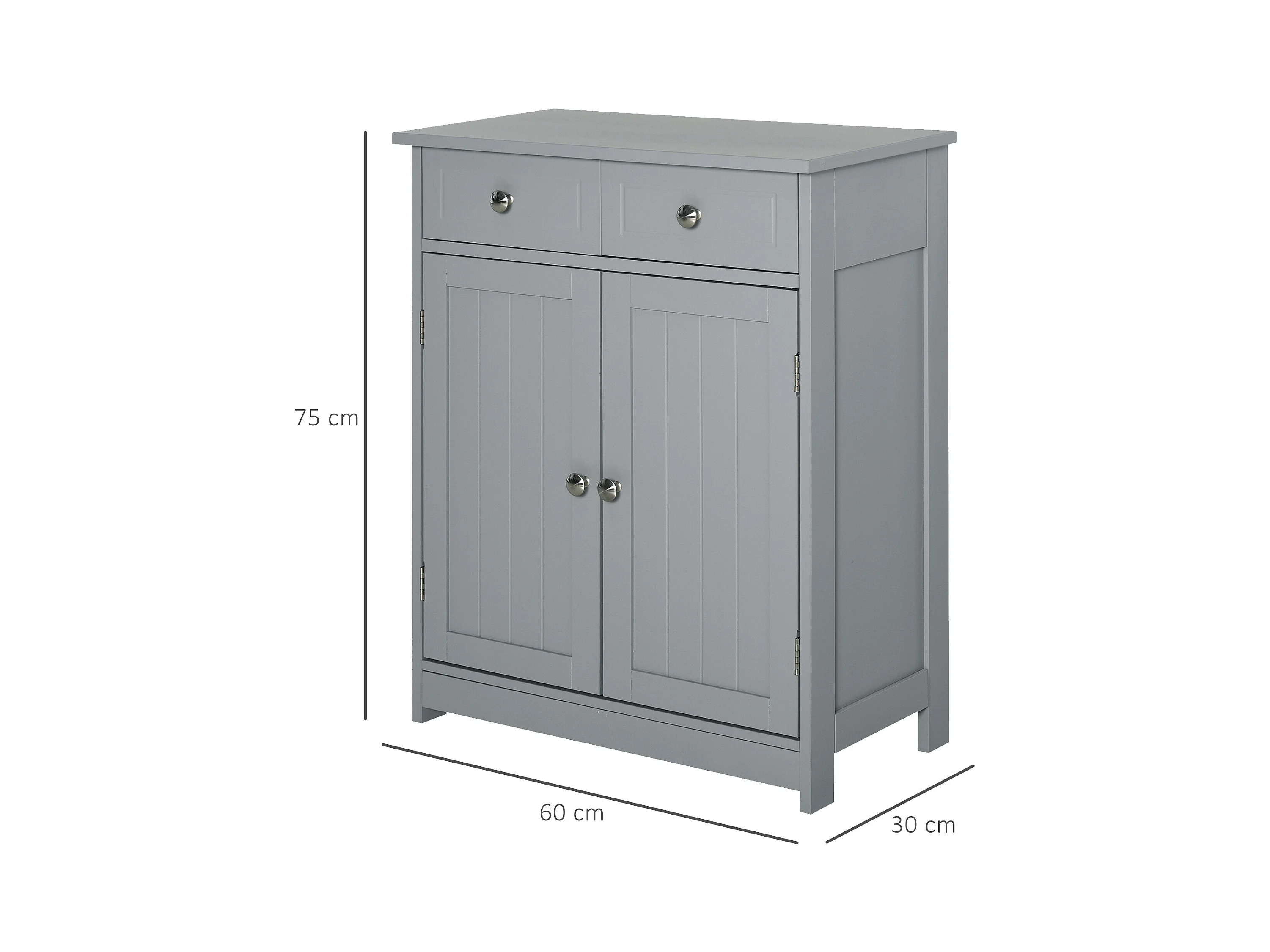 Meuble bas de salle de bain sur pied 2 portes avec étagère réglable 2 tiroirs poignées boutons métal MDF gris