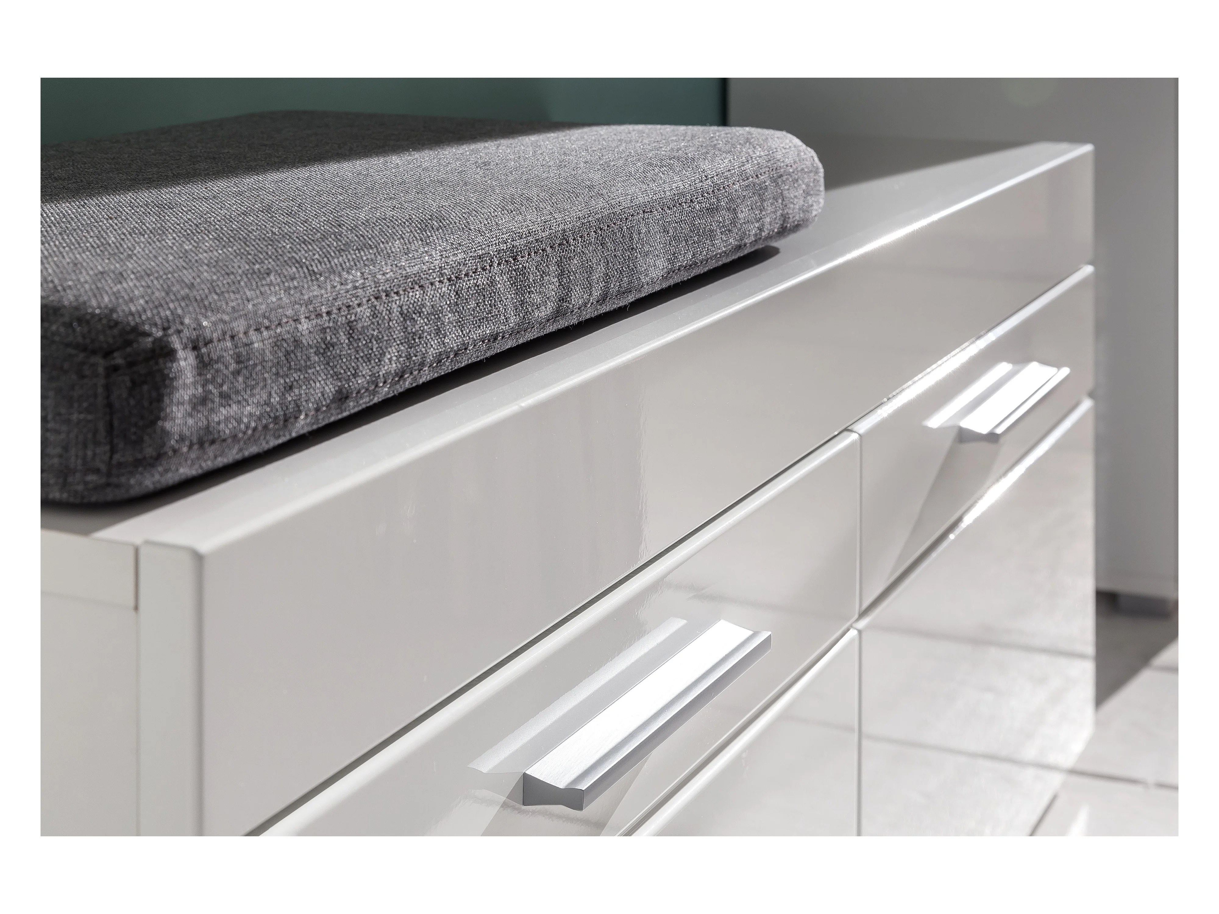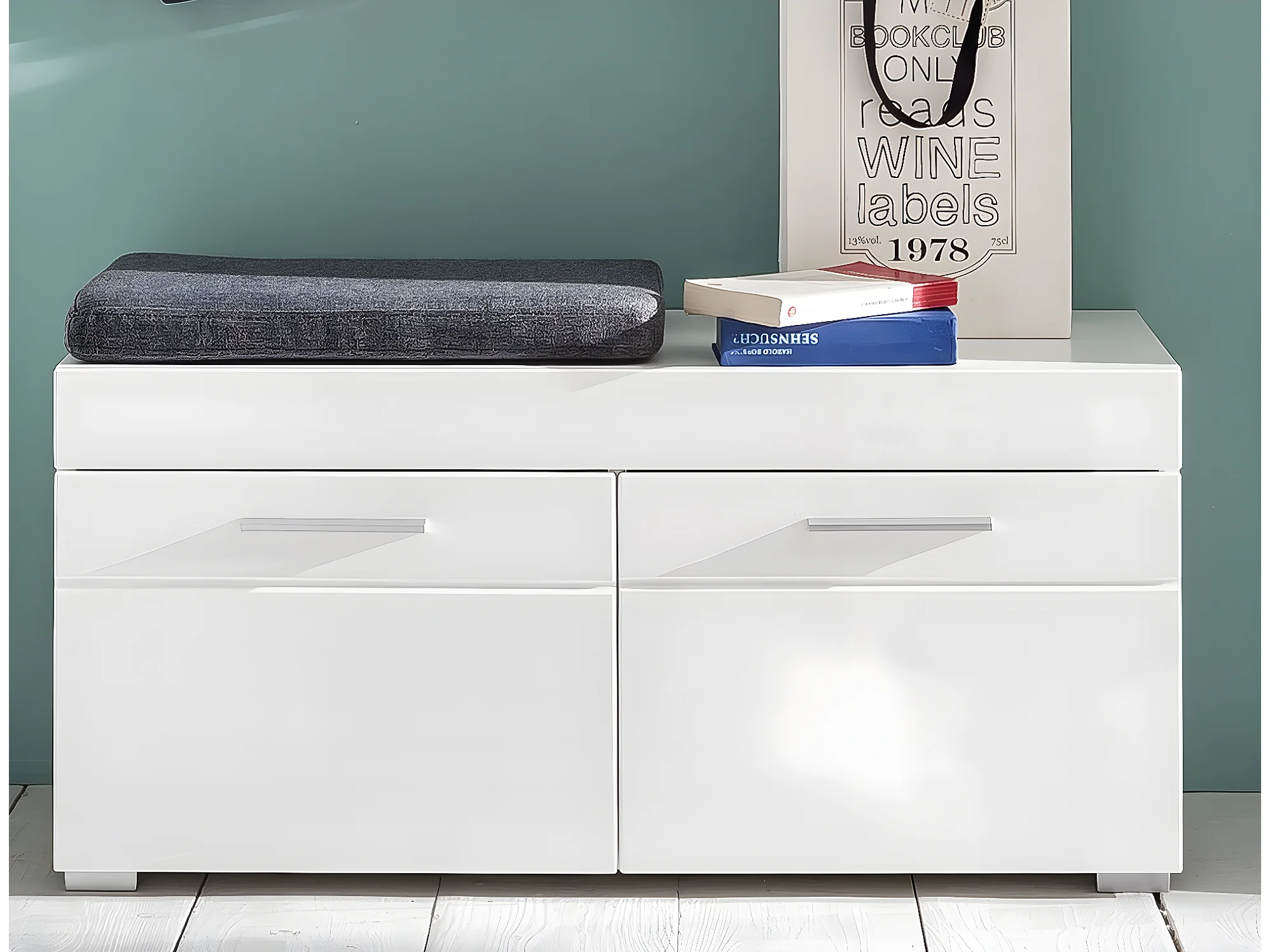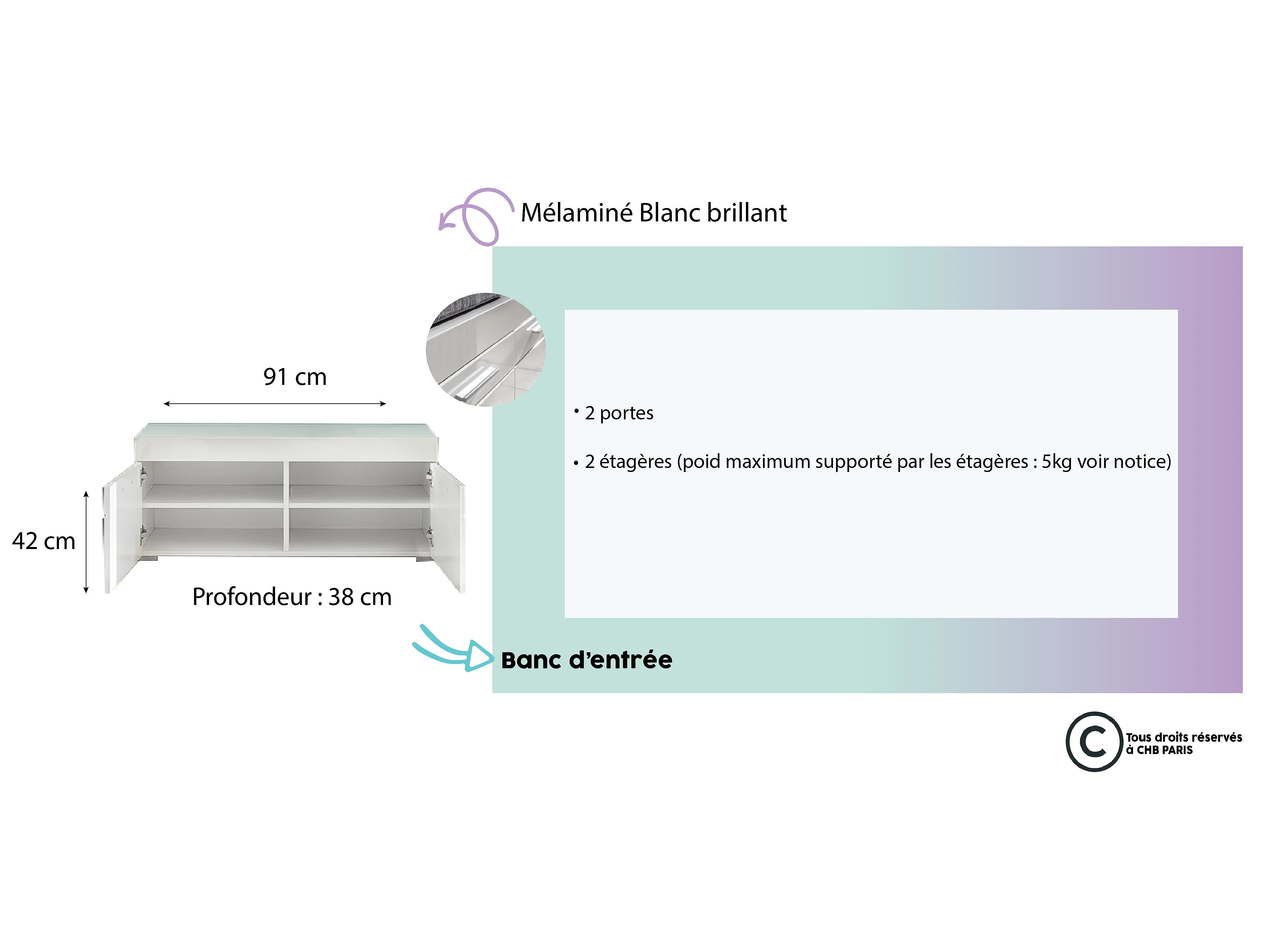Meuble bas d'entrée : banc mélaminé blanc. 2 compartiments portes + étagères. L - H - P : 91 ] 42 |38 cm