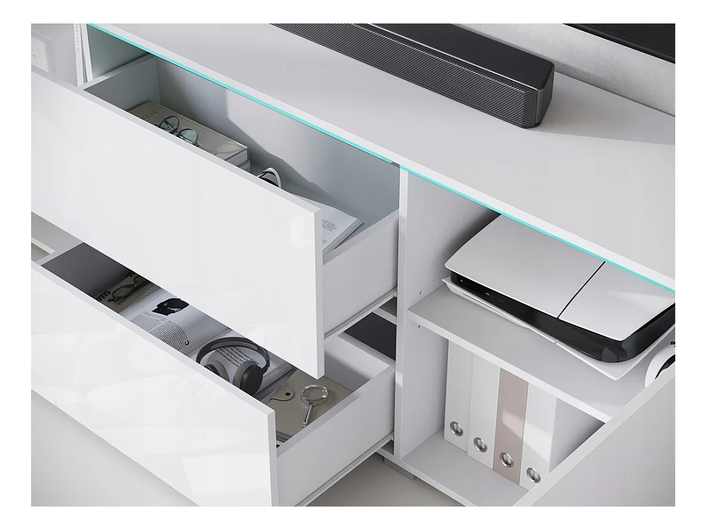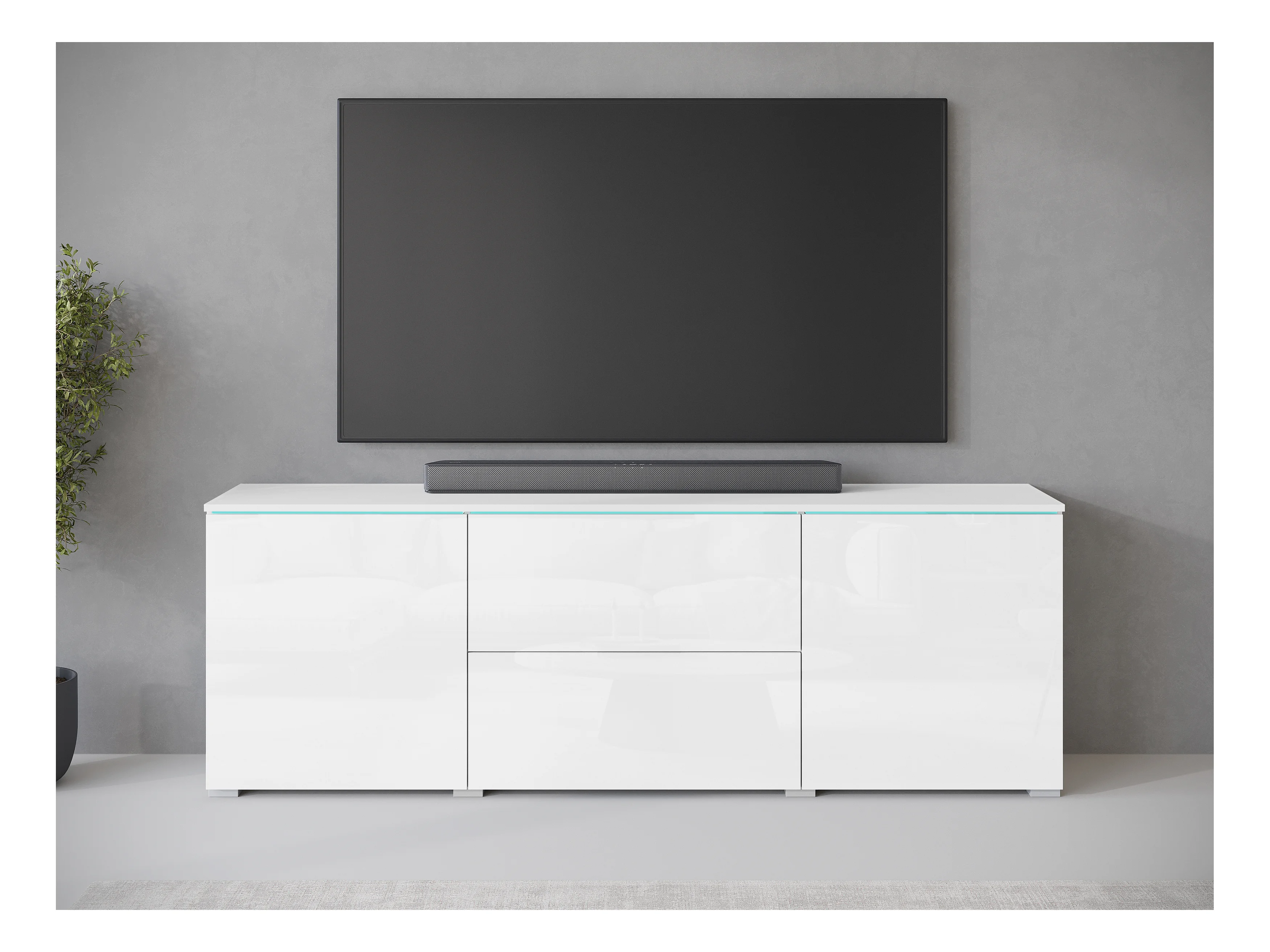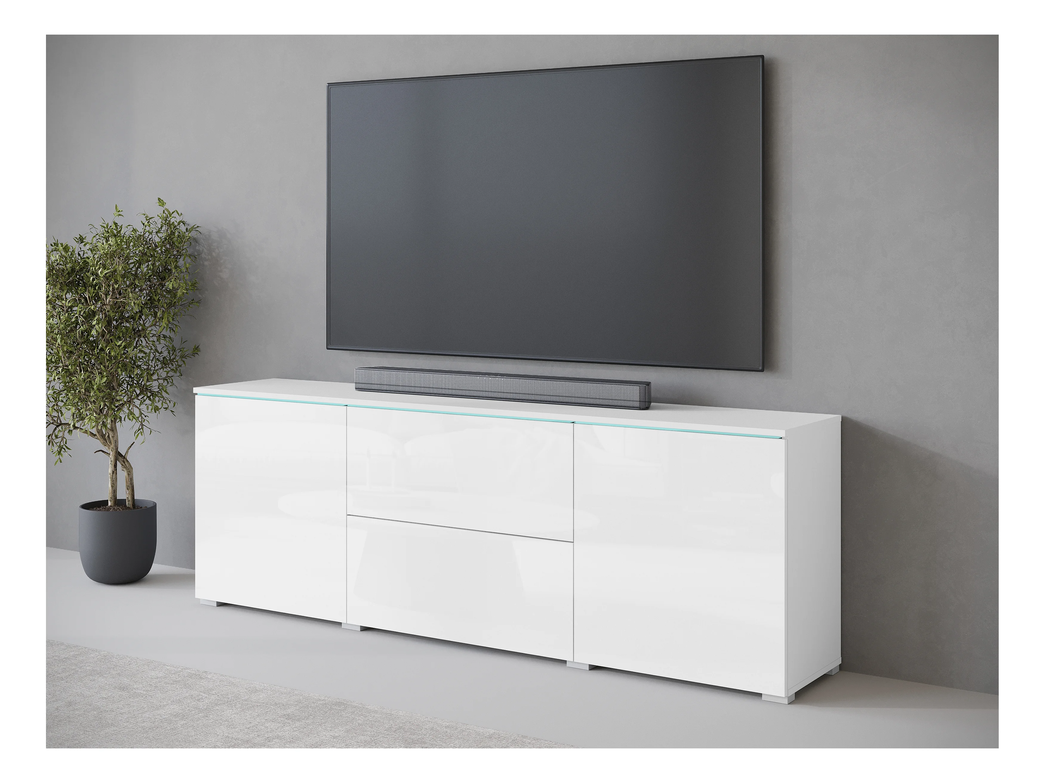 Meuble bas TV moderne 180 cm avec LED – meuble haut pour télévision avec tiroirs et étagères, caisson blanc mat, façades blanc brillant