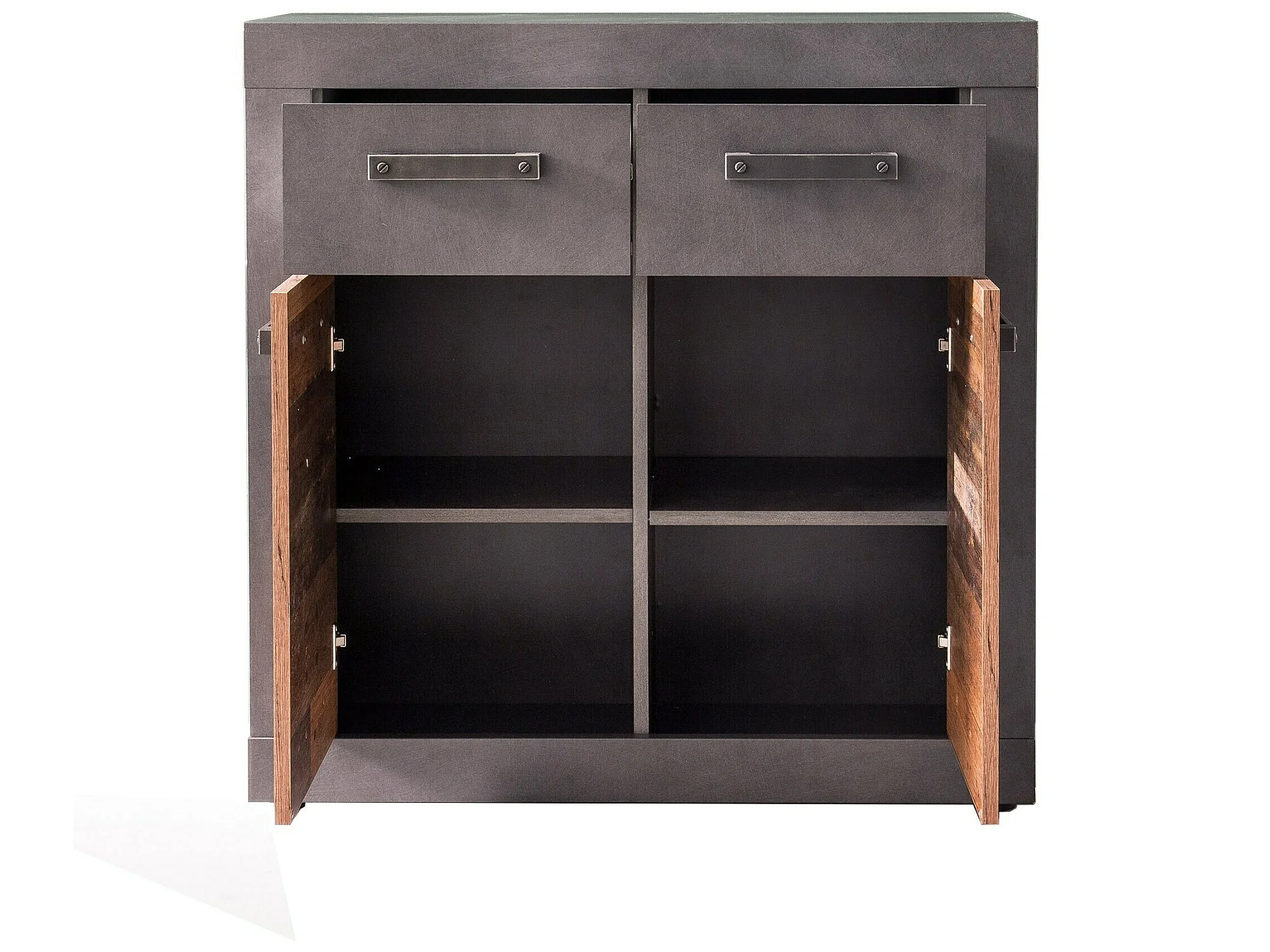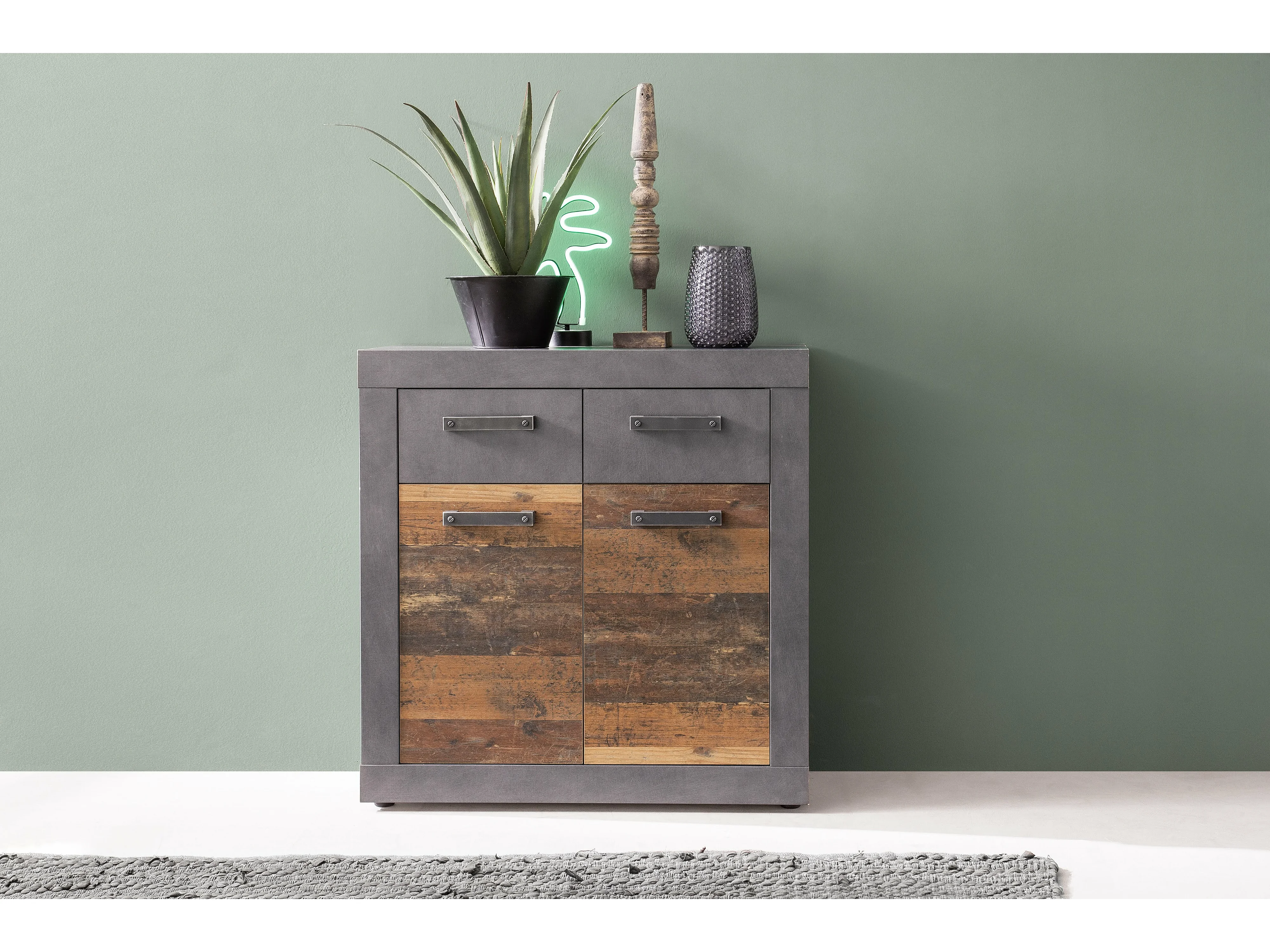 Meuble chambre. Commode avec 2 tiroirs en mélaminé coloris gris ciment portes bois effet vieilli . L - H - P : 82 - 86 - 37cm.