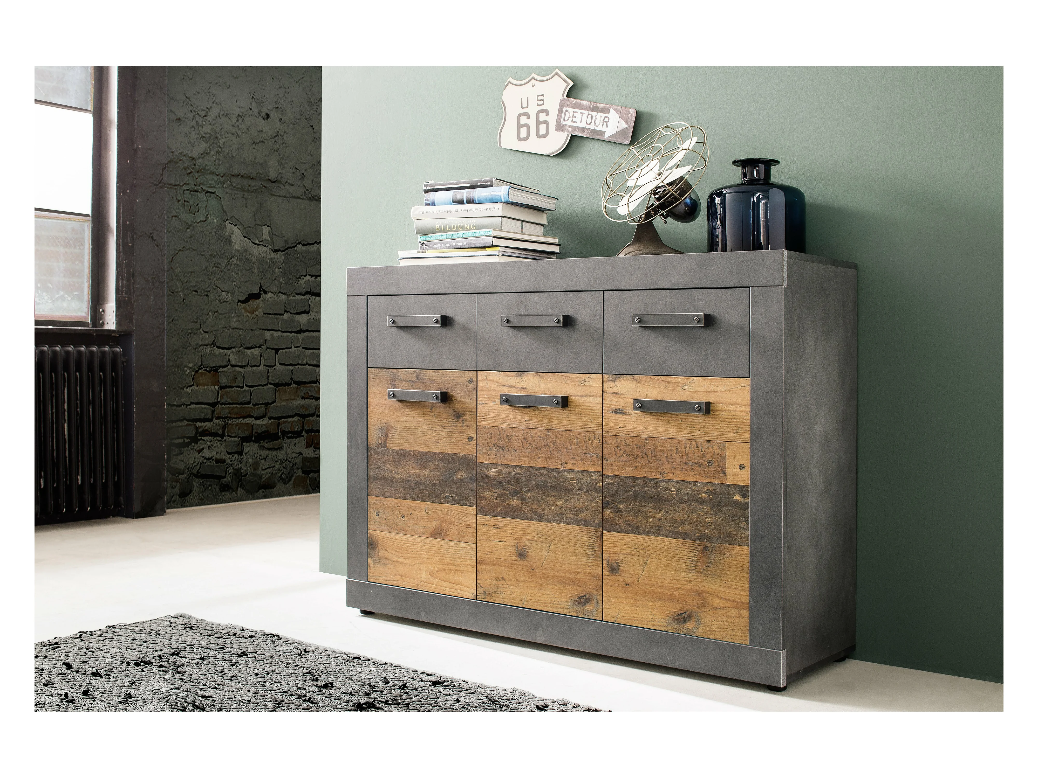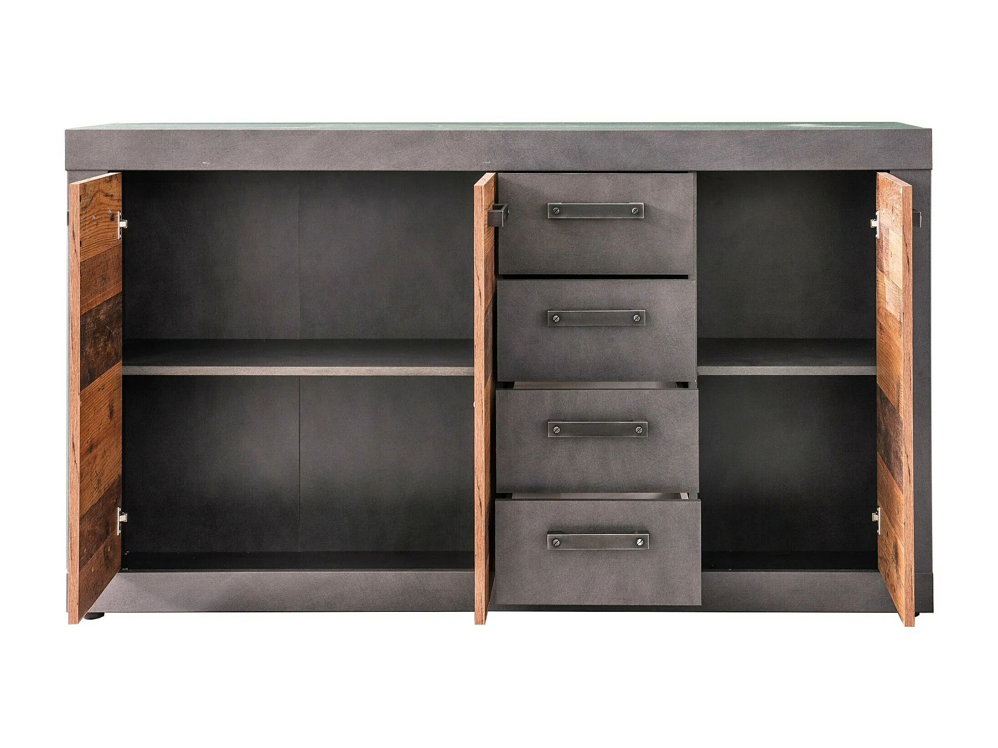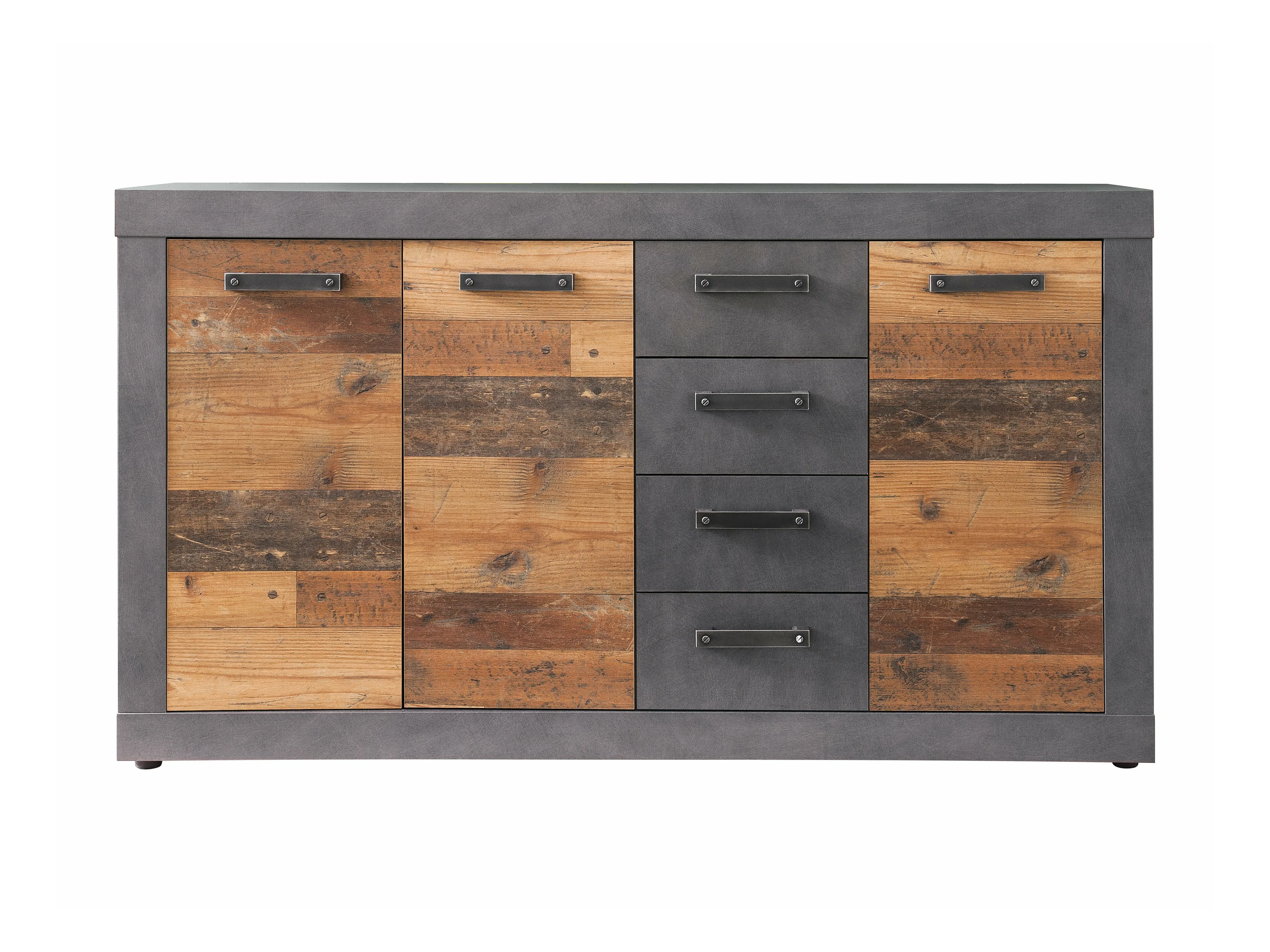 Meuble chambre. Commode avec 4 tiroirs en mélaminé coloris gris ciment portes bois effet vieilli. L - H - P : 151 - 86 - 37 cm.