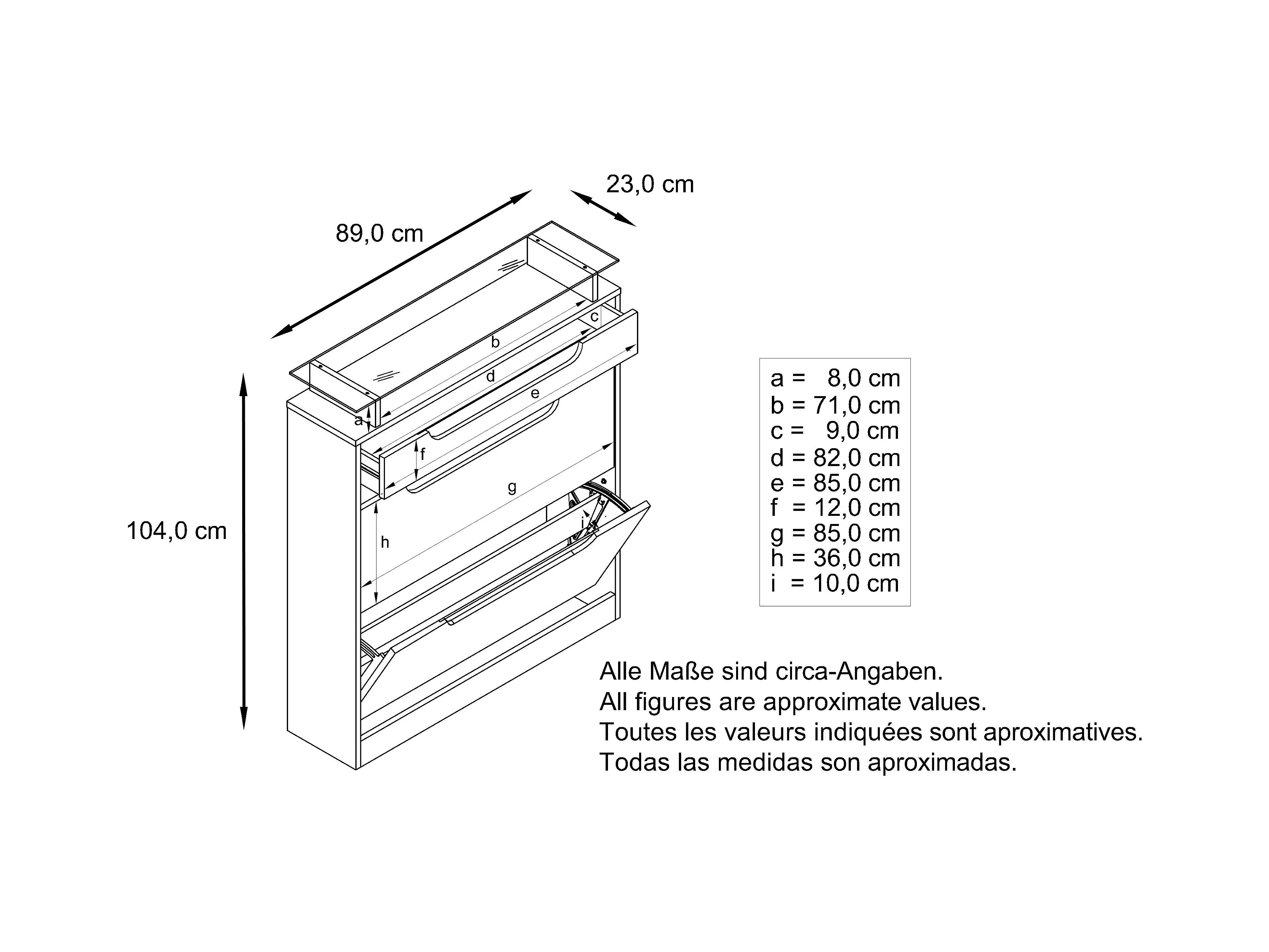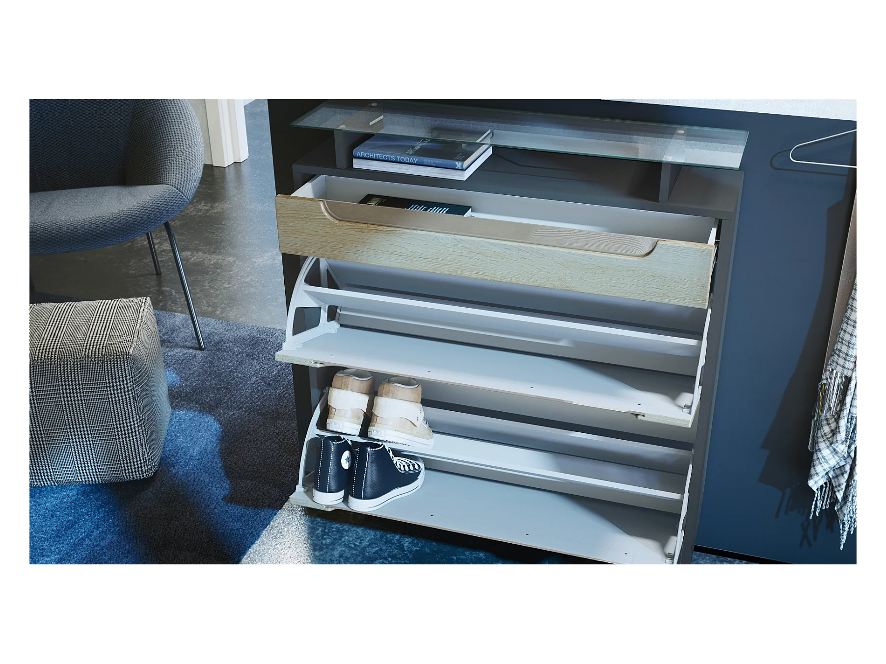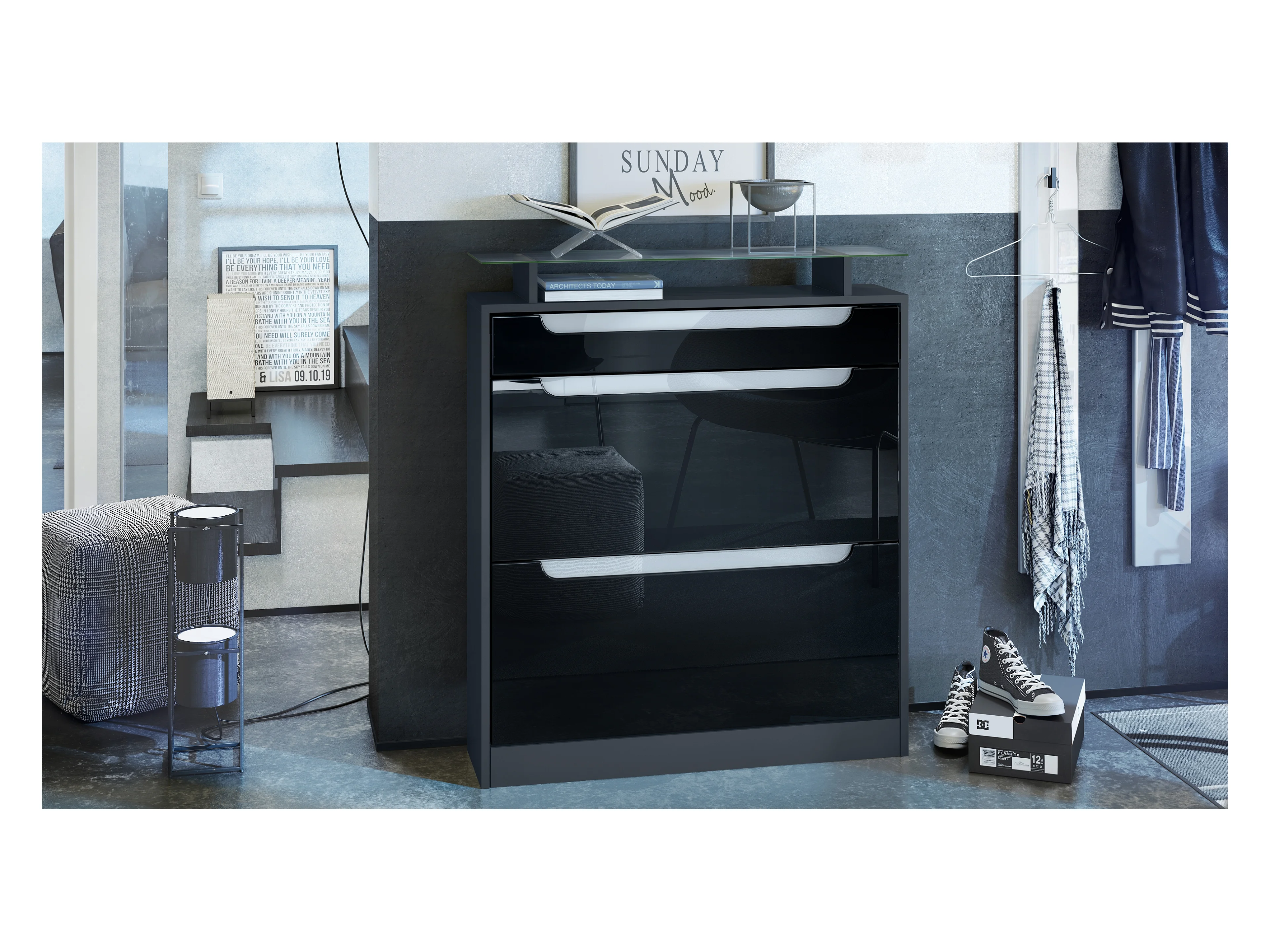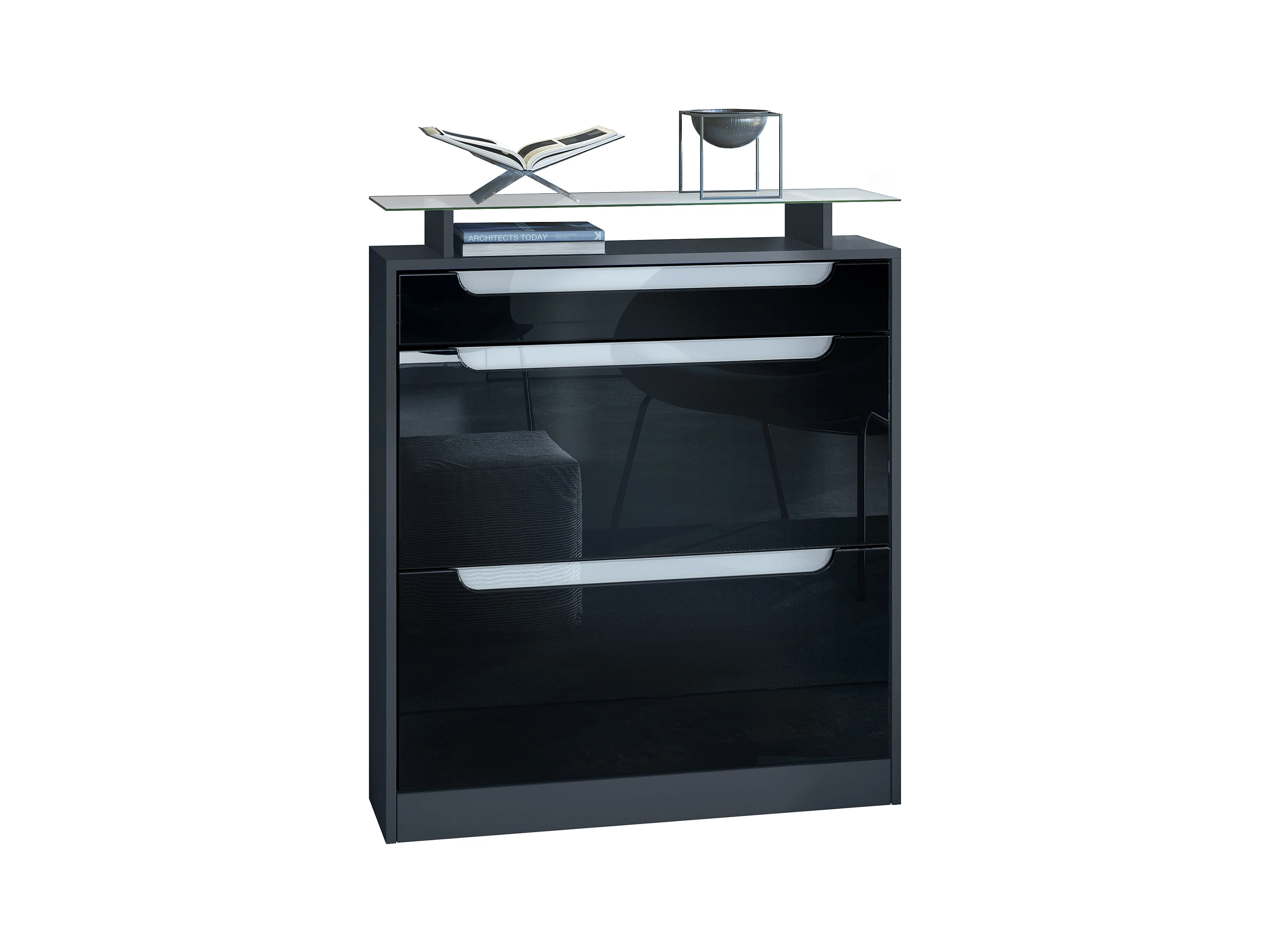 Meuble chaussure Fiesta pour 16 paires de chaussures avec clapets et tablette en verre, Anthracite mat/Noir brillant, poignées Blanc brillant (89x104x23 cm)