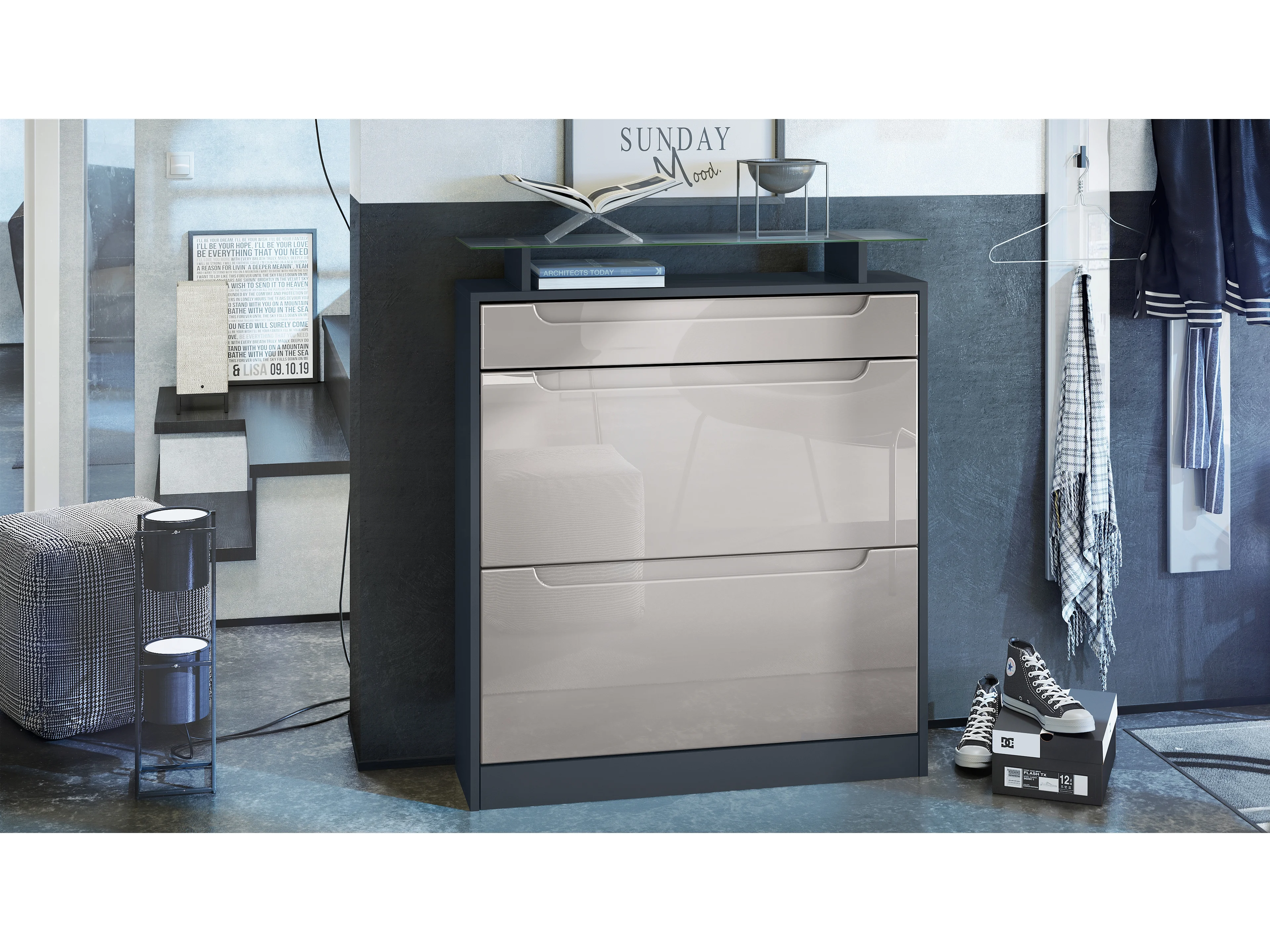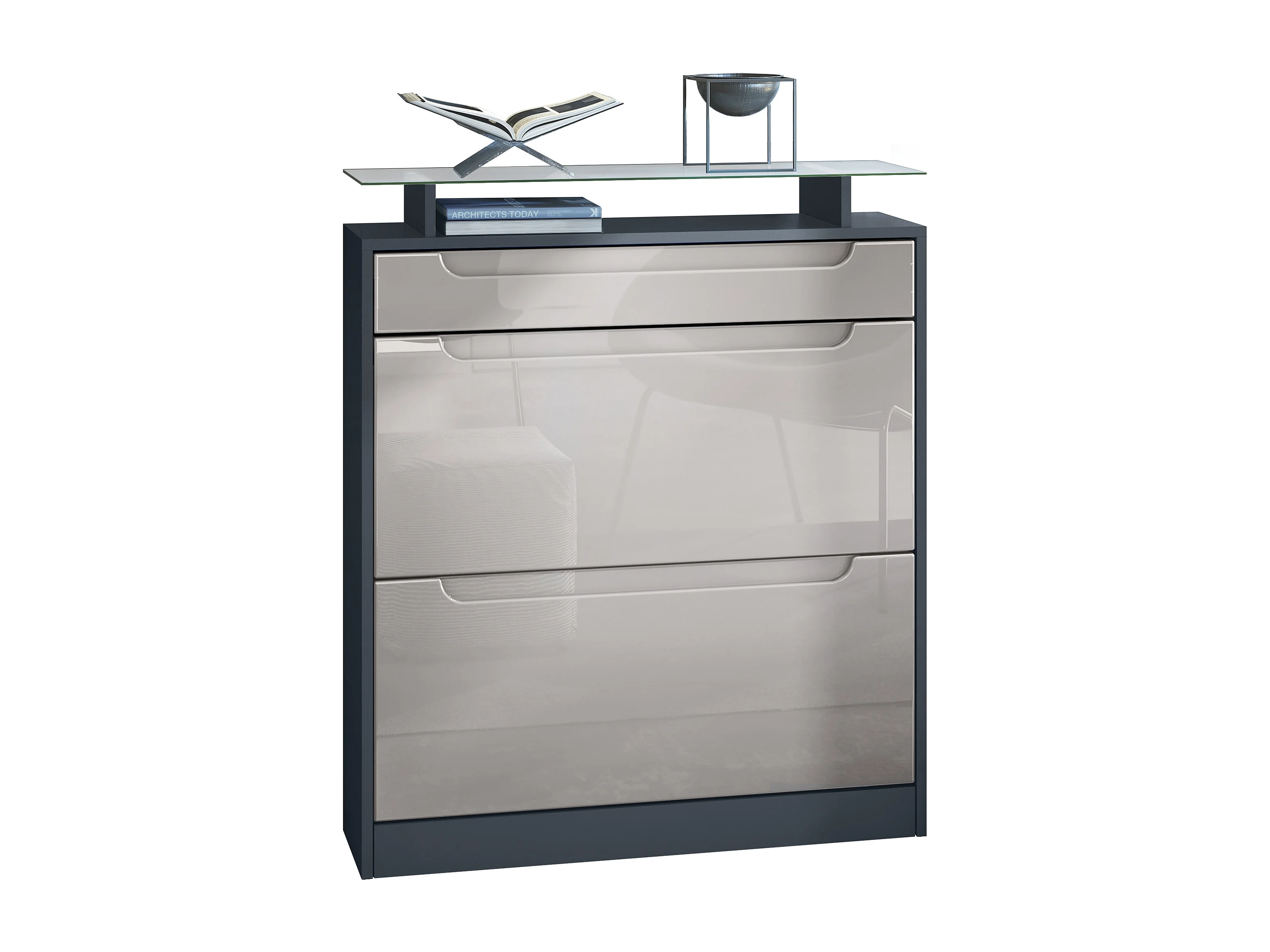 Meuble chaussure Fiesta pour 16 paires de chaussures, avec tablette en verre, Anthracite mat/Gris sable brillant, poignées Gris sable brillant (89x104x23 cm)