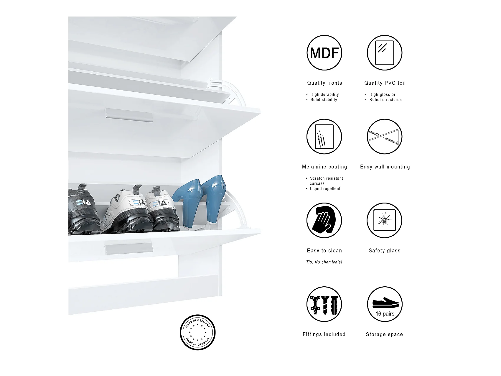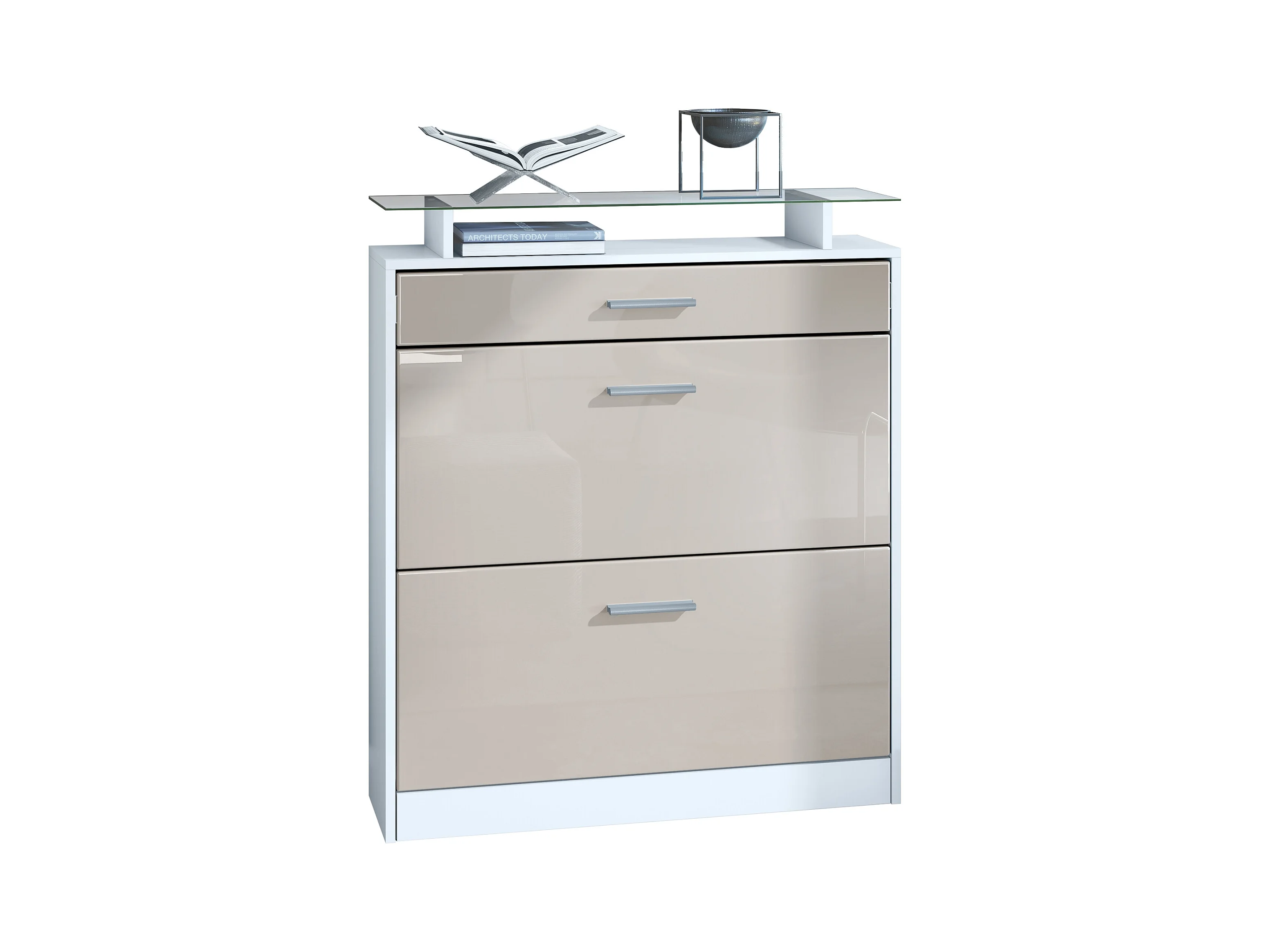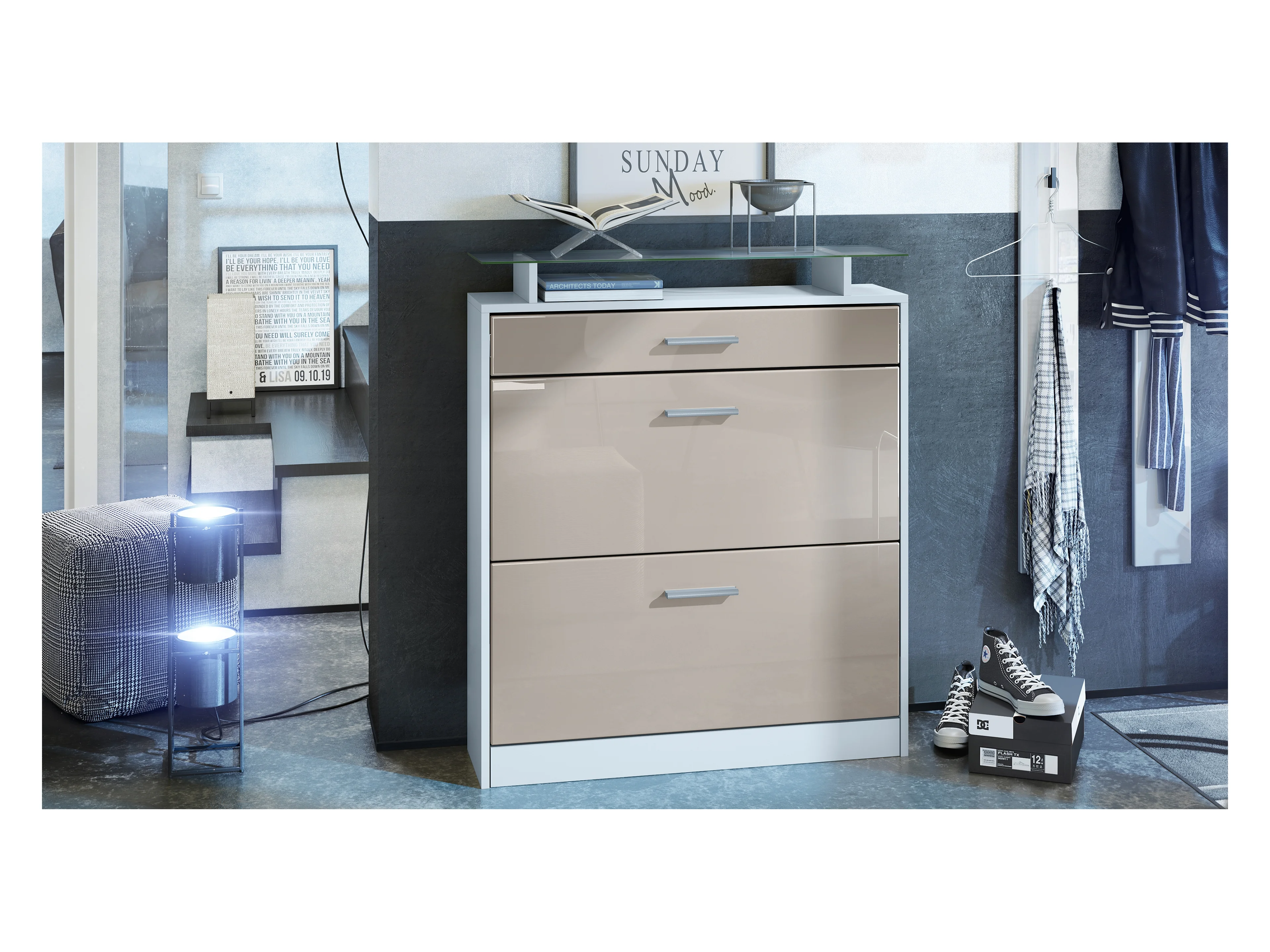 Meuble chaussure Loret, Étagère à chaussures pour 16 paires de chaussures avec 2 clapets à bascule, 1 tiroir, Blanc mat/Gris sable brillant (89 x 104 x 23 cm)