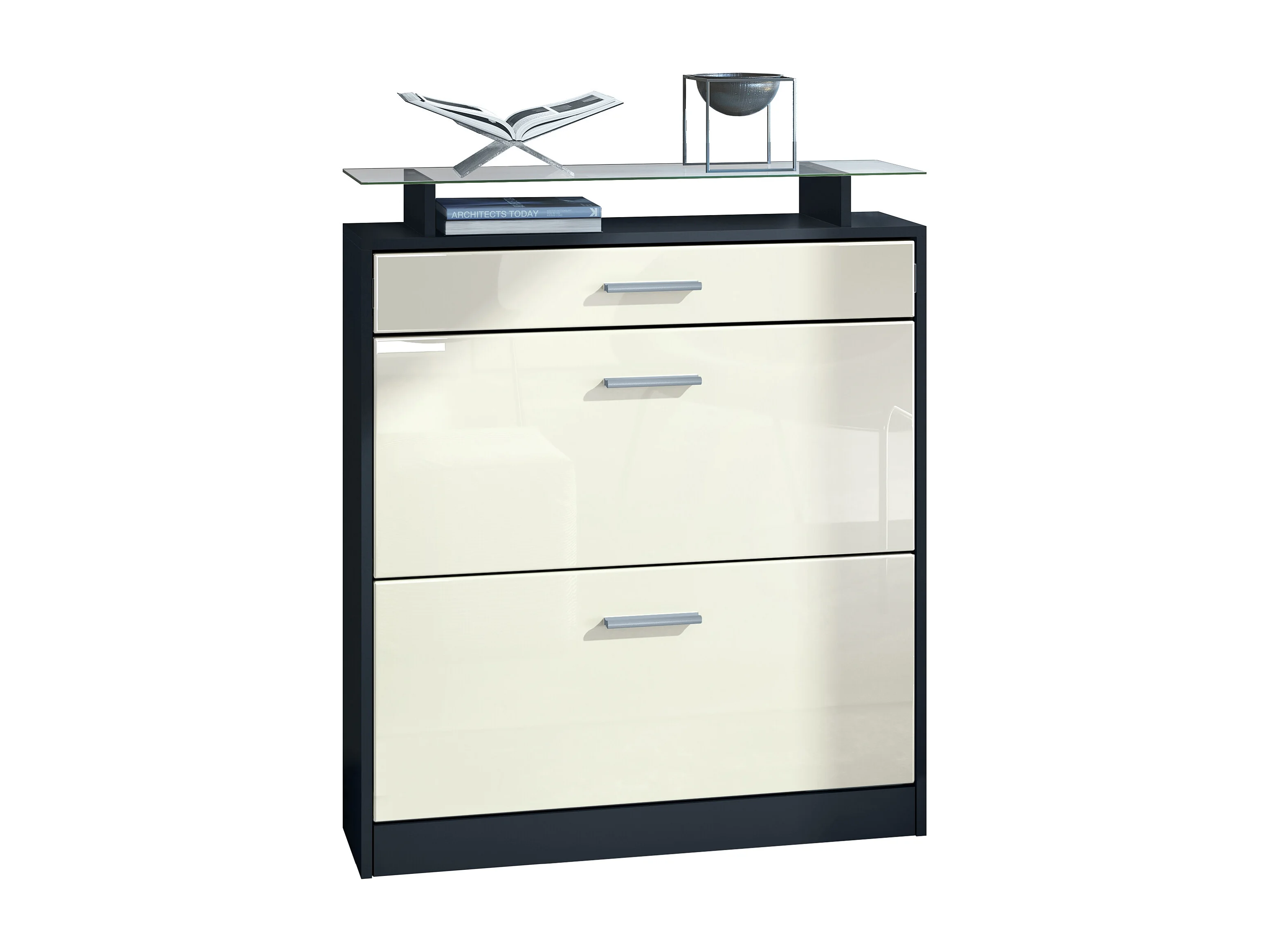Meuble chaussure Loret, Étagère à chaussures pour 16 paires de chaussures avec 2 clapets à bascule, 1 tiroir, Noir mat/Crème brillant (89 x 104 x 23 cm)