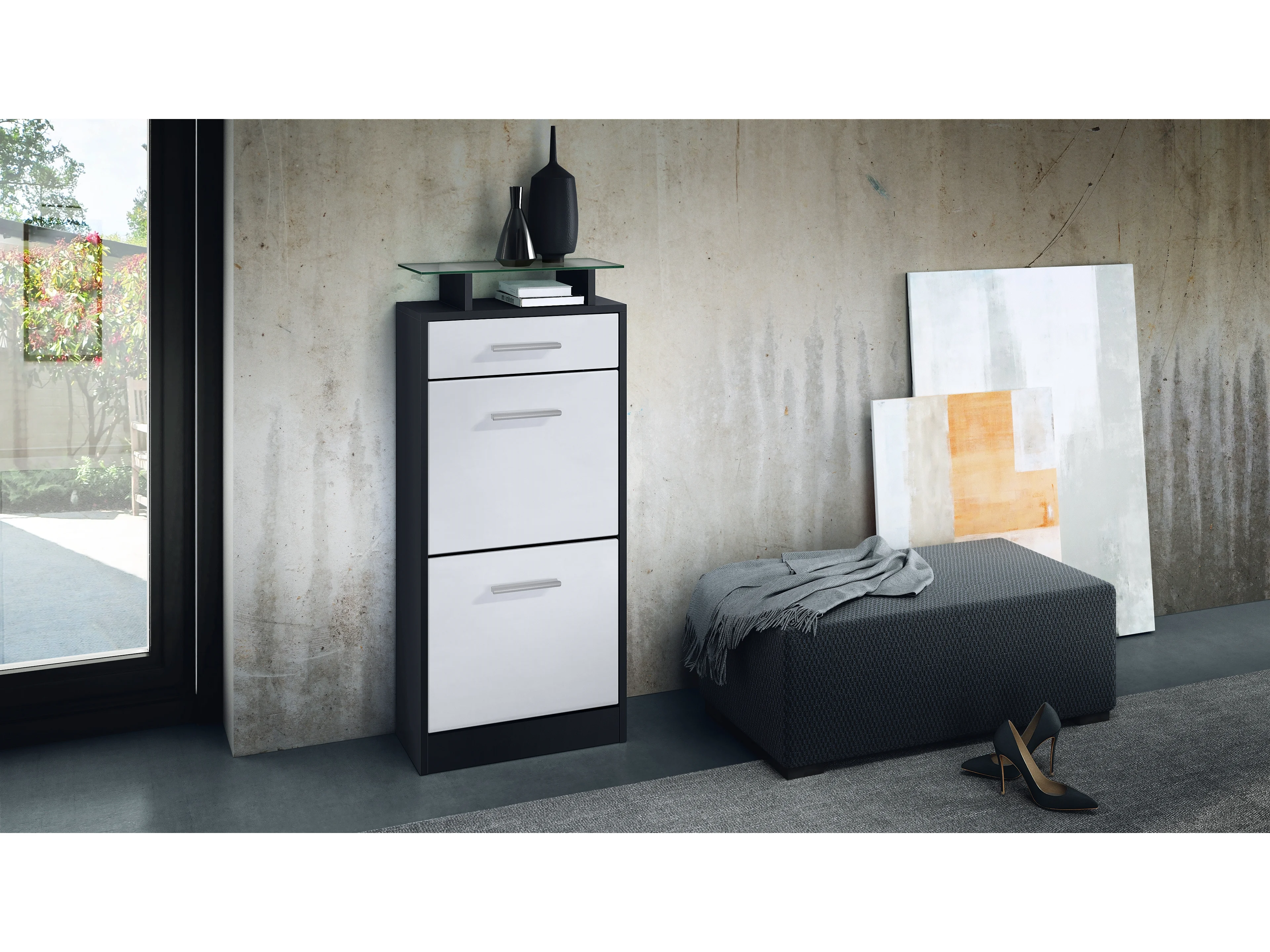 Meuble à chaussures Fiesta V2, Corps en Noir mat / Façades en Blanc haute brillance avec un decor en Noir haute brillance