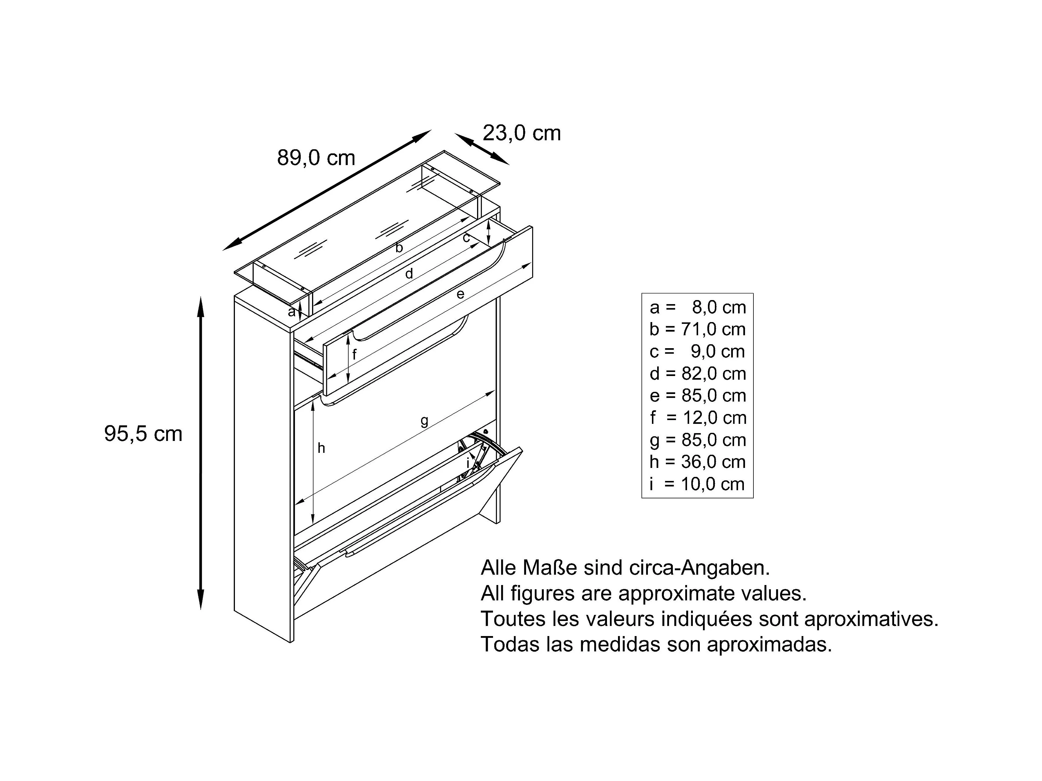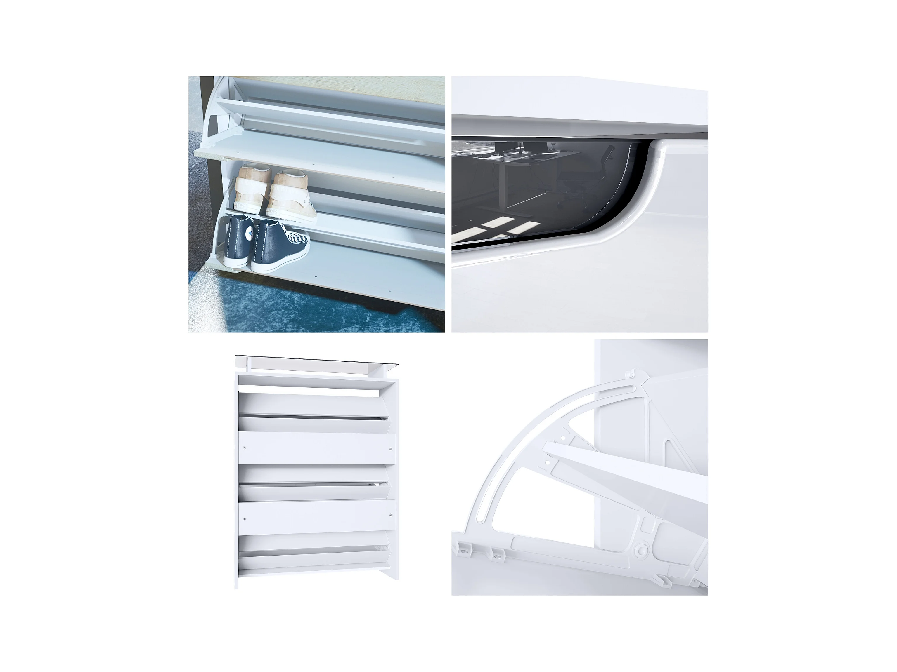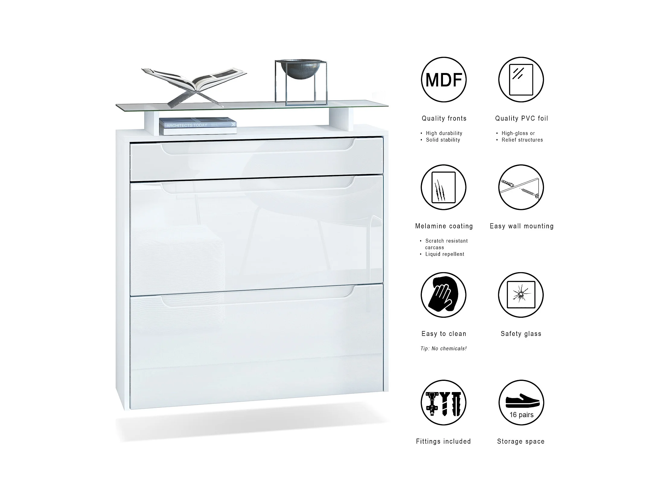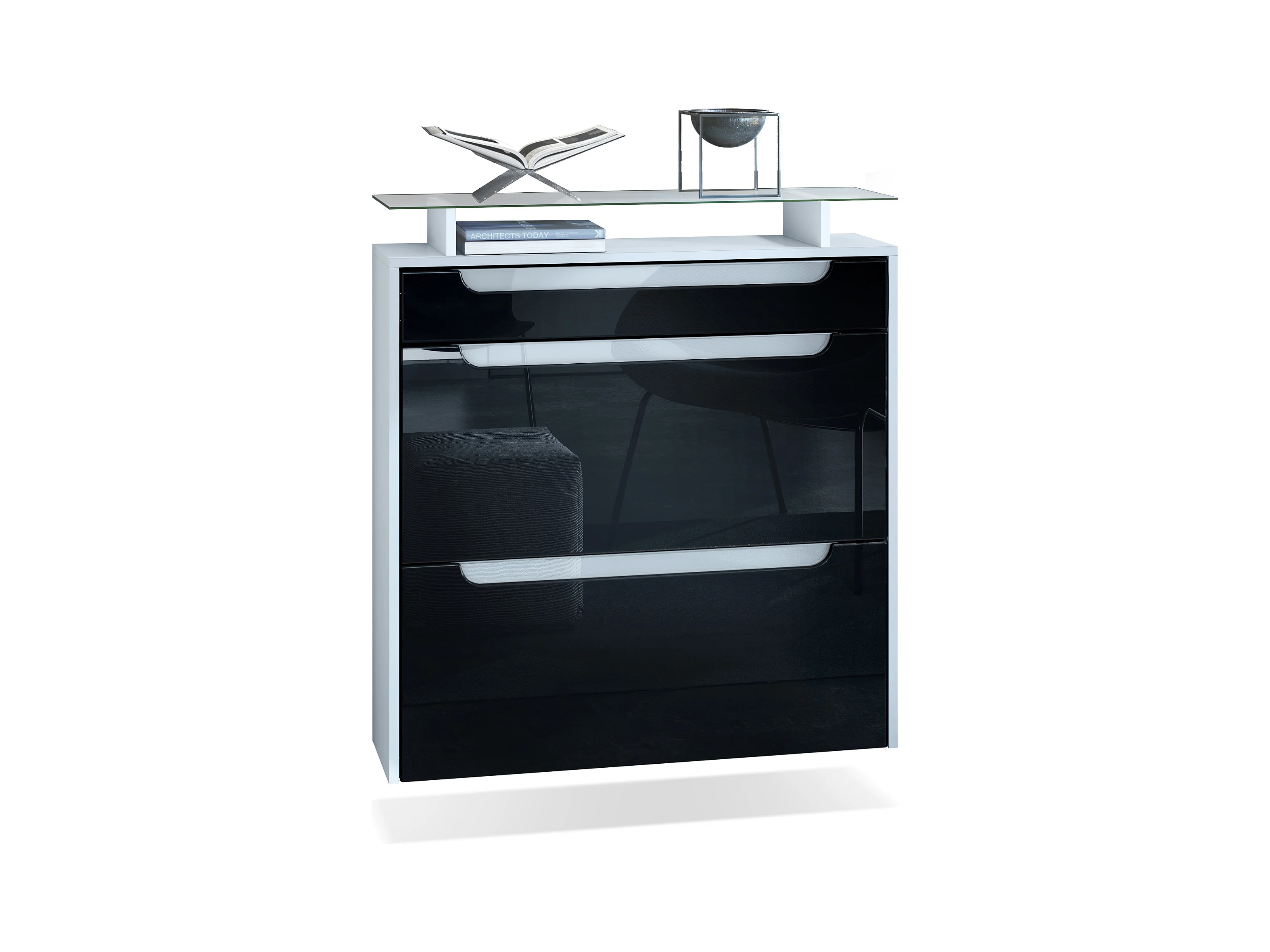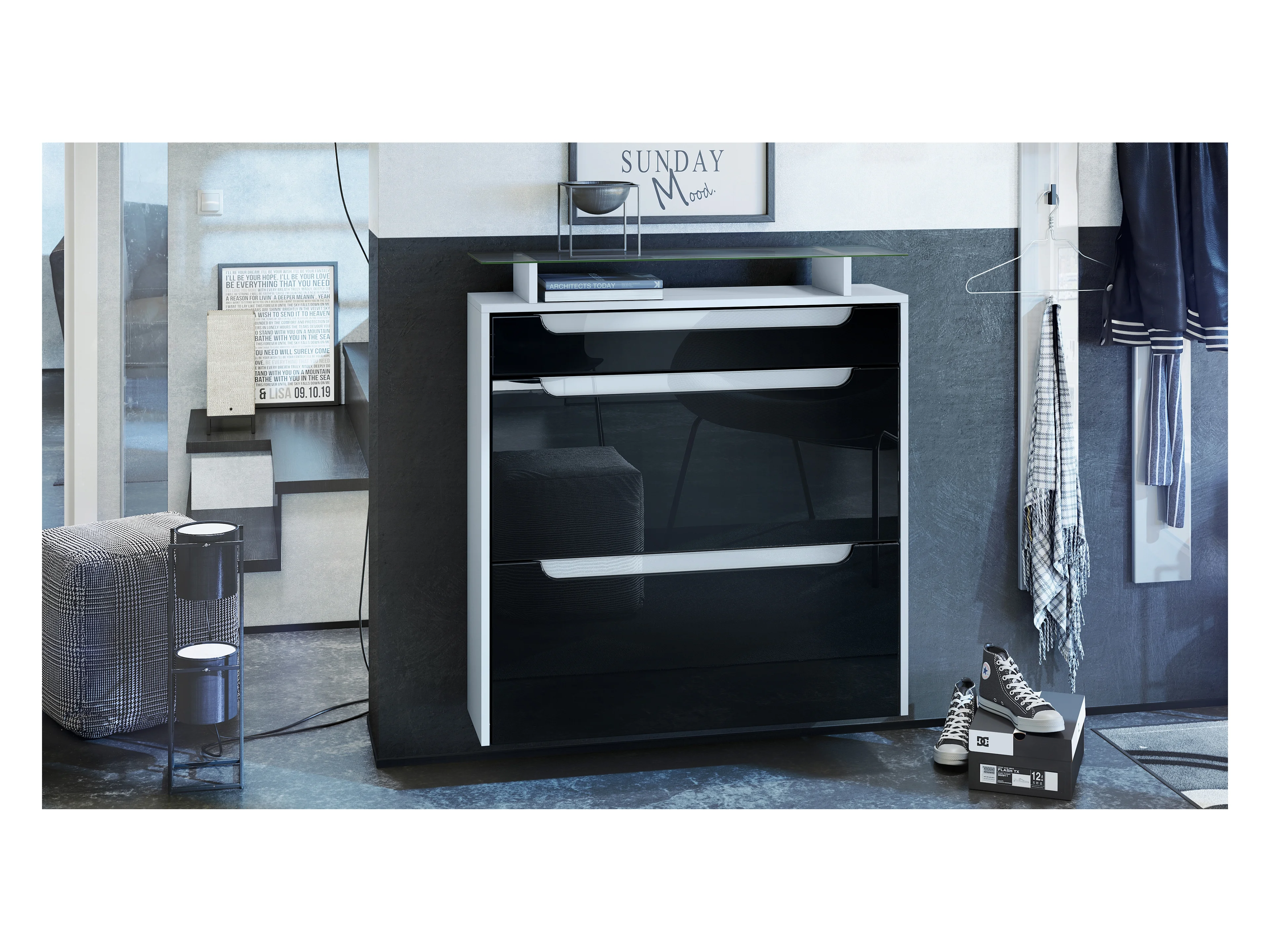 Meuble chaussures Annie pour 16 paires de chaussures avec 2 clapets et 1 tablette en verre, Blanc mat/Noir haute brillance (89 x 96 x 23 cm)