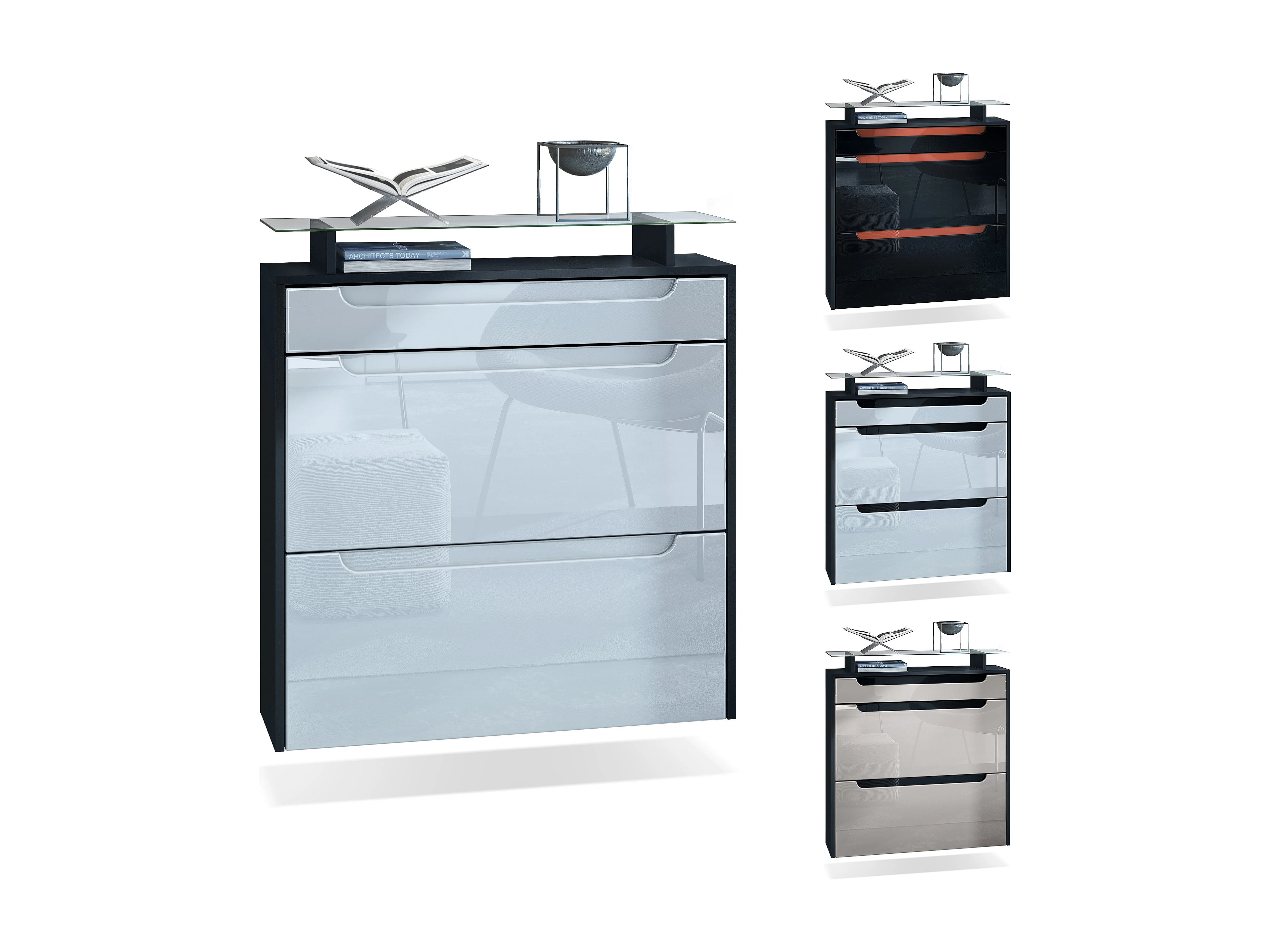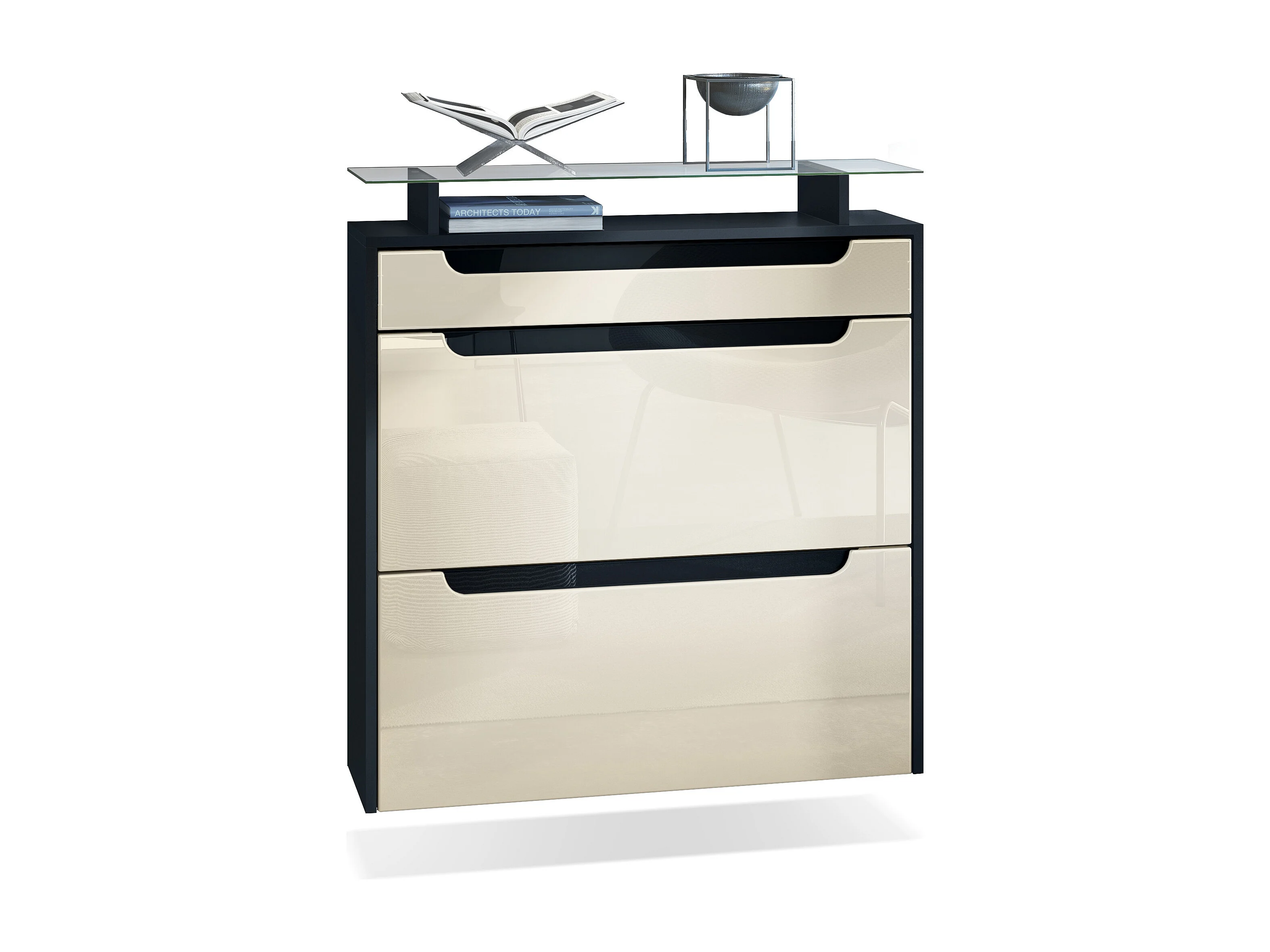 Meuble chaussures Annie pour 16 paires de chaussures avec 2 clapets et 1 tablette en verre, Noir mat/Crème haute brillance (89 x 96 x 23 cm)