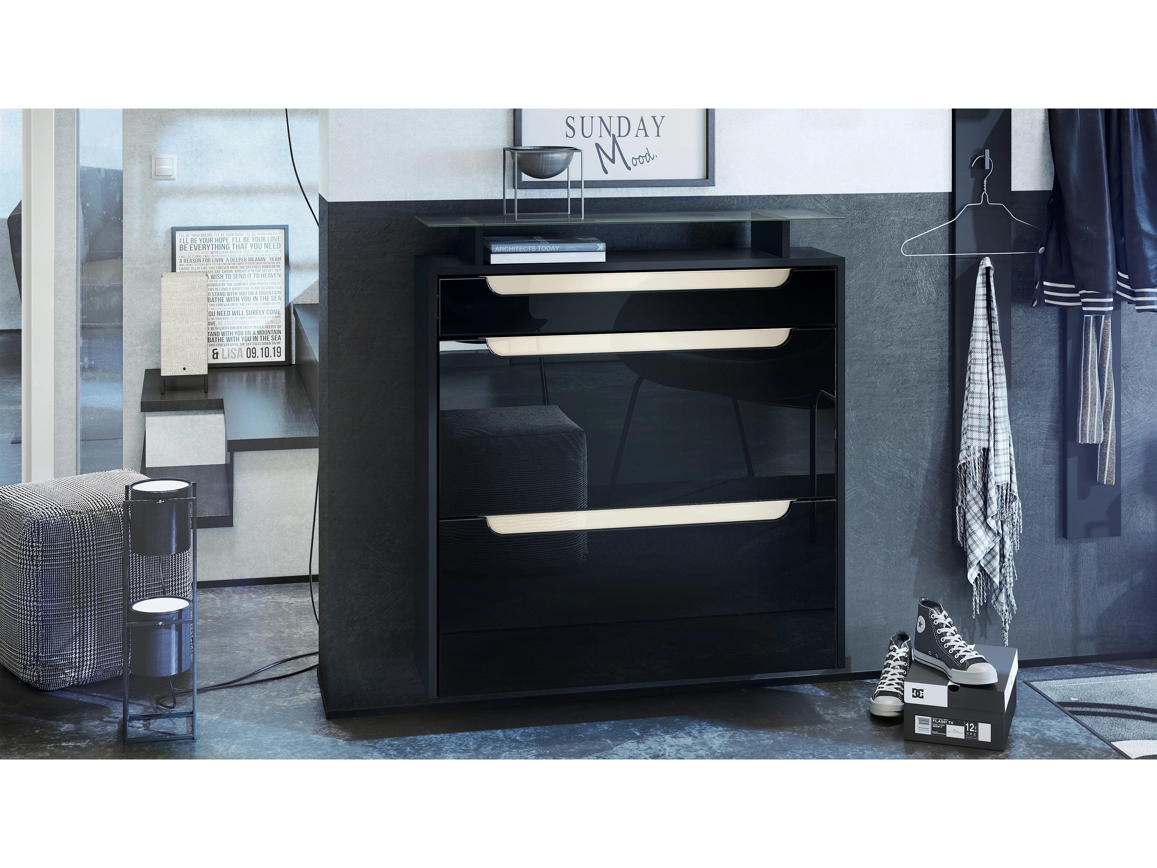 Meuble chaussures Annie pour 16 paires de chaussures avec 2 clapets et 1 tablette en verre, Noir mat/Noir haute brillance (89 x 96 x 23 cm)