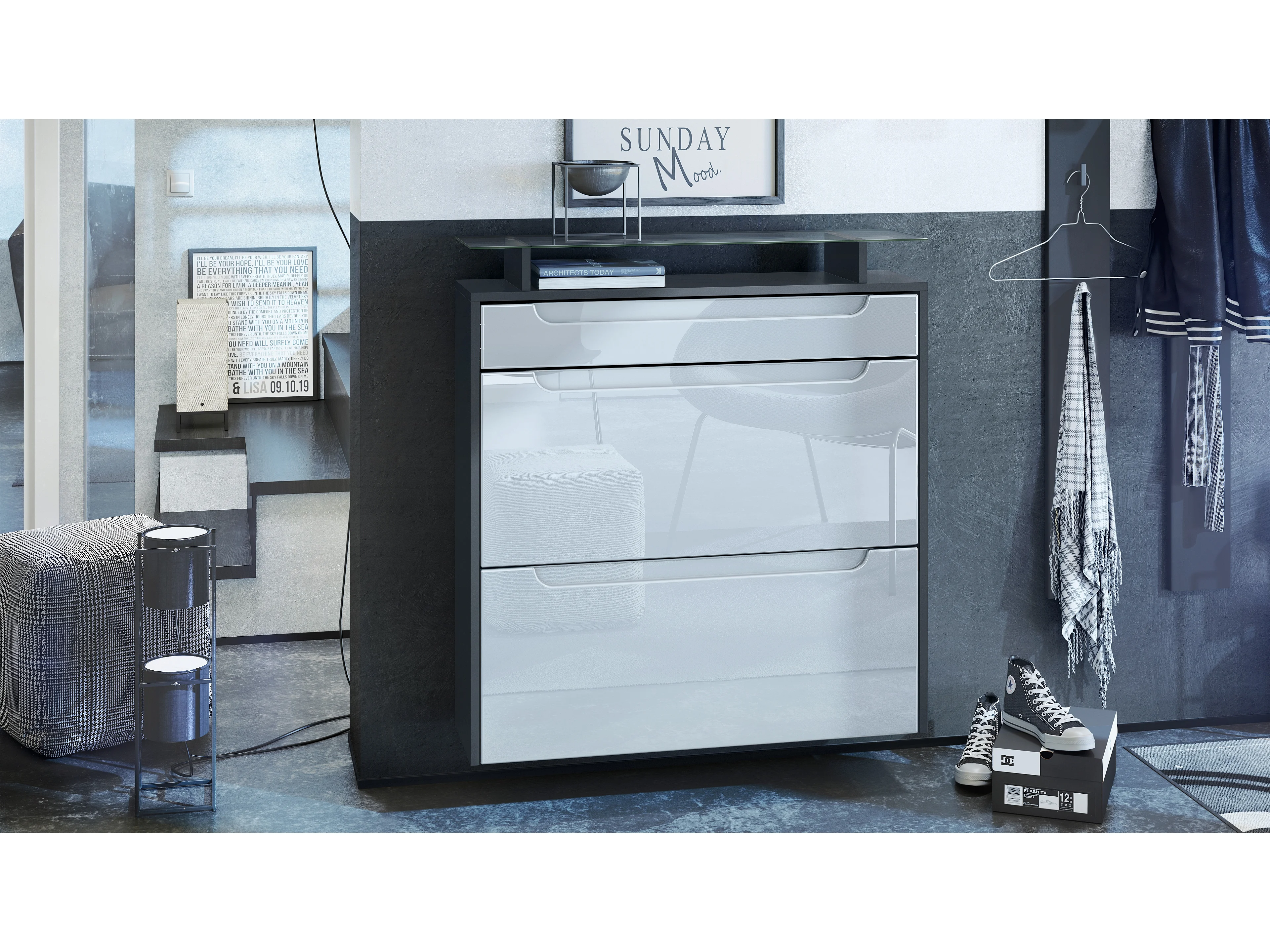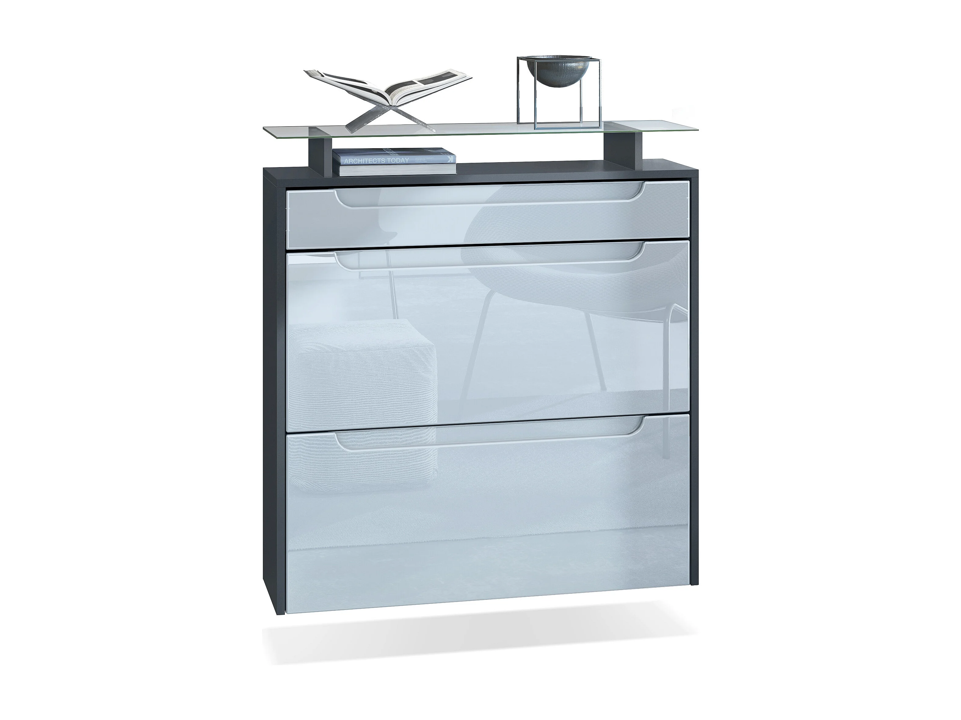 Meuble chaussures Annie pour 16 paires de chaussures avec clapets et tablette en verre, Anthracite mat/Blanc brillant, poignées Blanc brillant (89x96x23 cm)