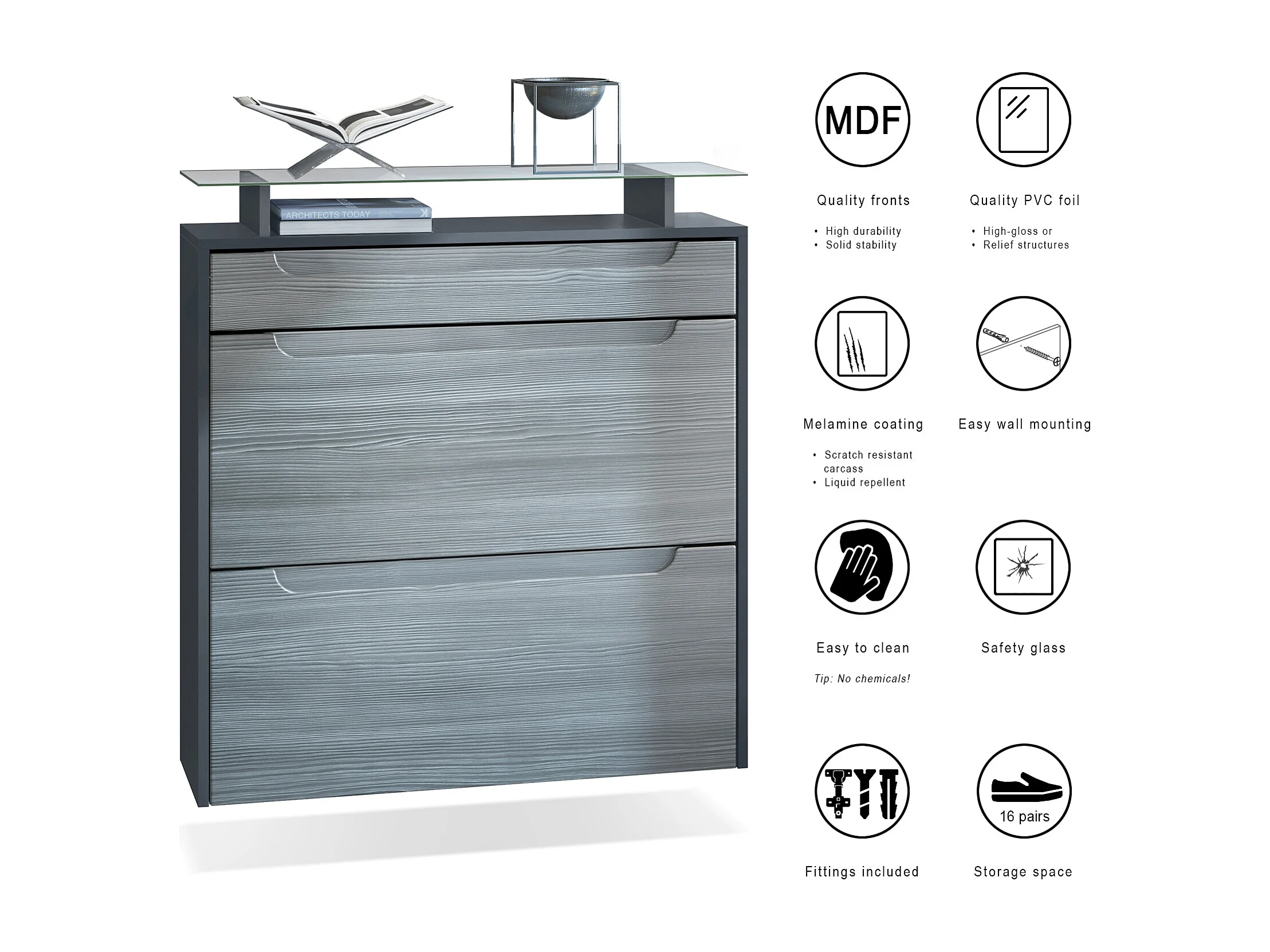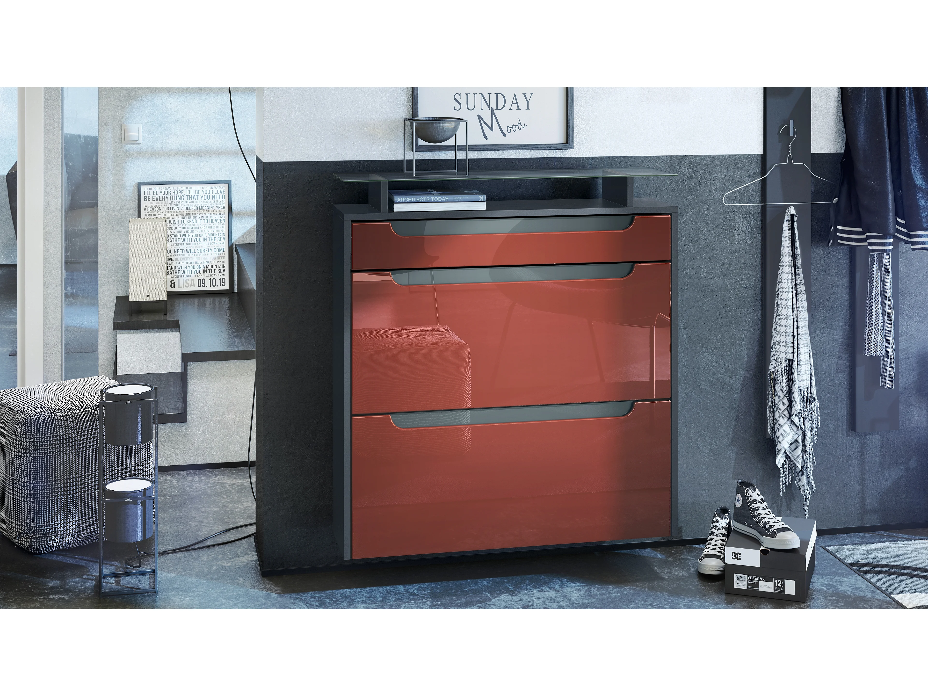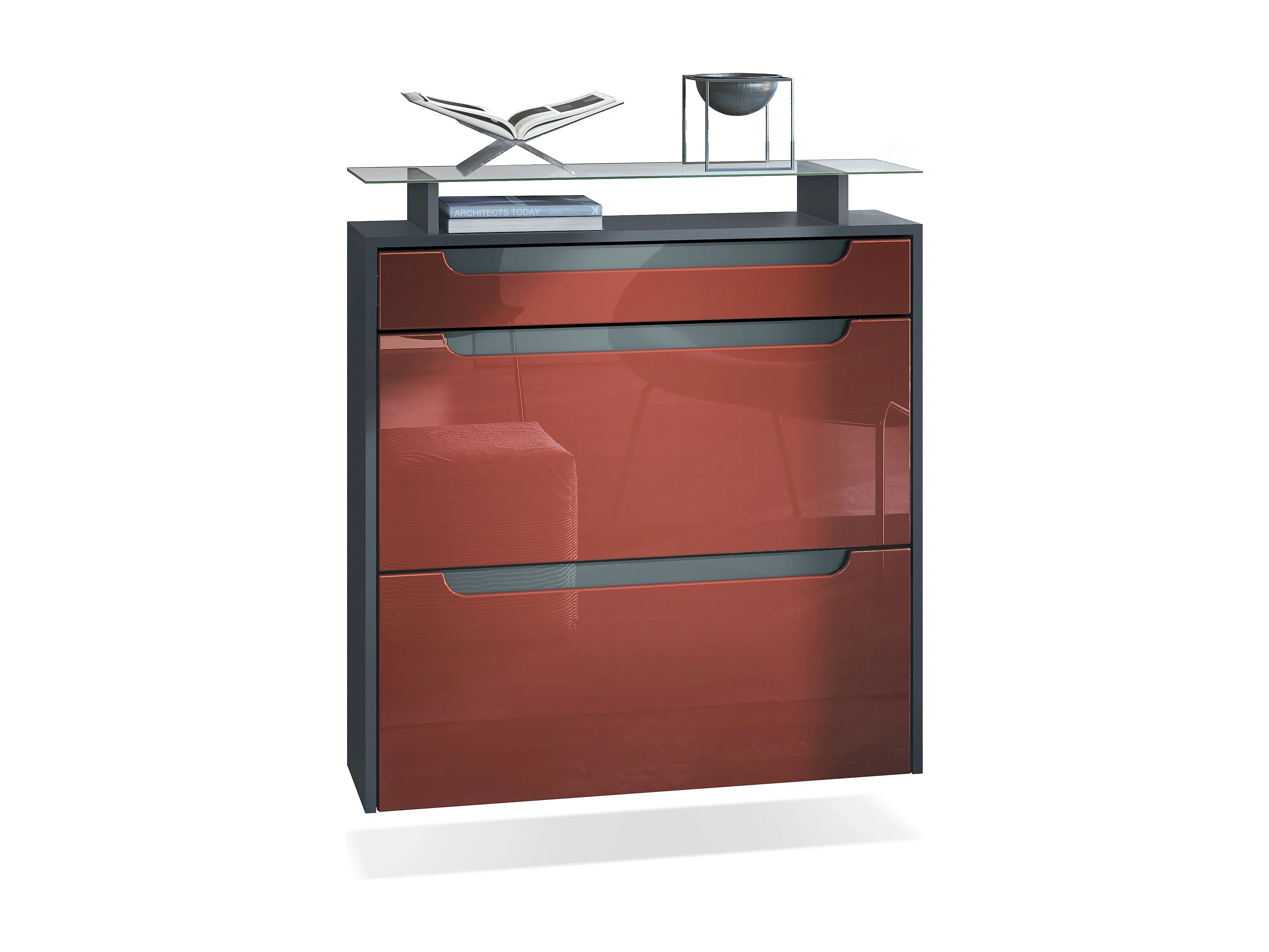 Meuble chaussures Annie pour 16 paires de chaussures avec clapets et tablette en verre, Anthracite mat/Bordeaux brillant, poignées Gris brillant (89x96x23 cm)