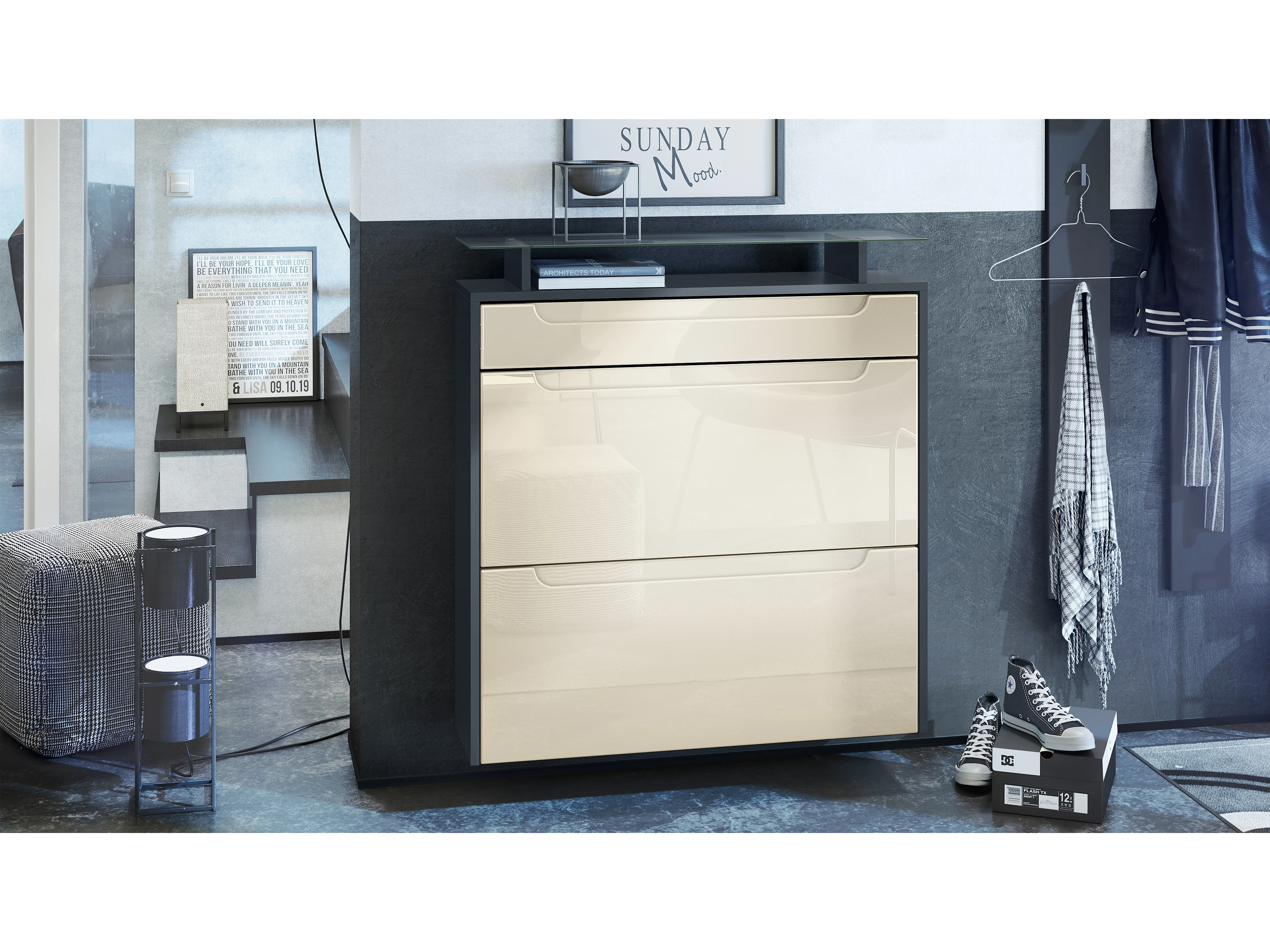 Meuble chaussures Annie pour 16 paires de chaussures avec clapets et tablette en verre, Anthracite mat/Crème brillant, poignées Crème brillant (89x96x23 cm)