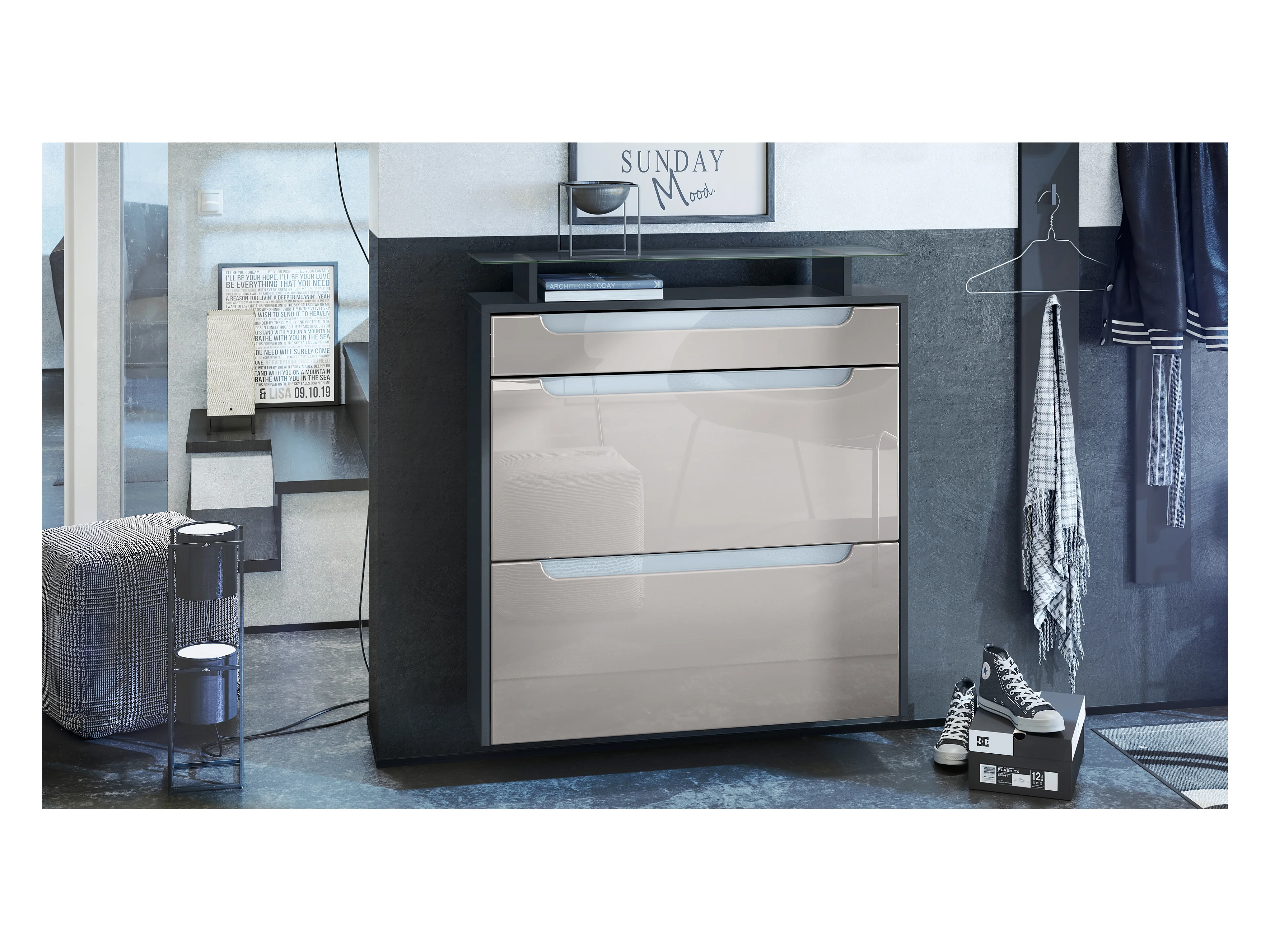 Meuble chaussures Annie pour 16 paires de chaussures, avec tablette en verre, Anthracite mat/Gris sable brillant , poignées Blanc brillant (89x96x23 cm)