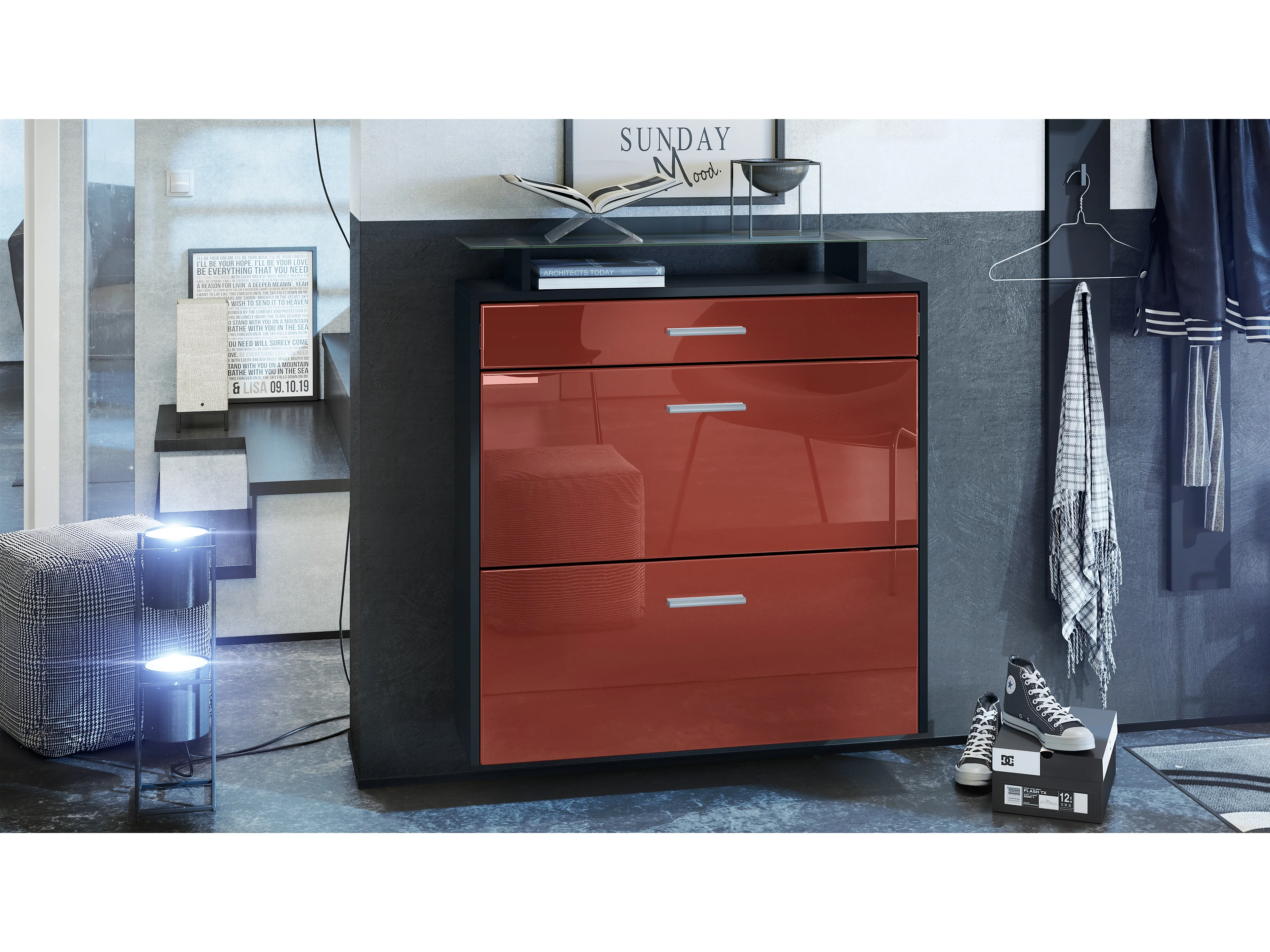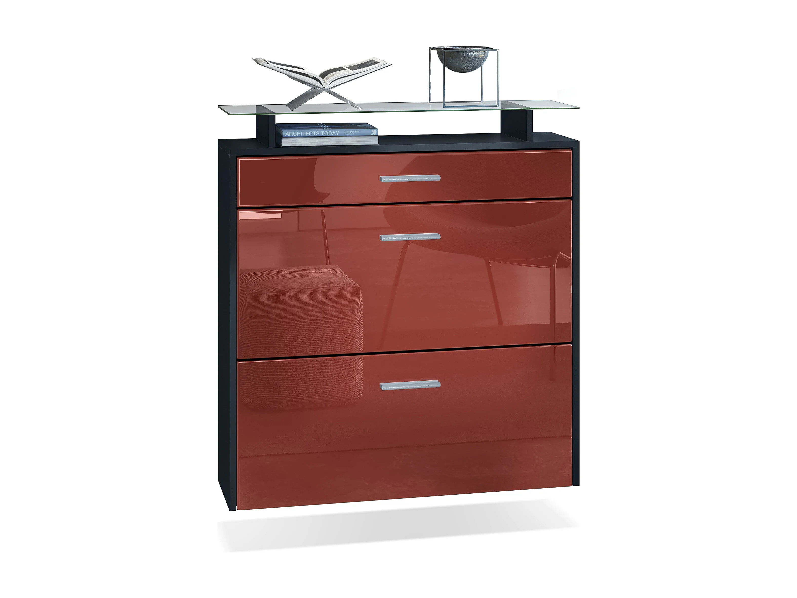 Meuble chaussures Malea, Armoire à chaussures murale pour 16 paires avec 2 clapets, 1 tiroir, Noir mat/Bordeaux brillant (89 x 96 x 23 cm)