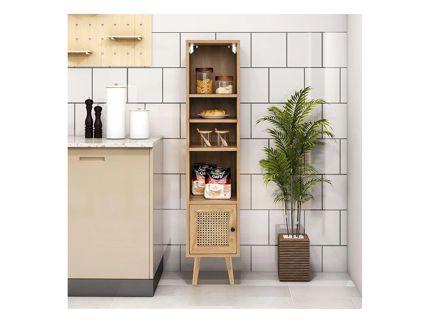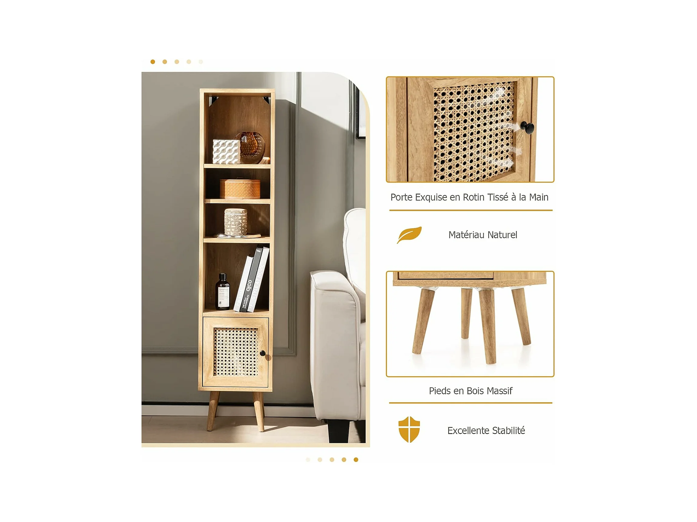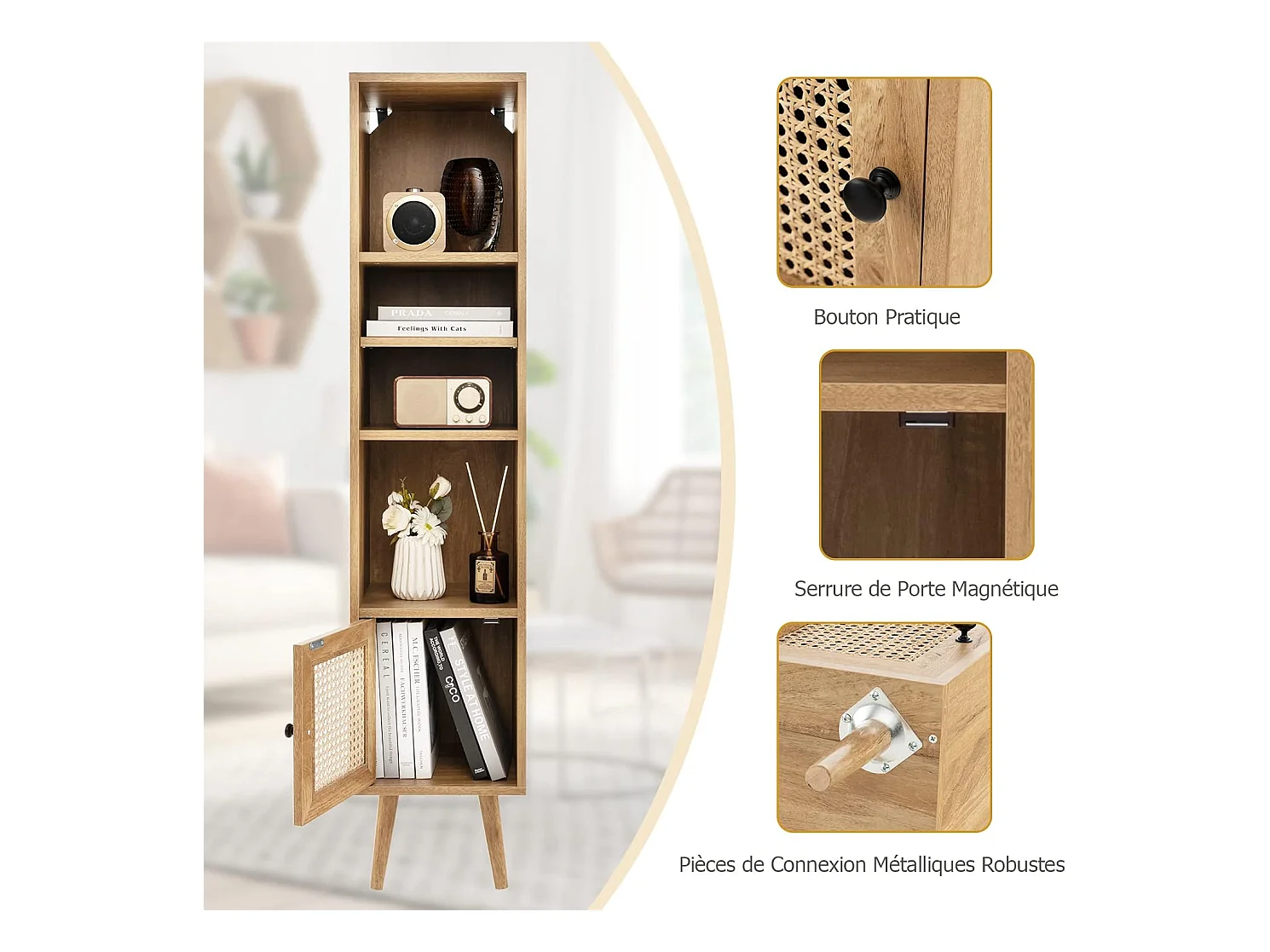 Meuble Colonne de Rangement avec Porte Rotin et Pieds en Bois Massif, Meuble de Salle de Bain Étagère Réglable, Style Bohème, pour Salon, Cuisine, Chambre, 29,5x29,5x137cm