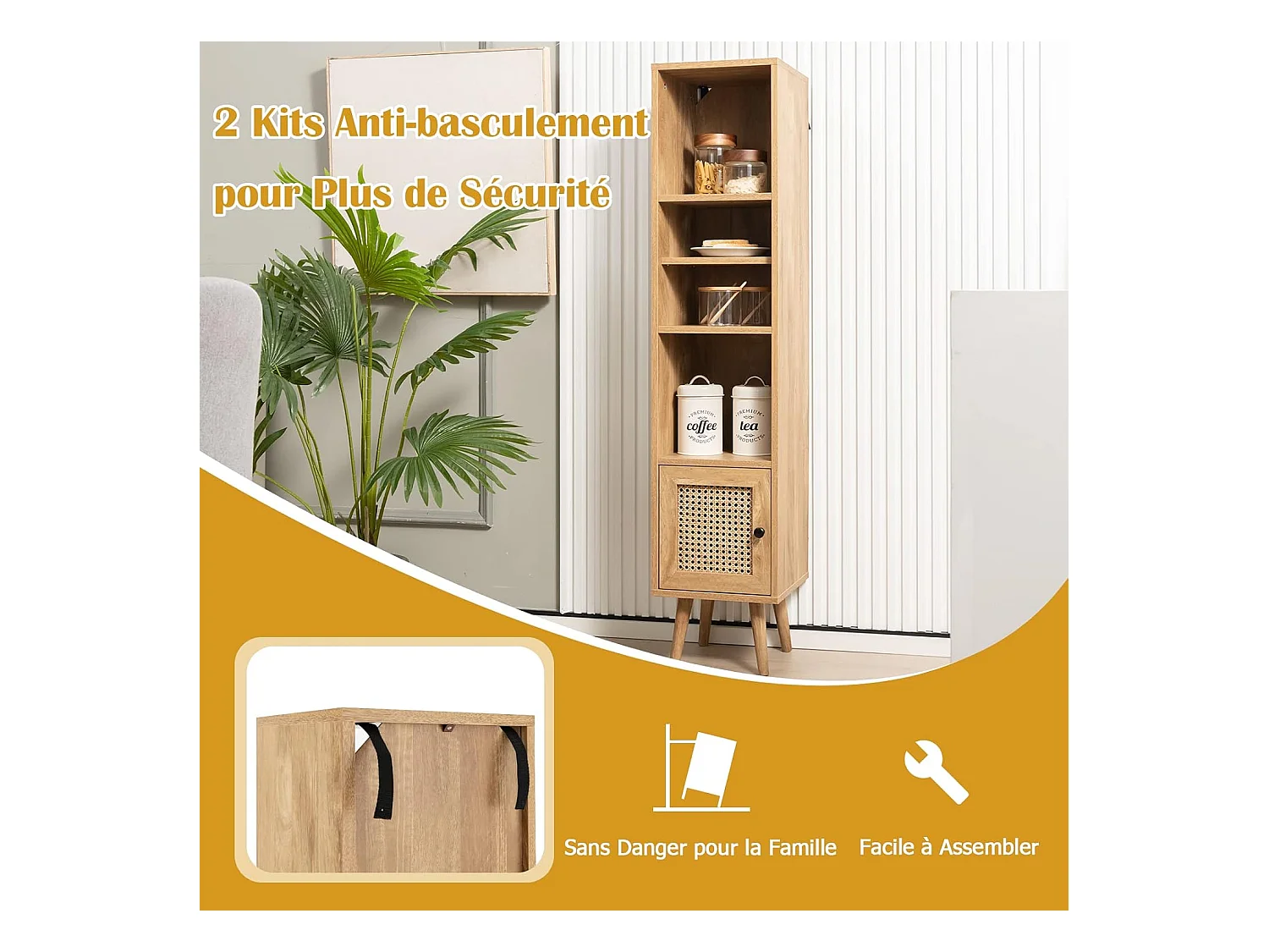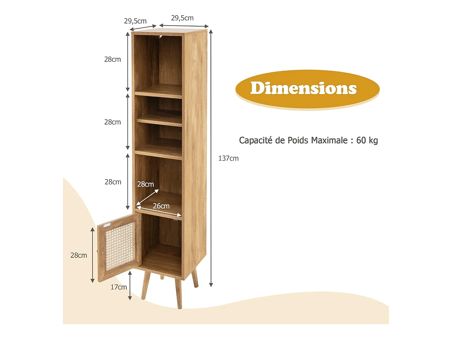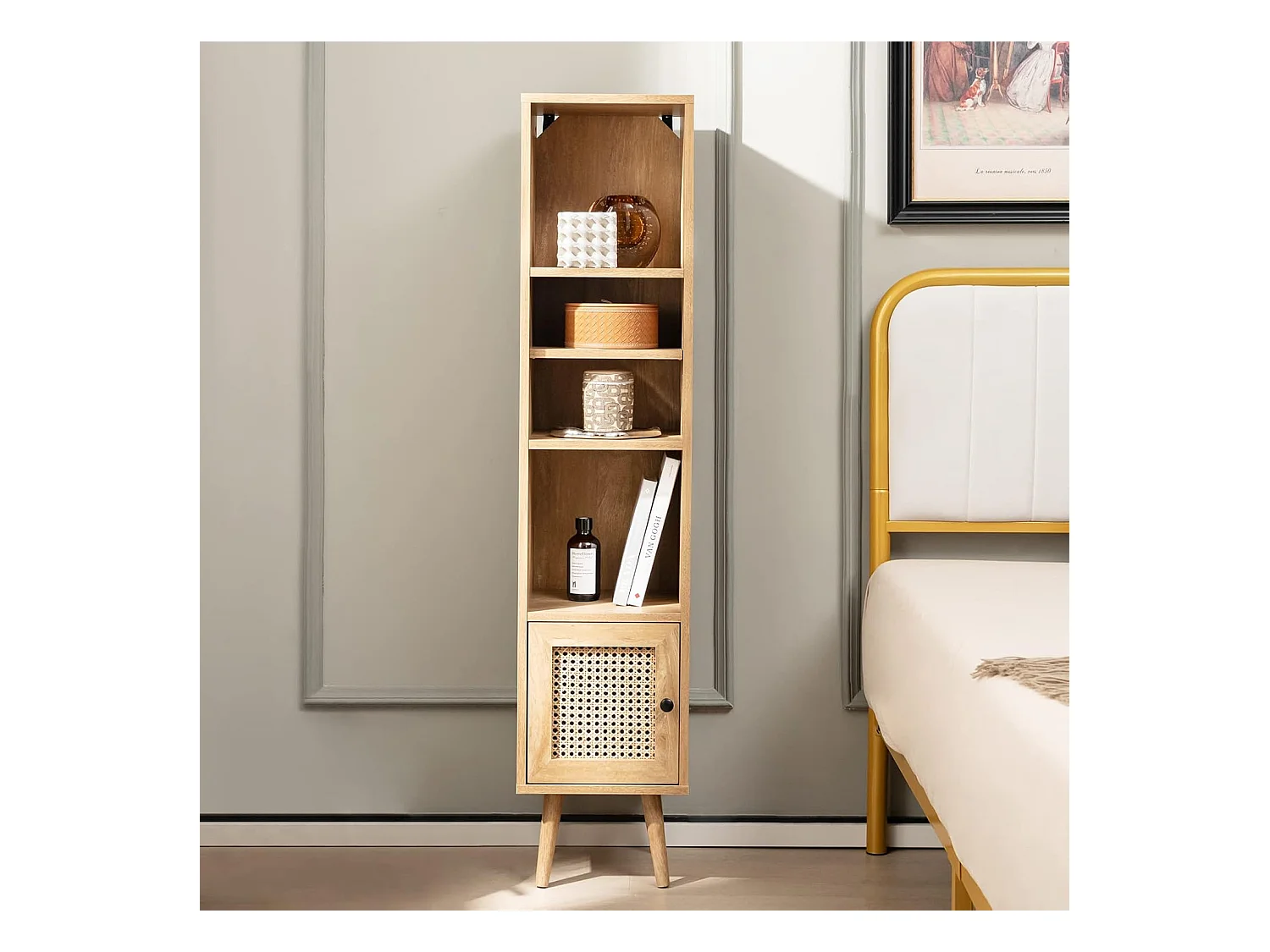 Meuble Colonne de Rangement avec Porte Rotin et Pieds en Bois Massif, Meuble de Salle de Bain Étagère Réglable, Style Bohème, pour Salon, Cuisine, Chambre, 29,5x29,5x137cm