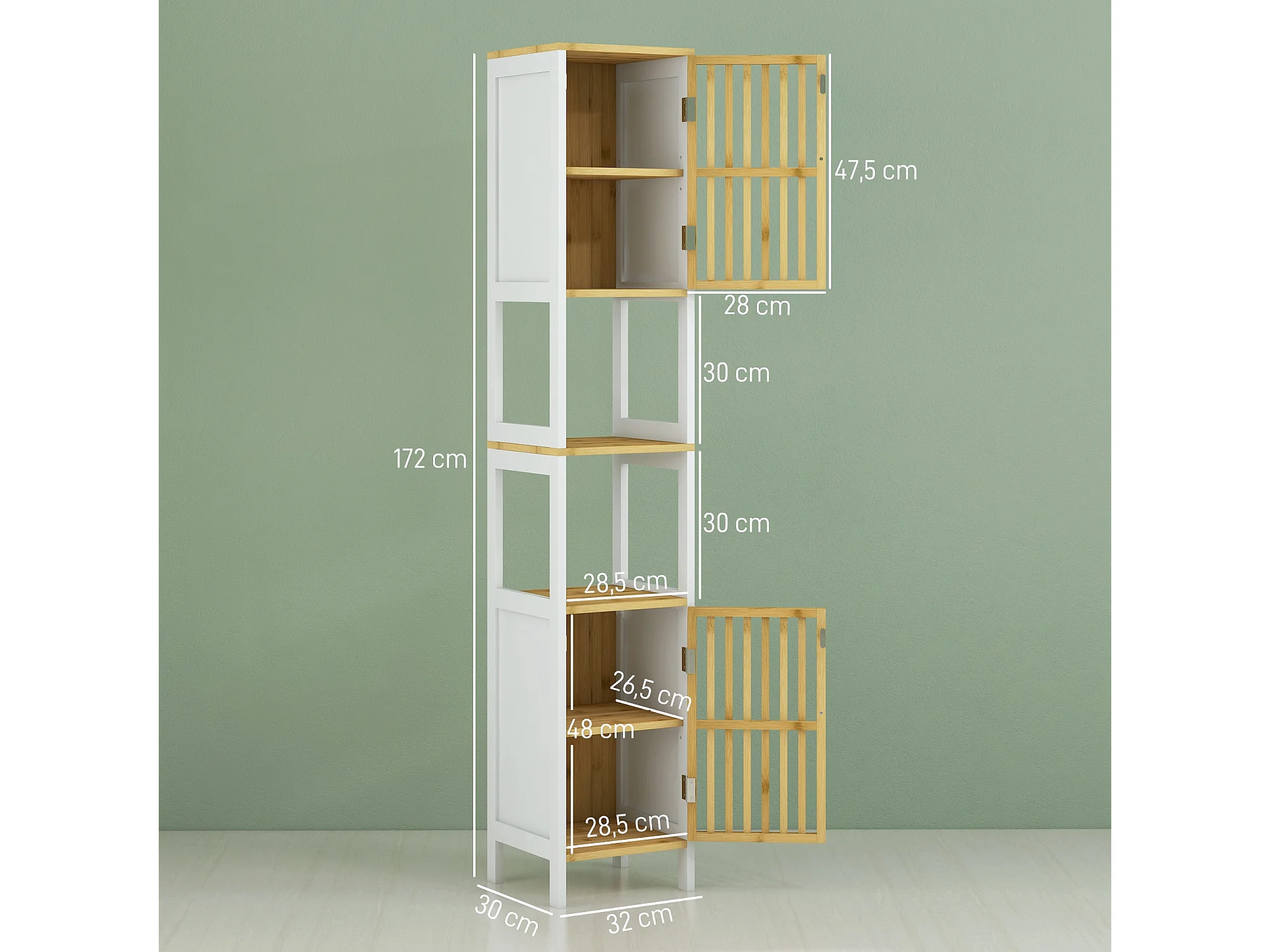 Meuble colonne salle de bain 2 portes 4 étagères MDF blanc bambou verni