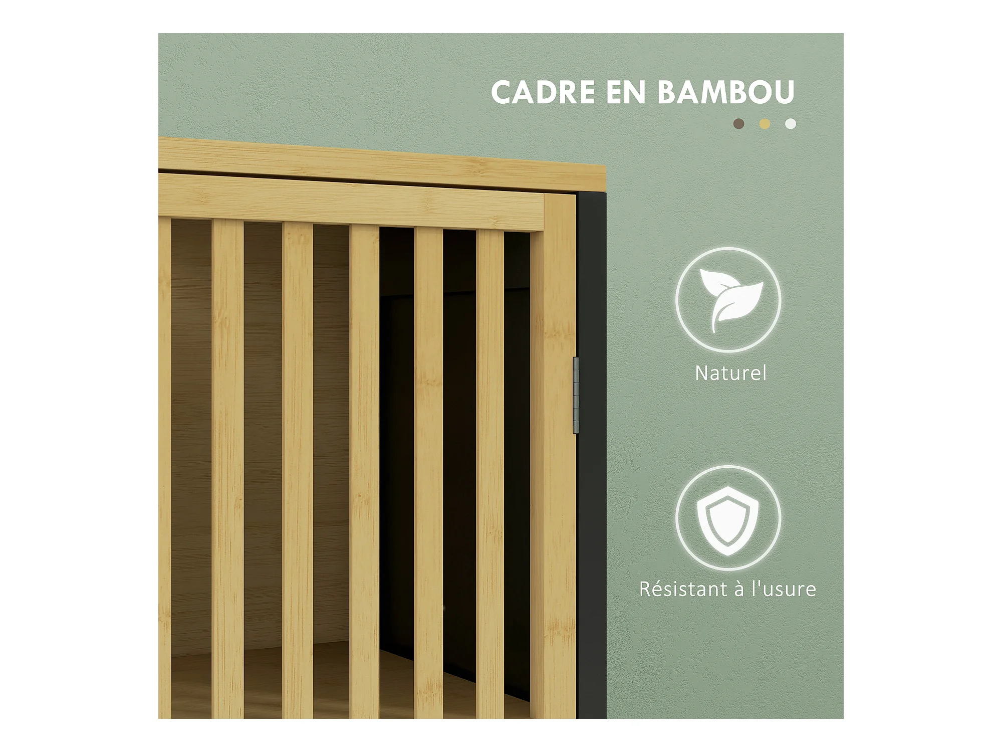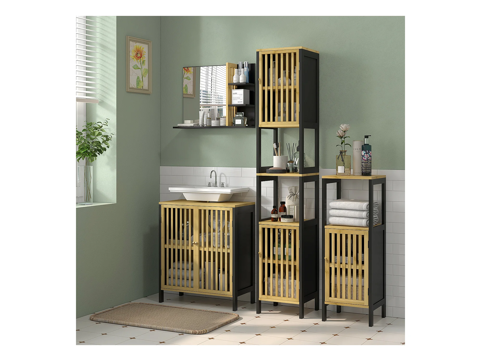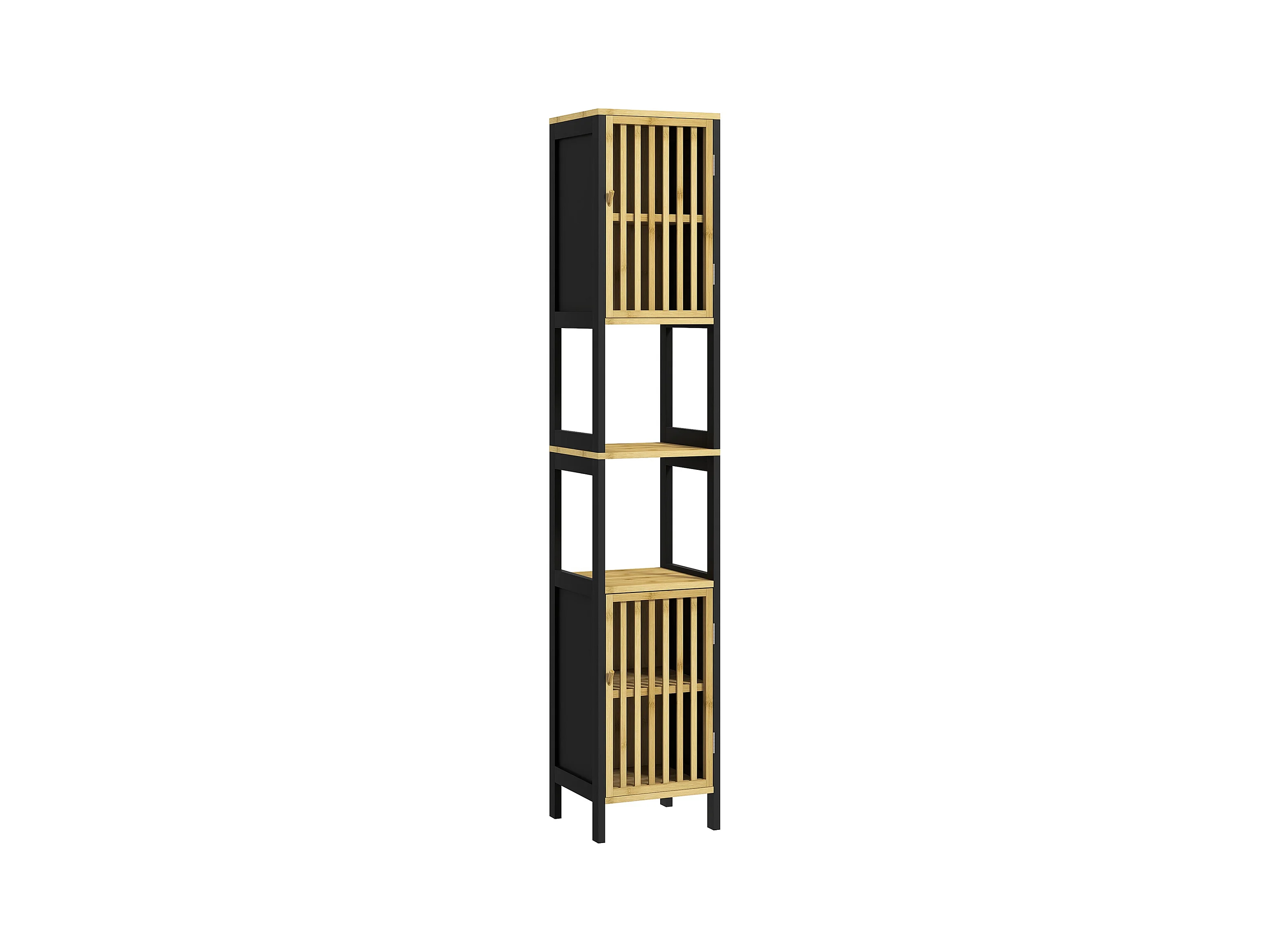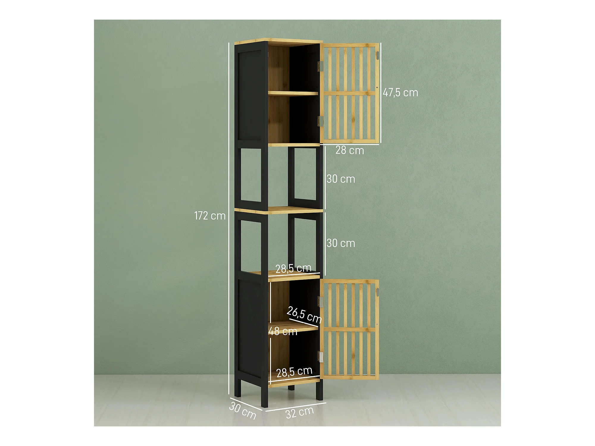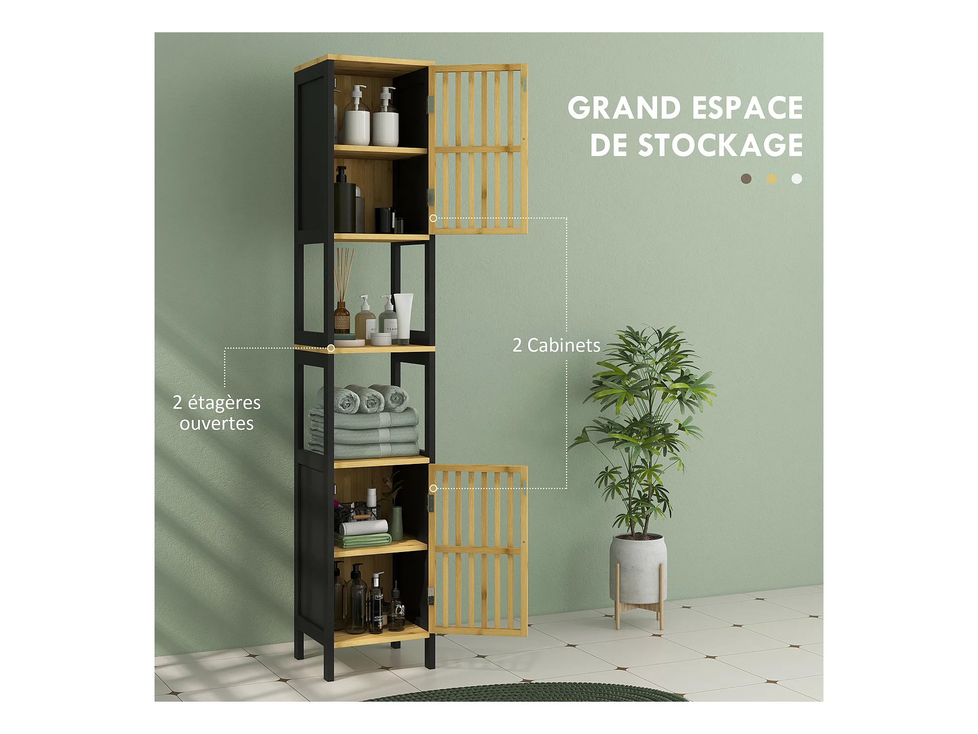Meuble colonne salle de bain 2 portes 4 étagères MDF noir bambou verni