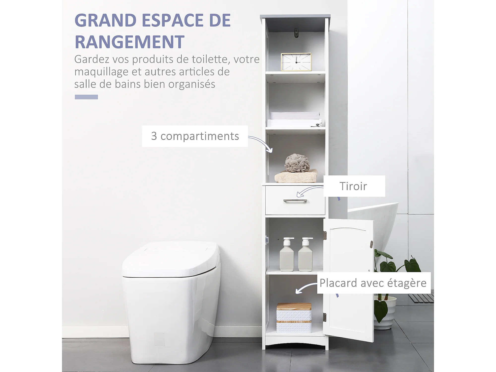 Meuble colonne salle de bain - 3 niches, placard porte étagère, tiroir - MDF blanc gris