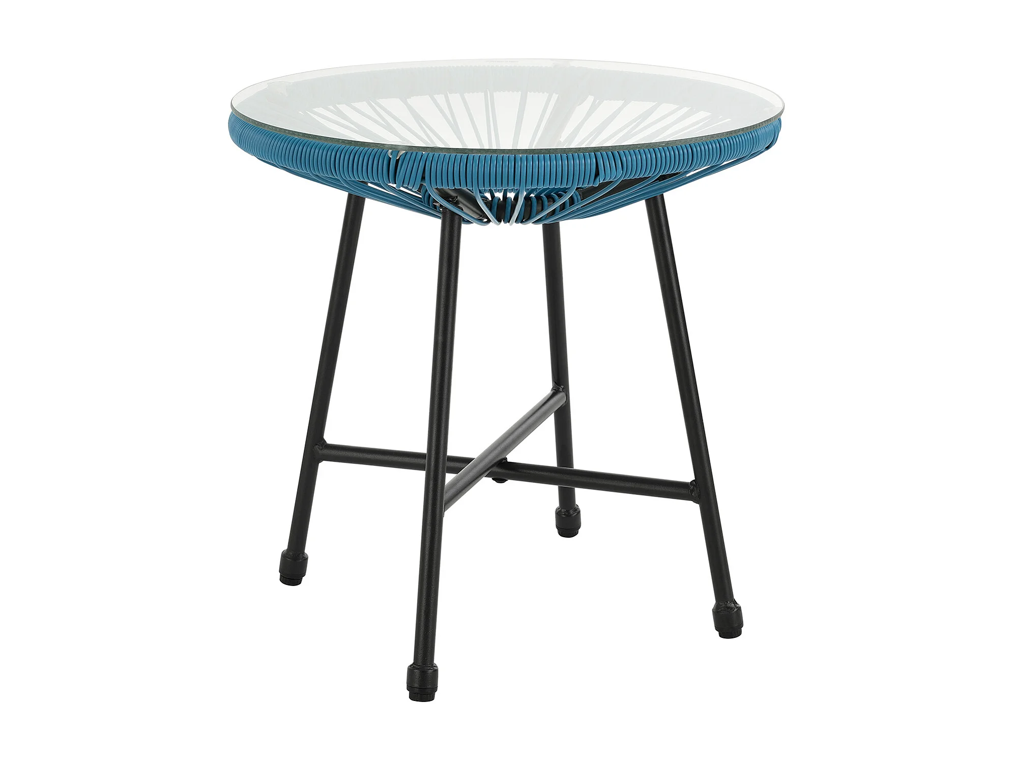Salon de jardin 3 pcs 2 places design Acapulco plateau verre trempé acier noir résine filaire bleu