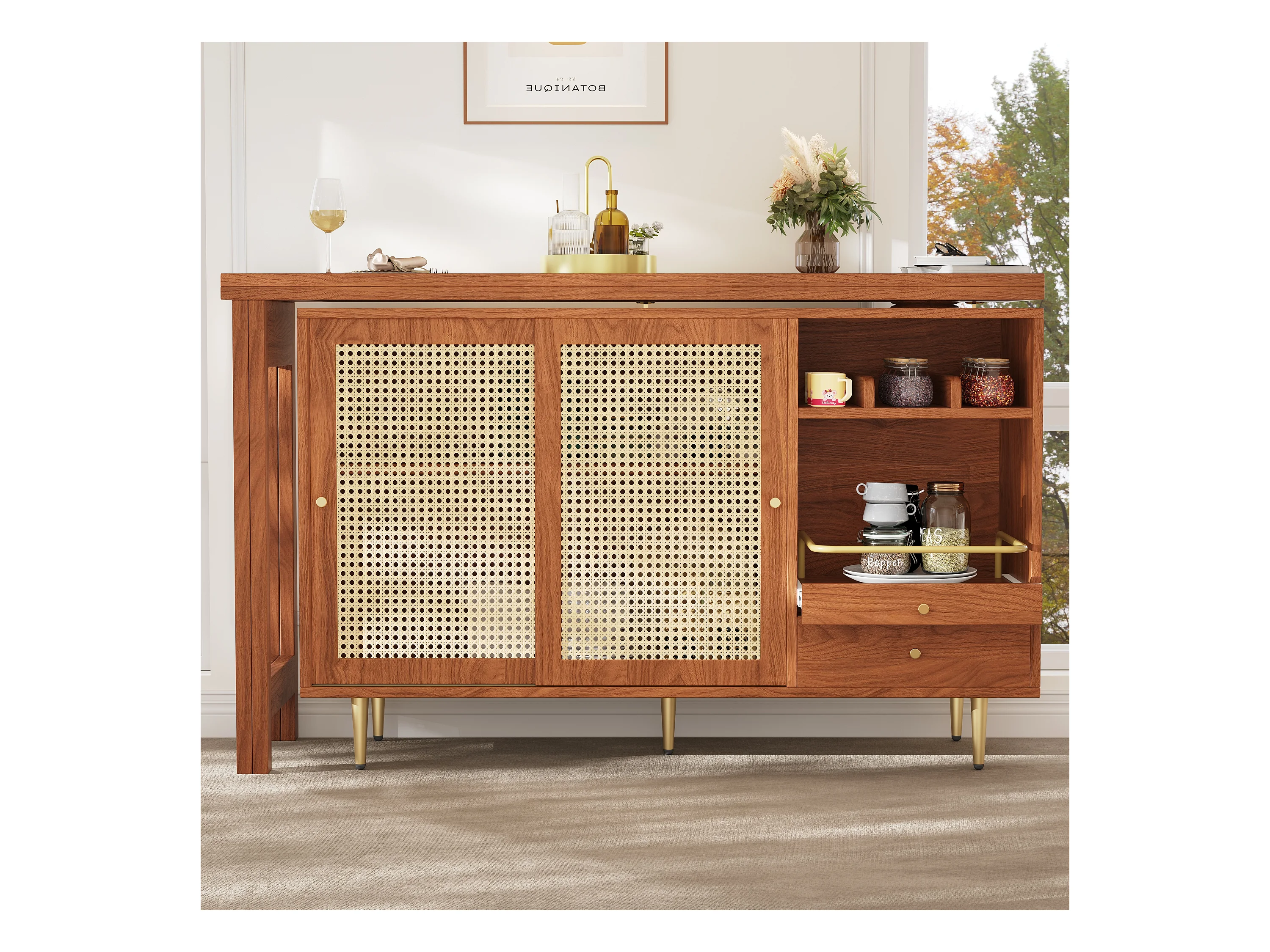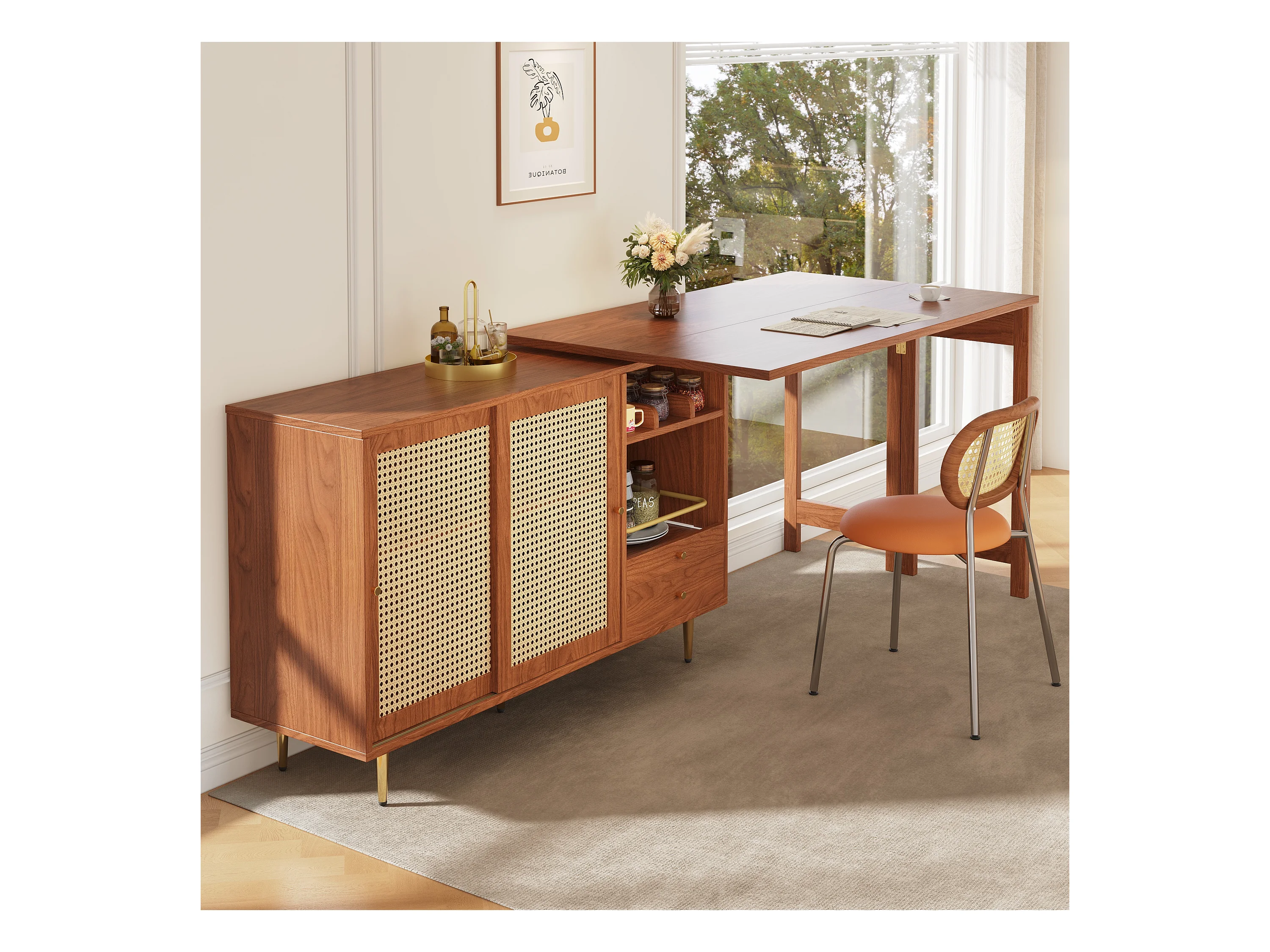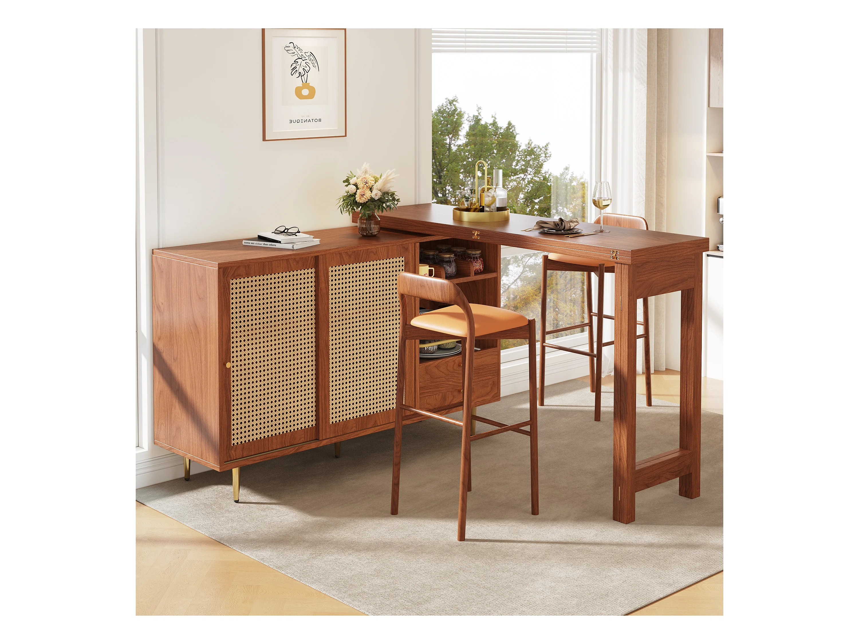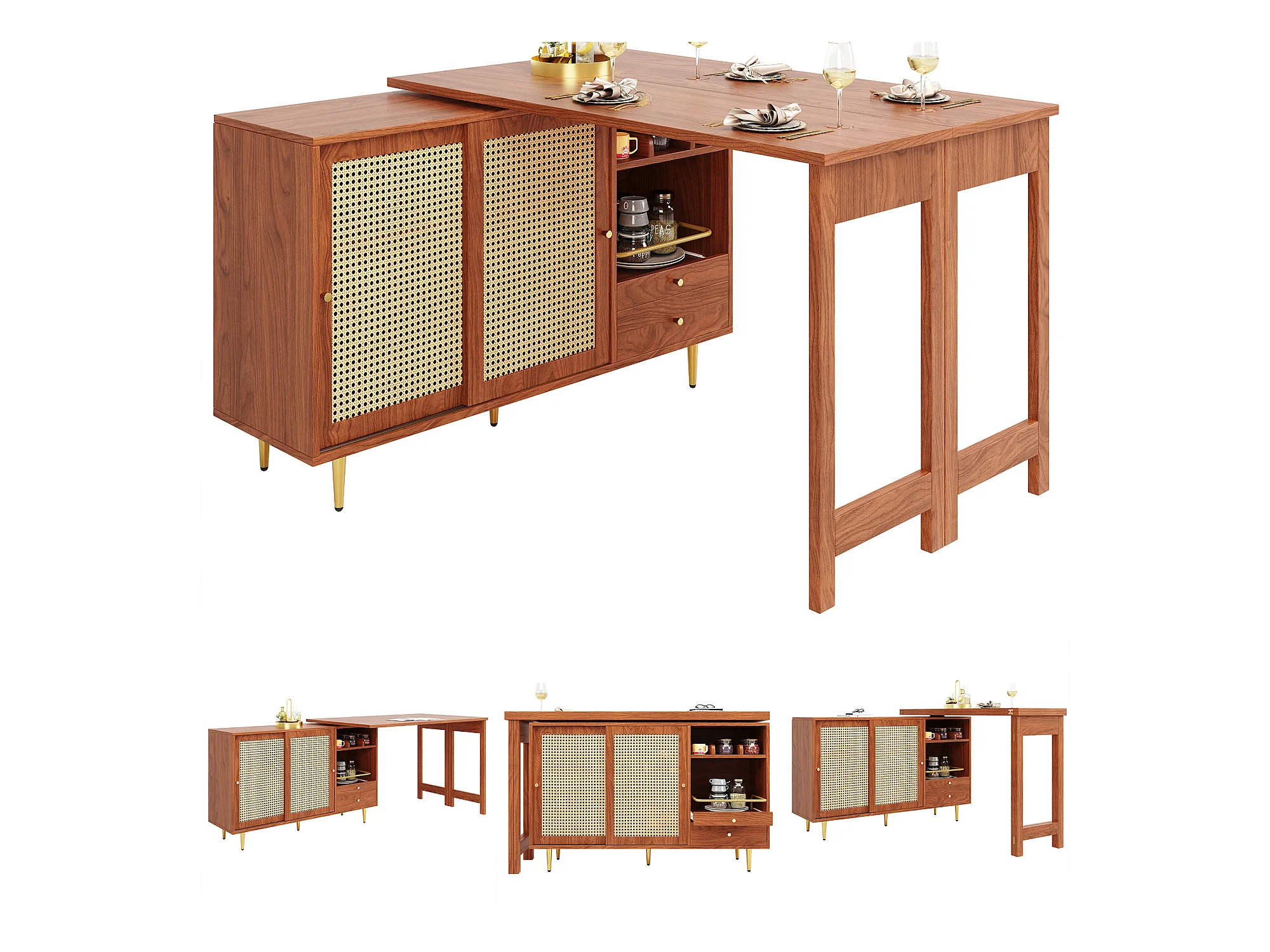 Meuble de bar pivotant - 2 portes, tiroirs et étagères de rangement - MDF et effet rotin - Marron