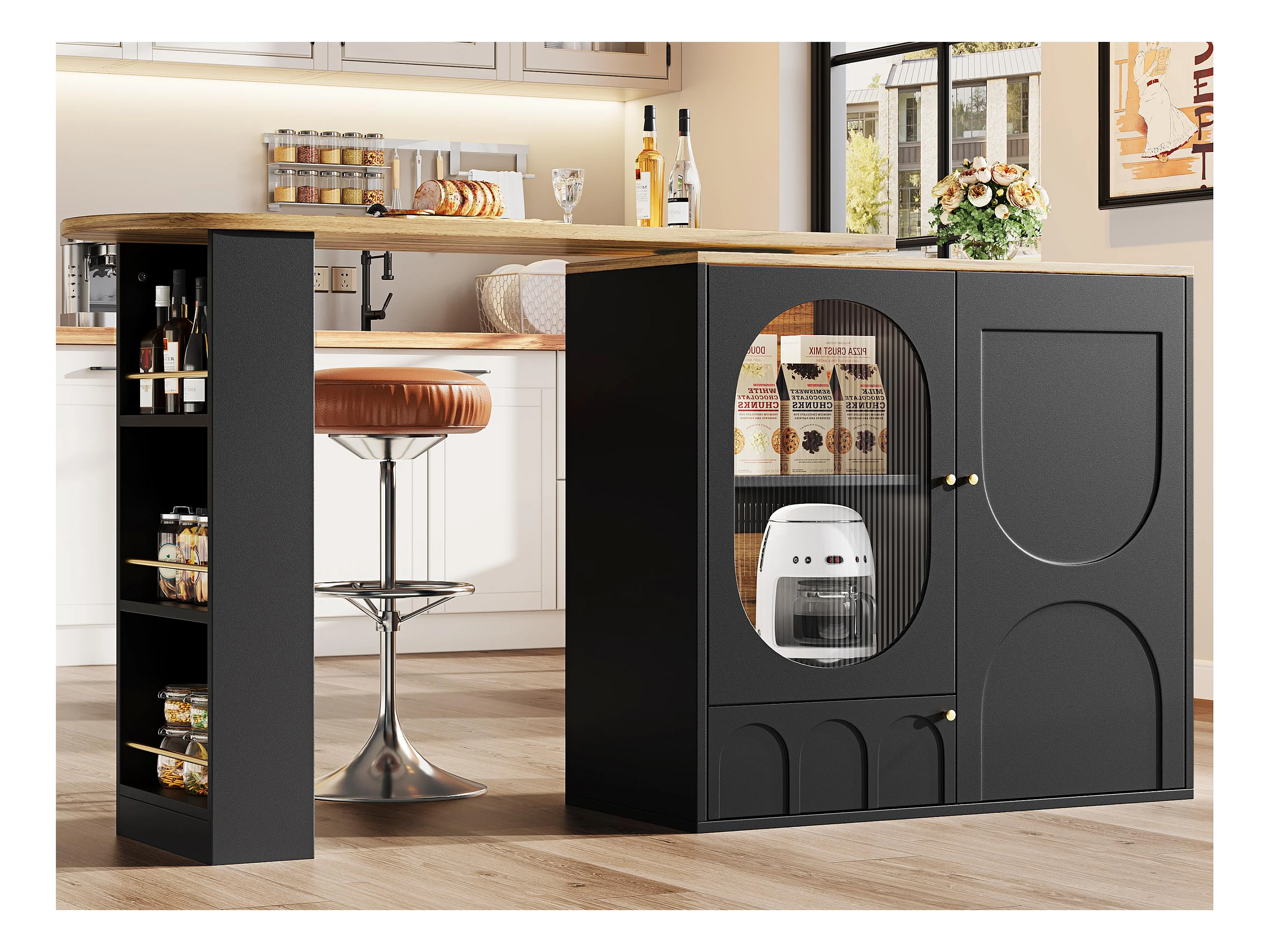 Meuble de bar pivotant 360° et escamotable - 204x39x105 cm - 3 portes - étagères ouvertes - noir