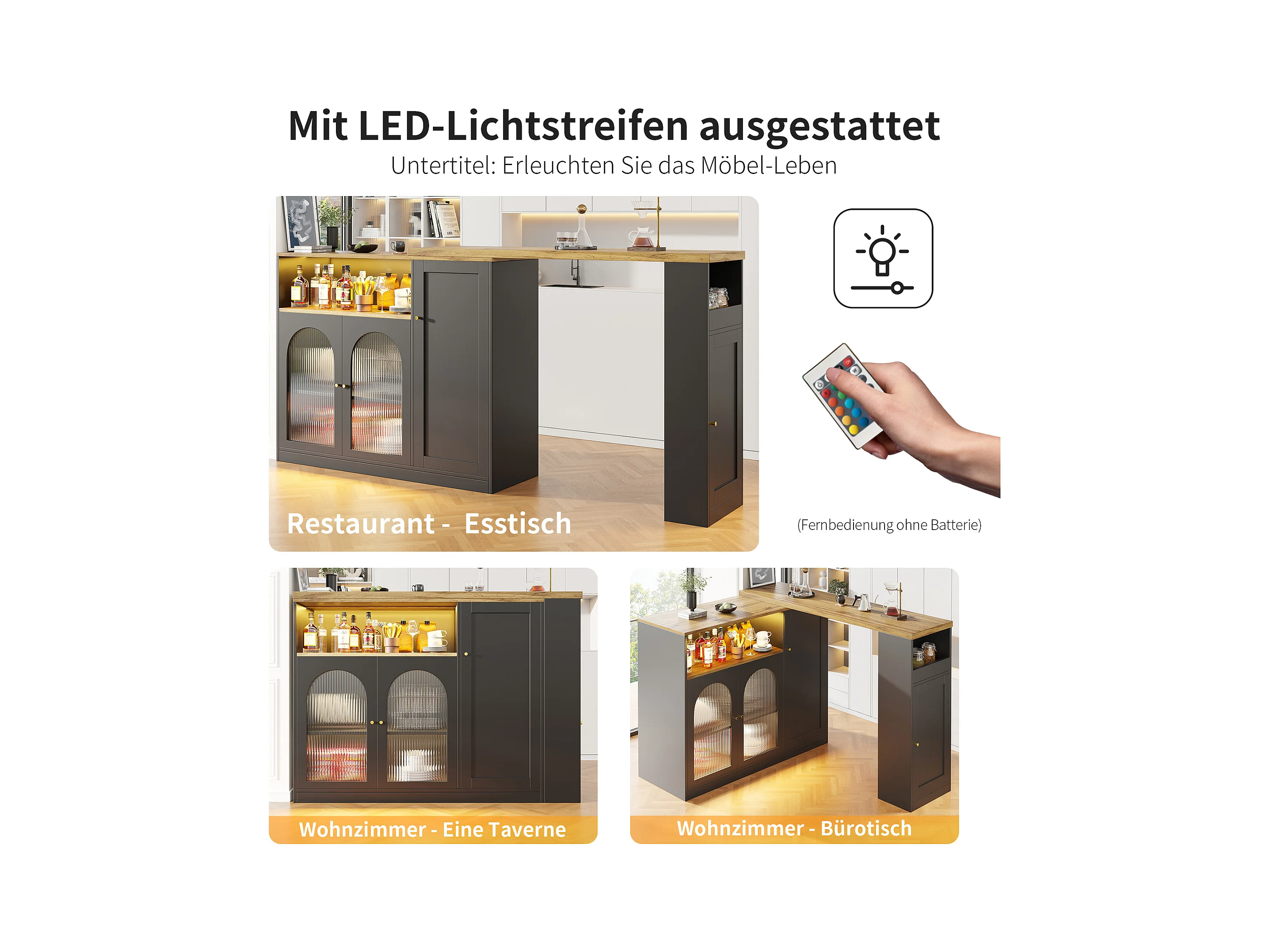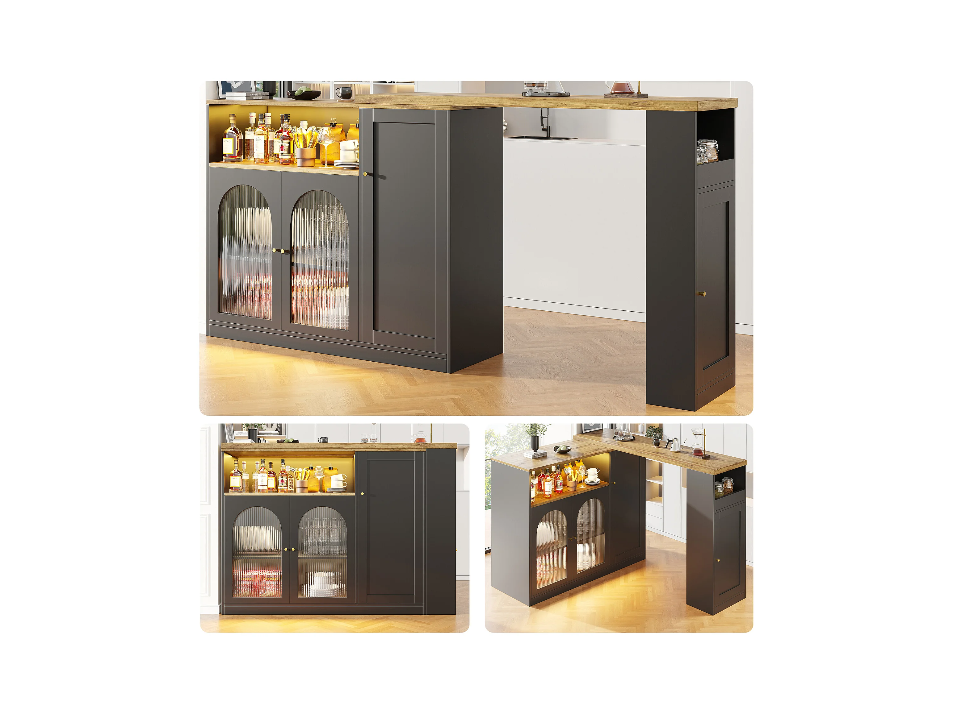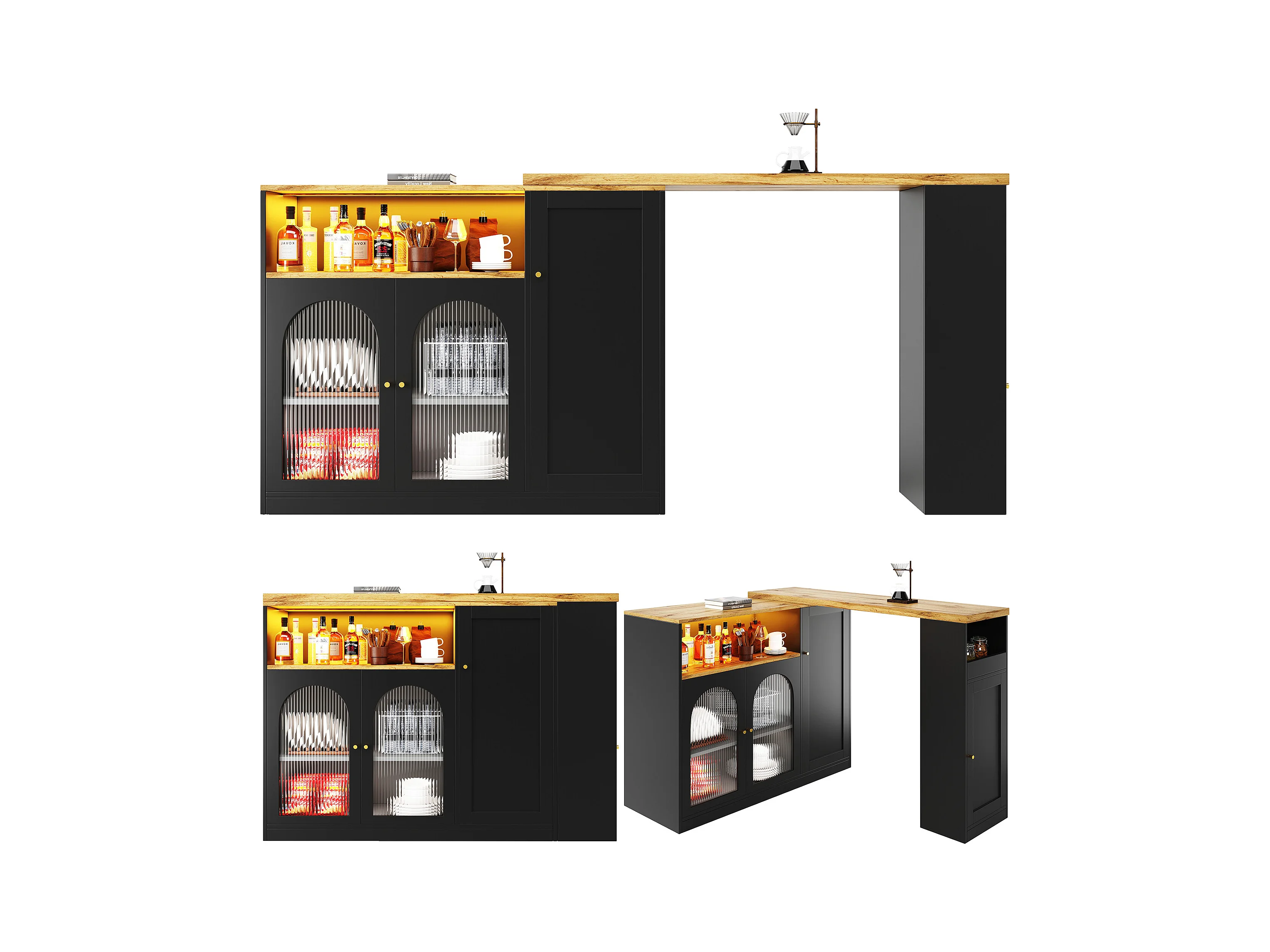 Meuble de bar pivotant - 4 portes et étagères de rangement - LEDs - Bois MDF - Noir et naturel