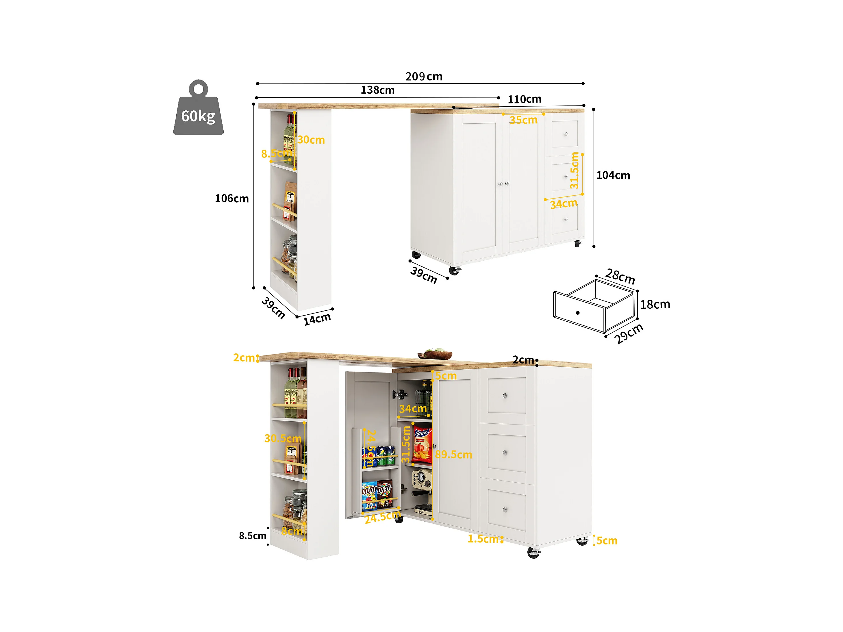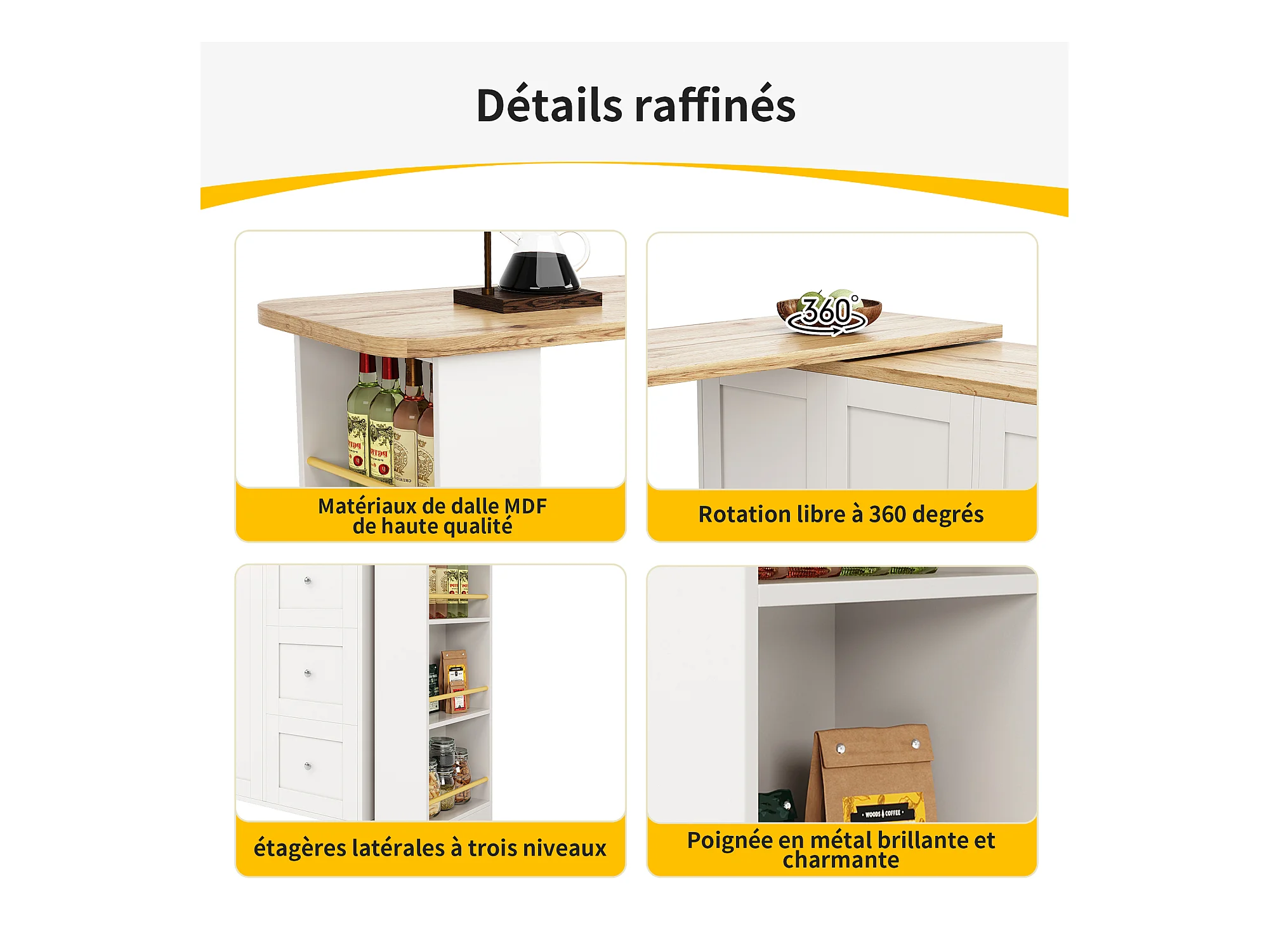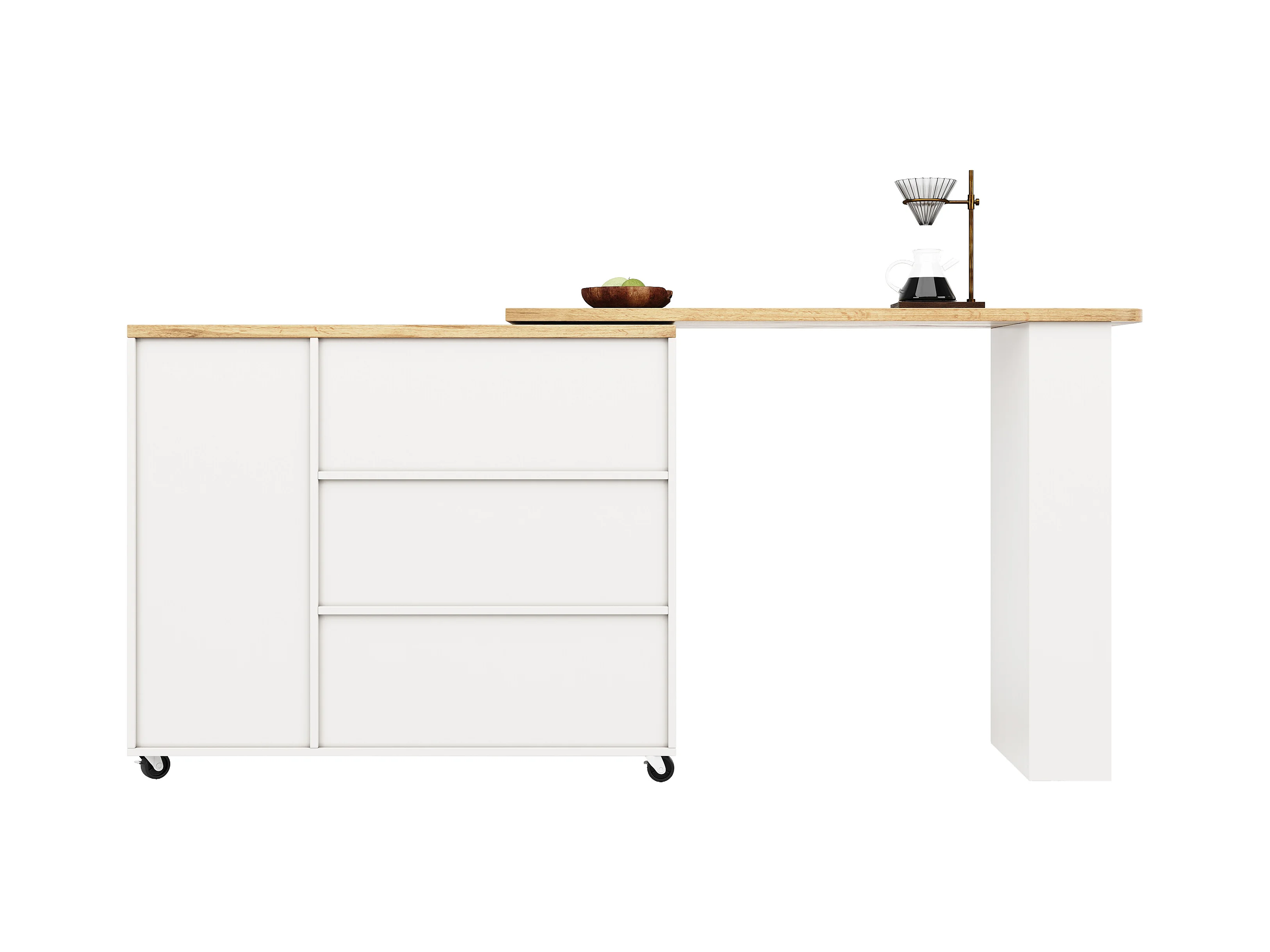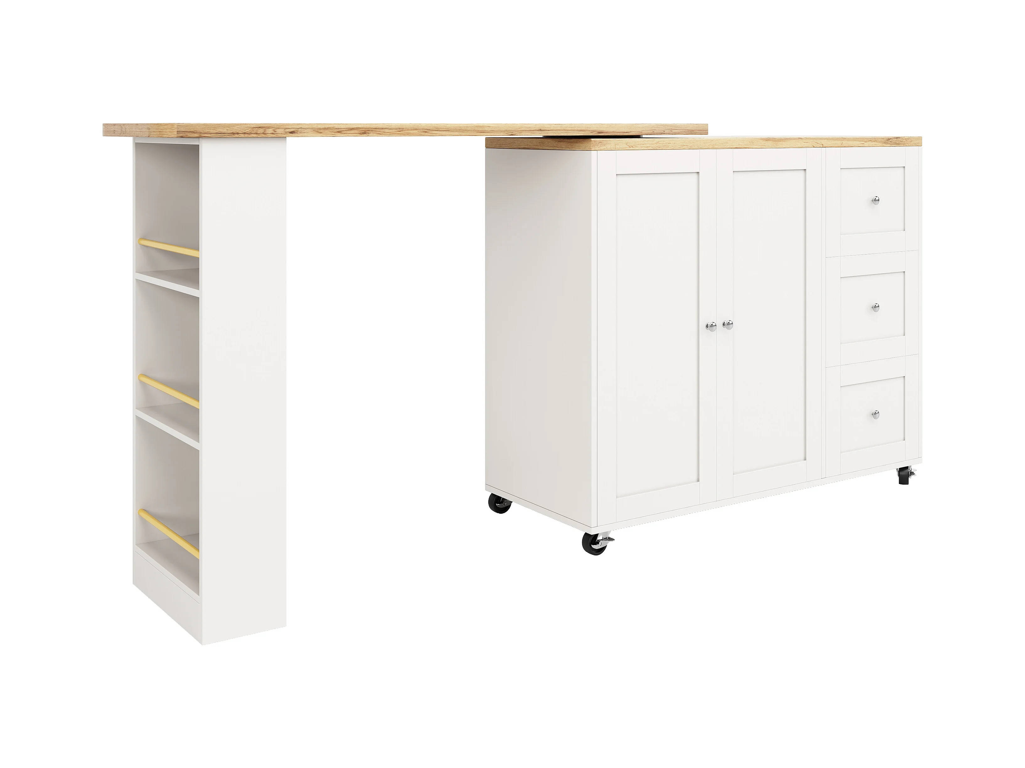 Meuble de bar pivotant sur roulettes avec 2 portes, 3 tiroirs et Étagères,plateau en placage bois naturel clair, corps blanc - 209x39x106cm