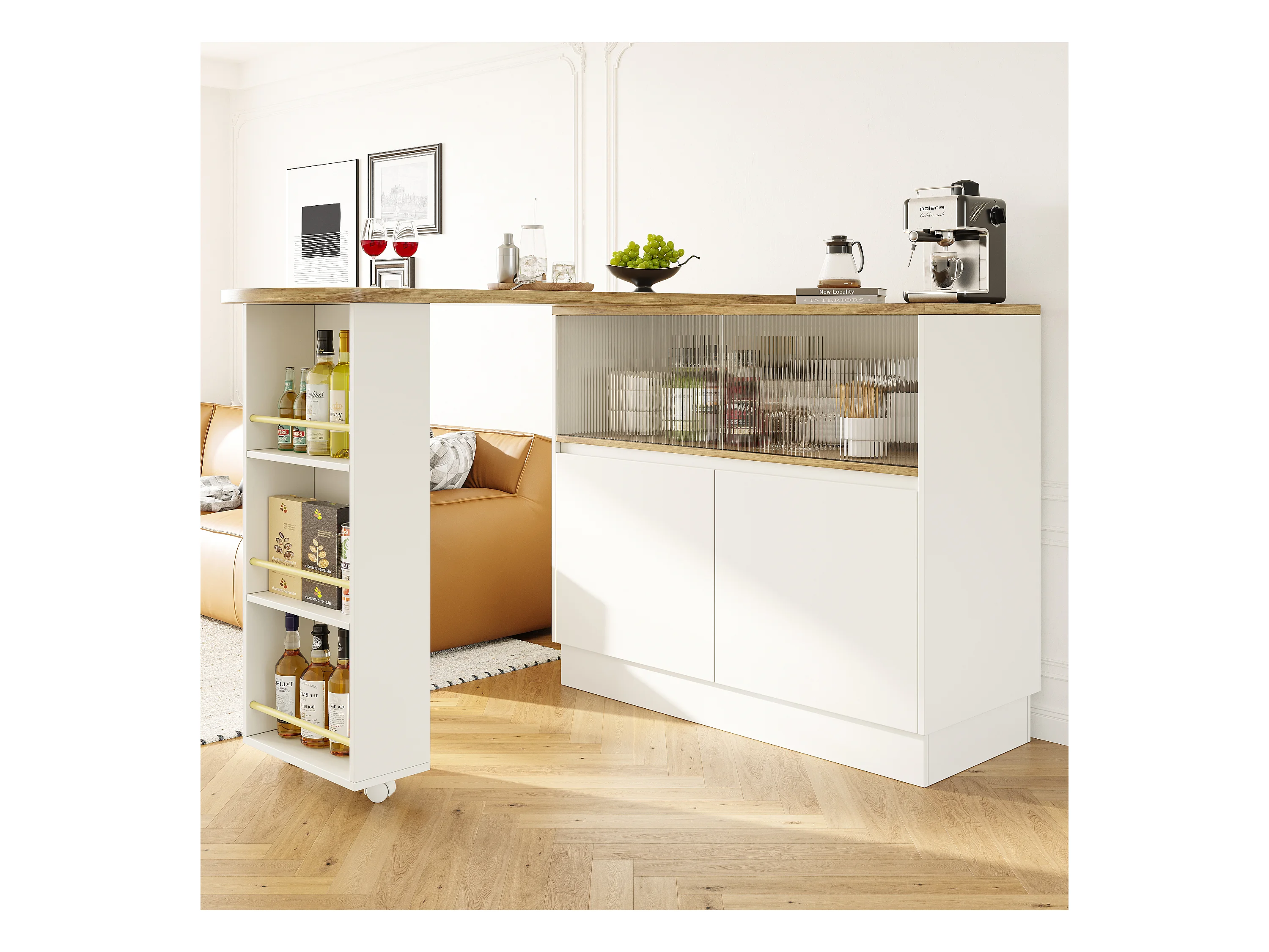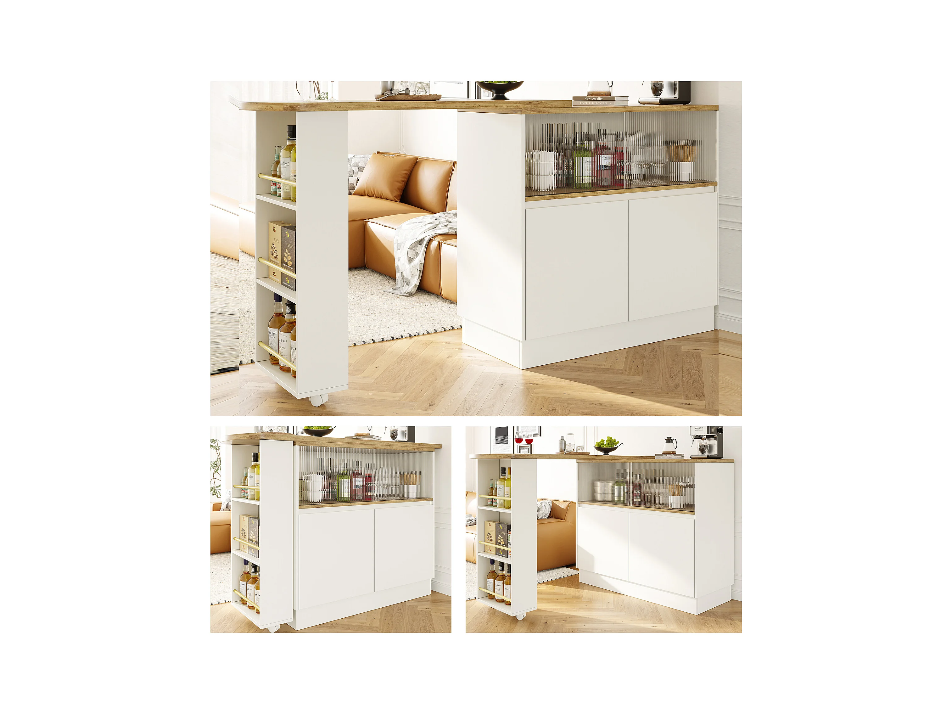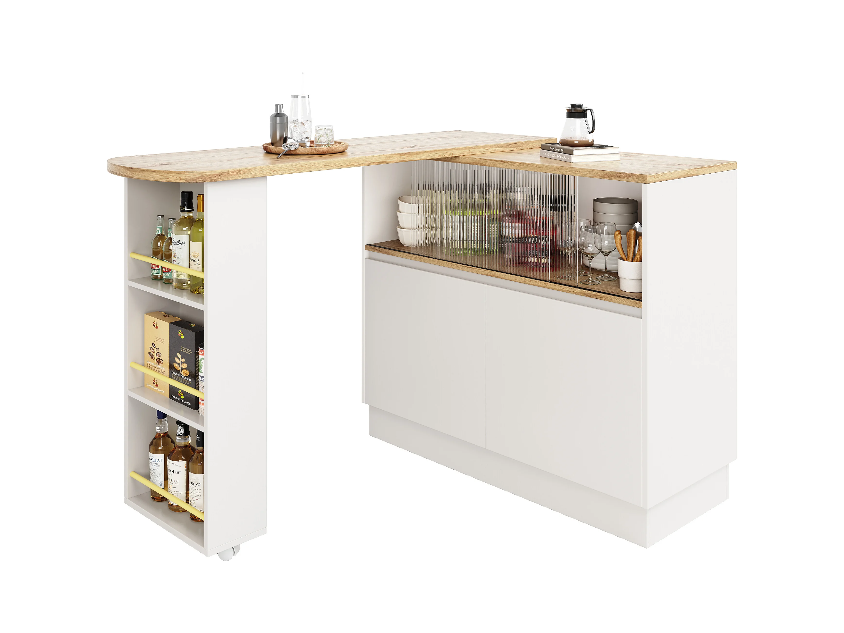 Meuble de bar rotatif - 120 x 90 x 103 cm - avec étagères et verre + 4 portes - MDF - blanc