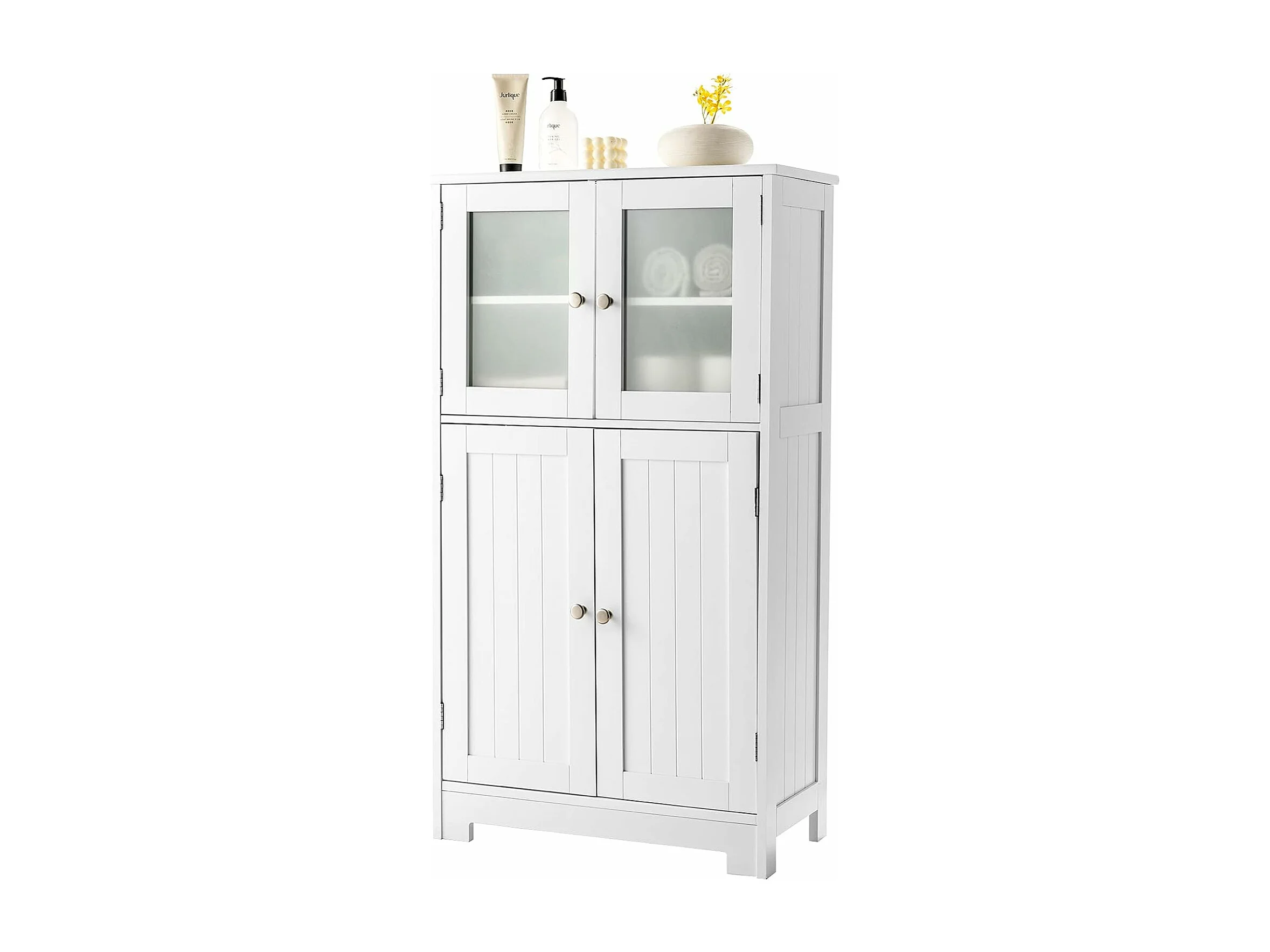 Armoire Vitrine Shabby 4 Tiroirs et 2 portes en Bois Blanc Beige Gris