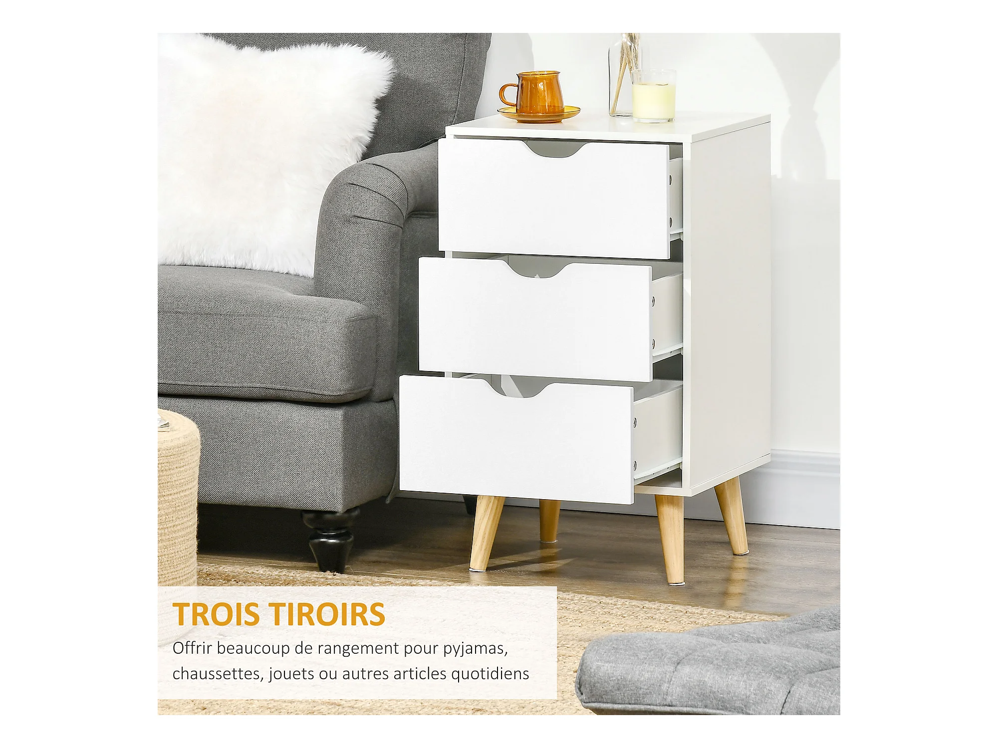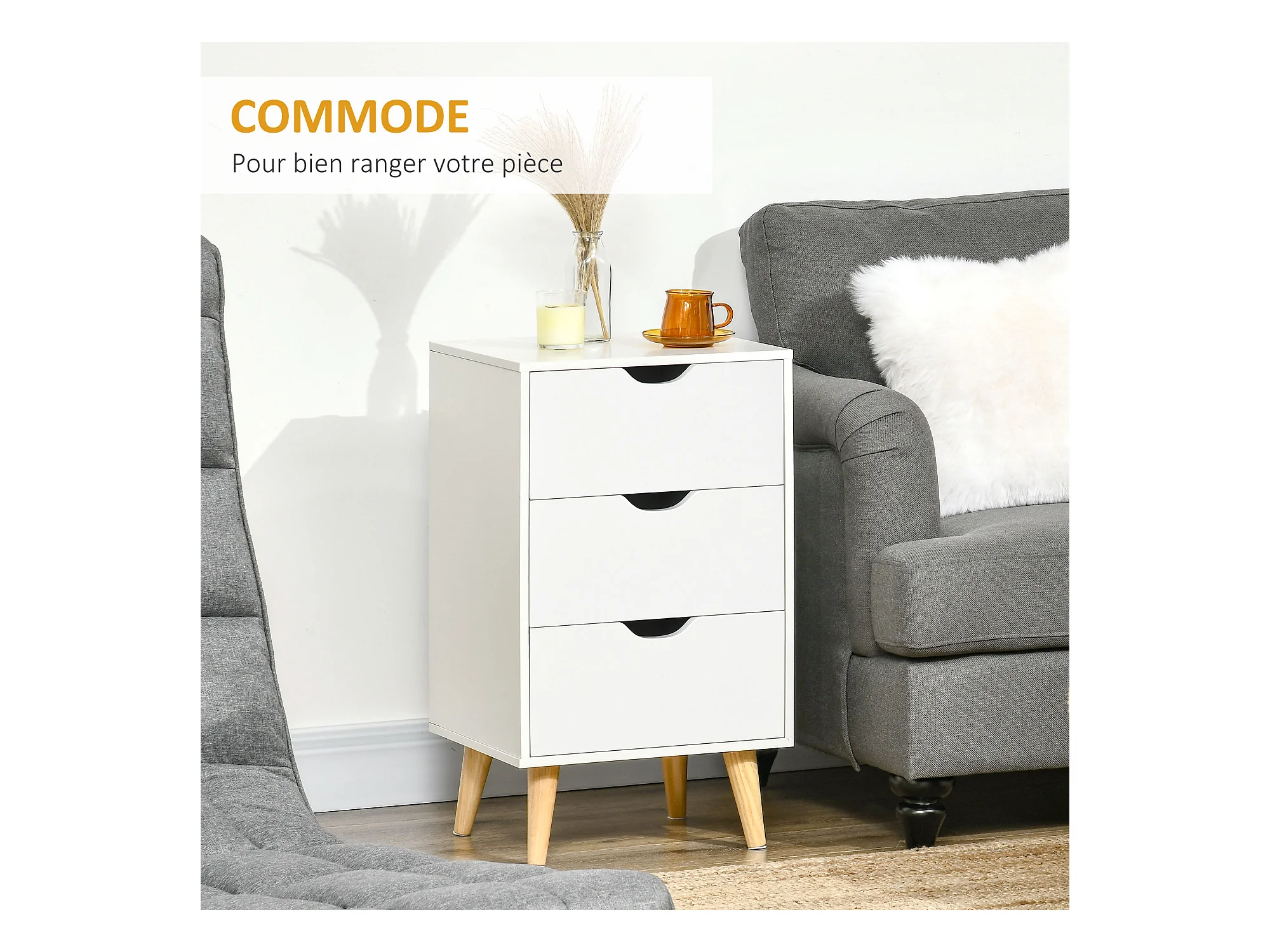 Meuble de rangement chiffonnier 3 tiroirs design scandinave piètement effilé incliné bois pin panneaux blanc